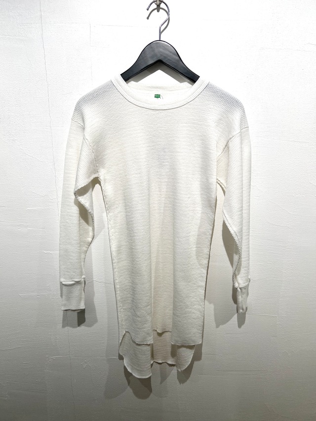 80's Hanes honeycomb thermal 80年代のHanesコットンサーマル。 ミリタリーに多く見られるハニカム編みで、しっかりした長めのリブが可愛い定番のカットソーになります。 前が長さが違うロング丈でニットやベストなどのレイヤードにも便利なアイテム。 なかなか前後長さの違う物は出会わなくなってきたので、シャツのレイヤード以外をお探しの方やもうお待ちの方もストックとしておすすめです。 Quality:cotton 50%,polyester 50% machine wash warm Color:white Size:L Shoulder 48cm,Bust 41cm,Length 78.5cm,Sleeve 52cm Condition:Vintage ≪注意事項≫ 当店ではused、vintageを取り扱いしております。古着という特性上コンディションは様々です。ダメージや汚れなどがある場合もございます。ひとつひとつの商品が持つストーリーやコンディシにご理解の上お買い求めください。 お客様のPC環境の違いにより、実際の色合いとは異なって見える場合があります。あらかじめご了承ください。 ≪返品・交換について≫ ご注文後のキャンセル、サイズやイメージ違い等の返品はお受けしておりません。気になる点がございましたらご購入前にお気軽にご質問下さい。