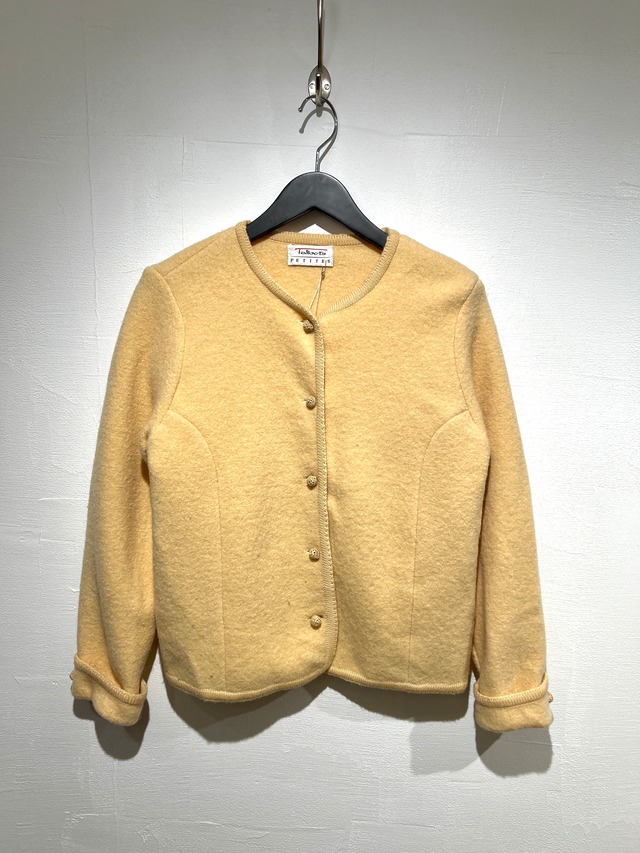 boiled wool jacket 圧縮されたボイルドウールを使用したノーカラーのジャケット。 優しいクリームイエローの色合いが冬のコーディネイトの差し色になるカラー。 ニットカーディガンとニットジャケットの中間くらいのアイテムでコートの中にも着やすい羽織りになります。 Quality: 表記なし。ウールの風合い。 Color: yellow-beige Size: ー Shoulder 39cm,Bust 49cm,Length 54.5cm,Sleeve 58cm Model : 158cm Condition:Vintage ≪注意事項≫ 当店ではused、vintageを取り扱いしております。古着という特性上コンディションは様々です。ダメージや汚れなどがある場合もございます。ひとつひとつの商品が持つストーリーやコンディシにご理解の上お買い求めください。 お客様のPC環境の違いにより、実際の色合いとは異なって見える場合があります。あらかじめご了承ください。 ≪返品・交換について≫ ご注文後のキャンセル、サイズやイメージ違い等の返品はお受けしておりません。気になる点がございましたらご購入前にお気軽にご質問下さい。