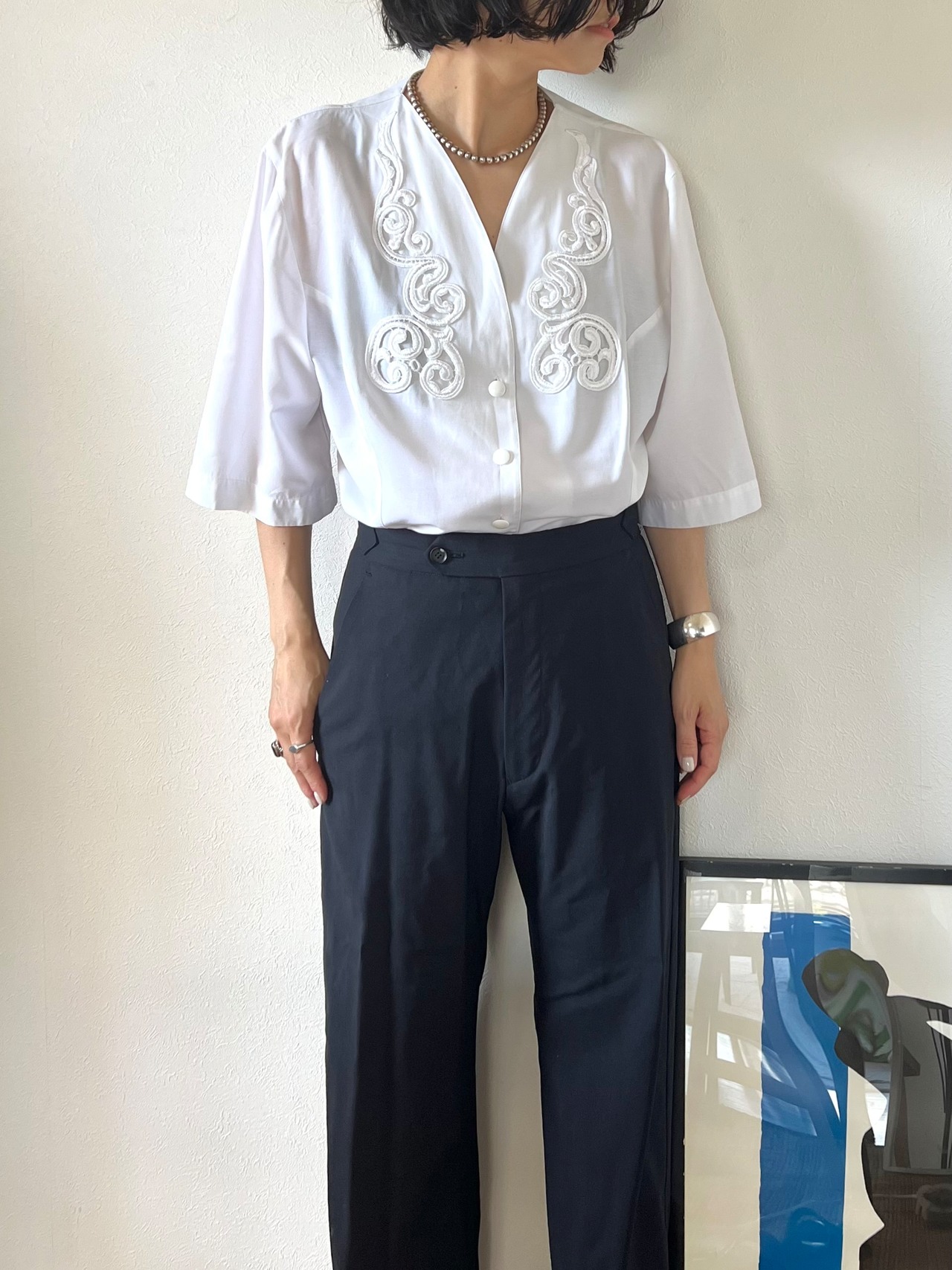 カラーレスのすっきりとしたデコルテに刺繍のワッペンがほどこされたユーロヴィンテージのブラウス。