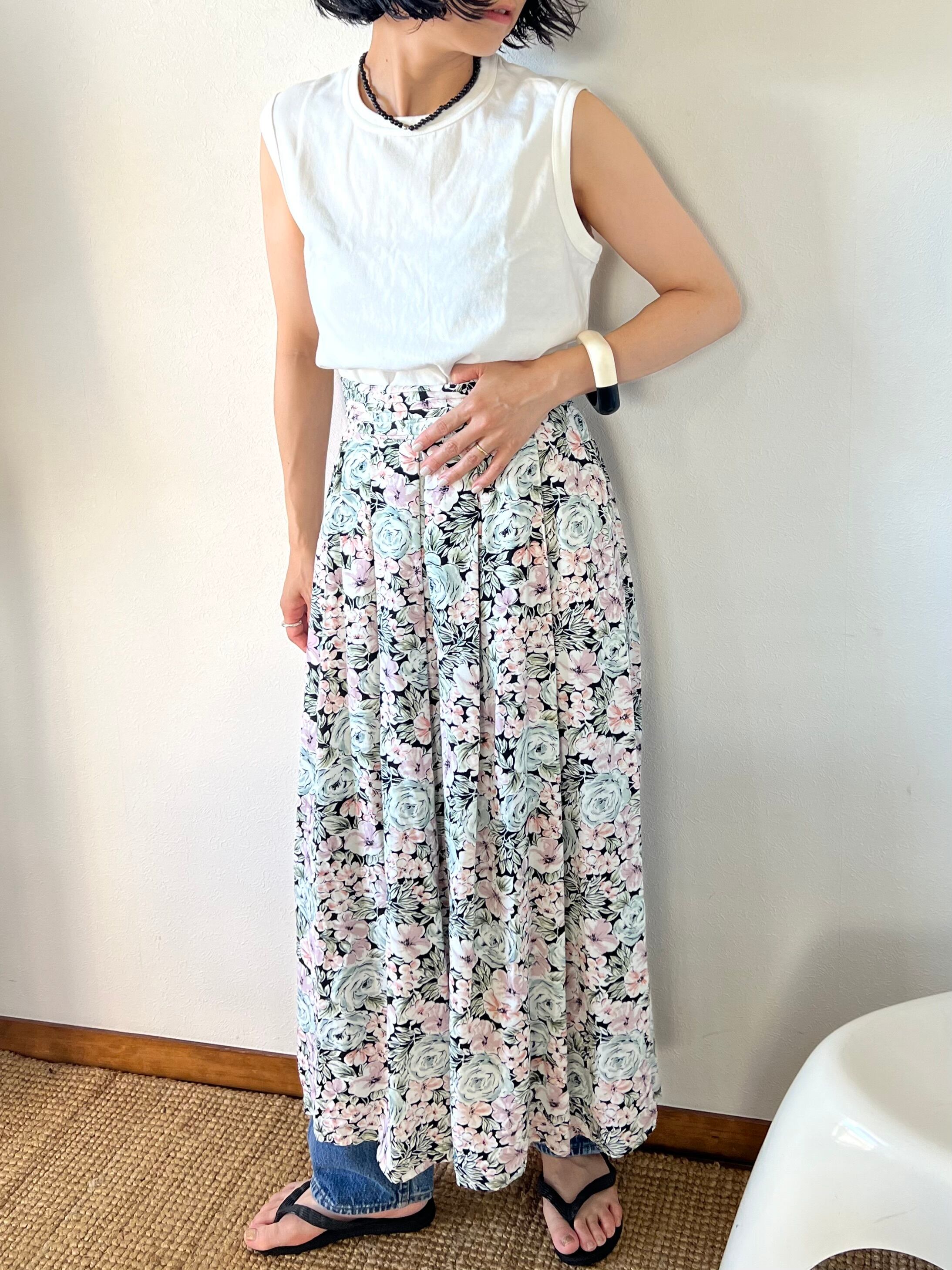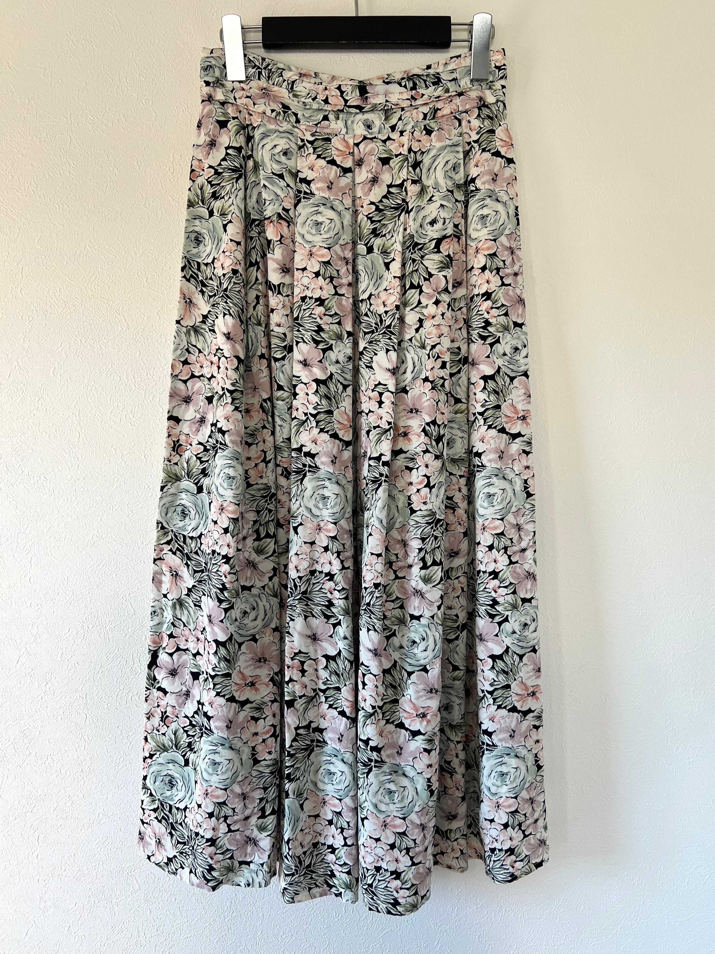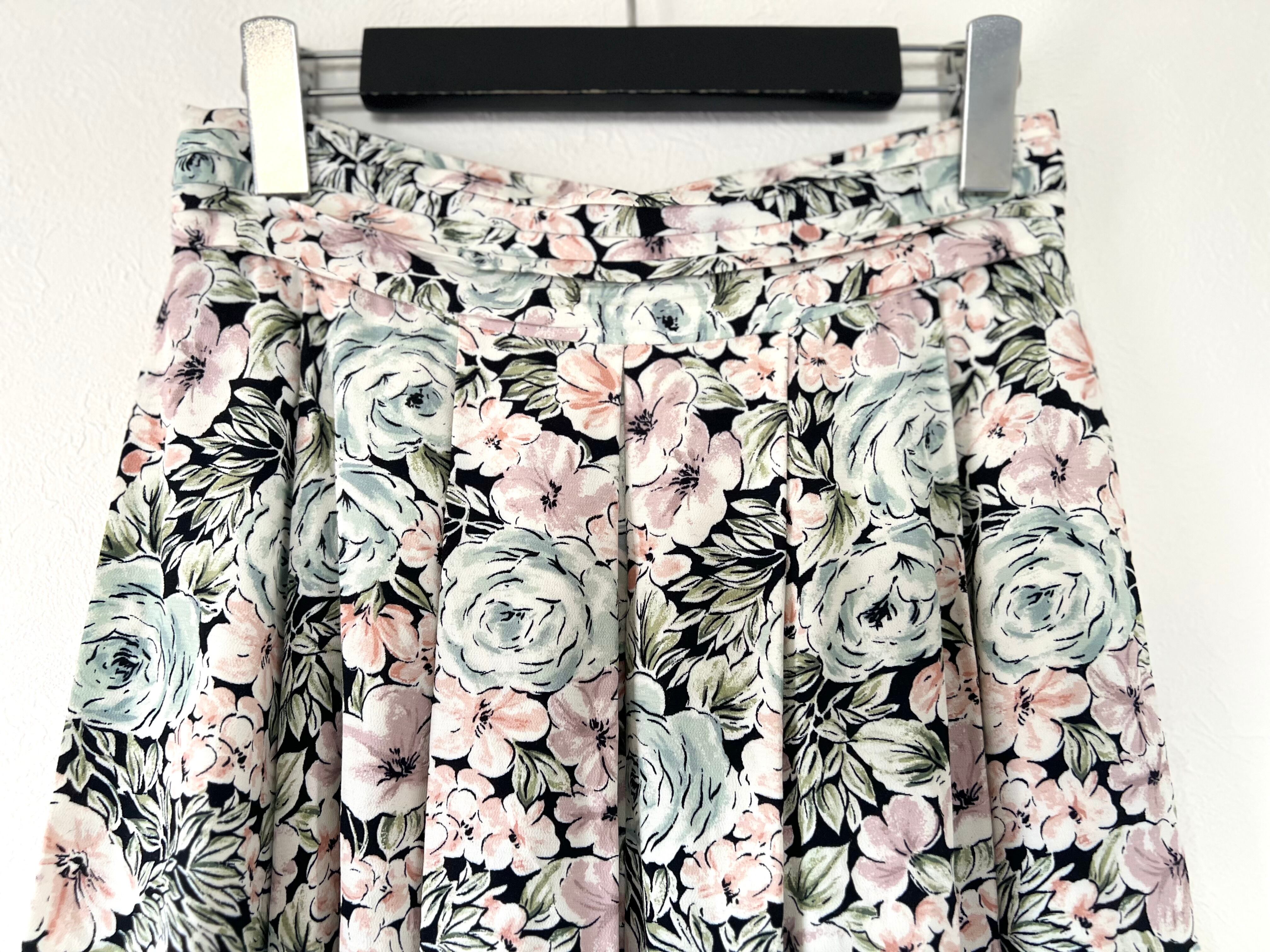 ブラックベースに水彩画のような綺麗な花柄のプリントで全体的にギャザーの入ったフレアシルエット。両サイドにポケットも付いています。