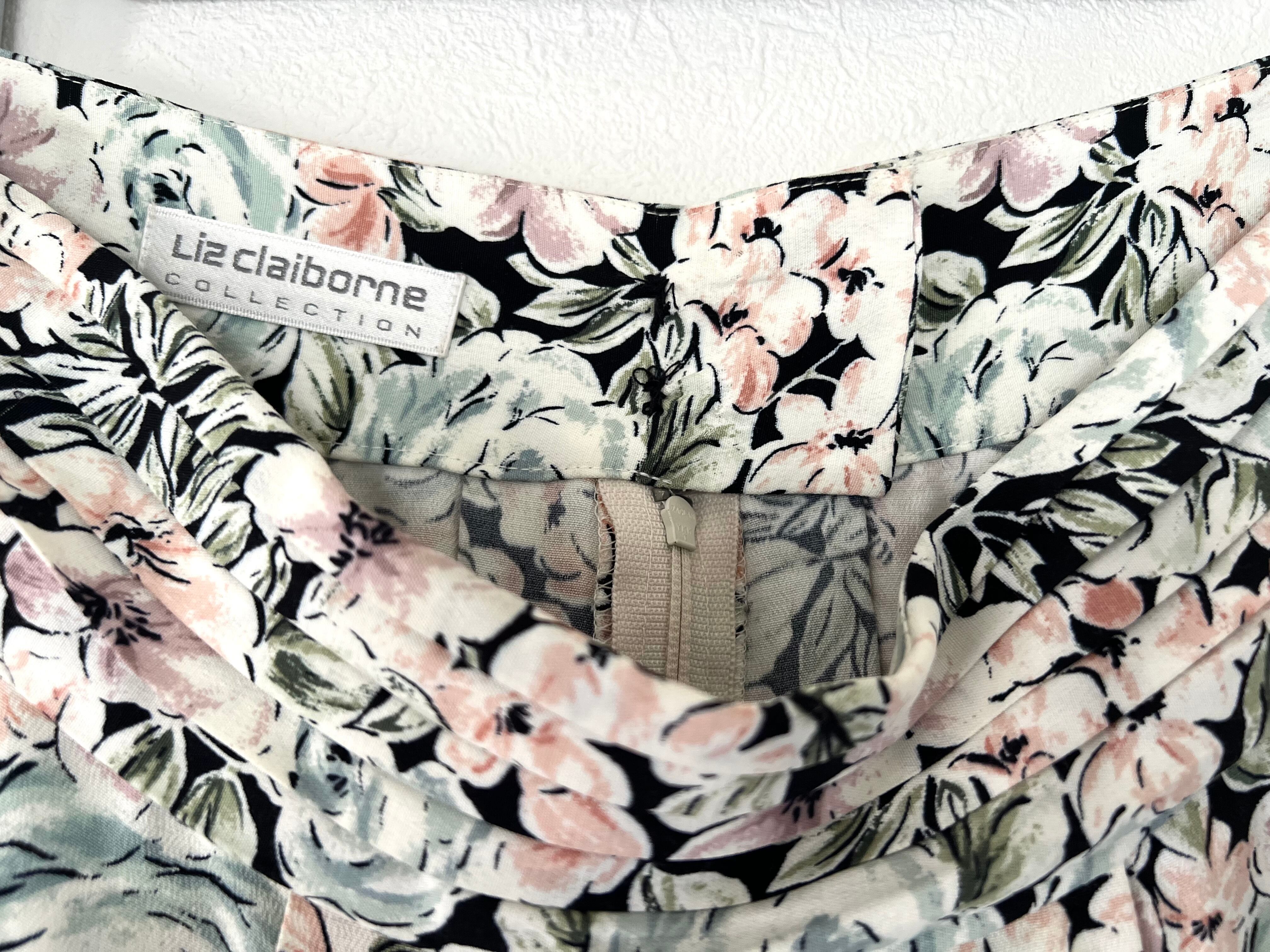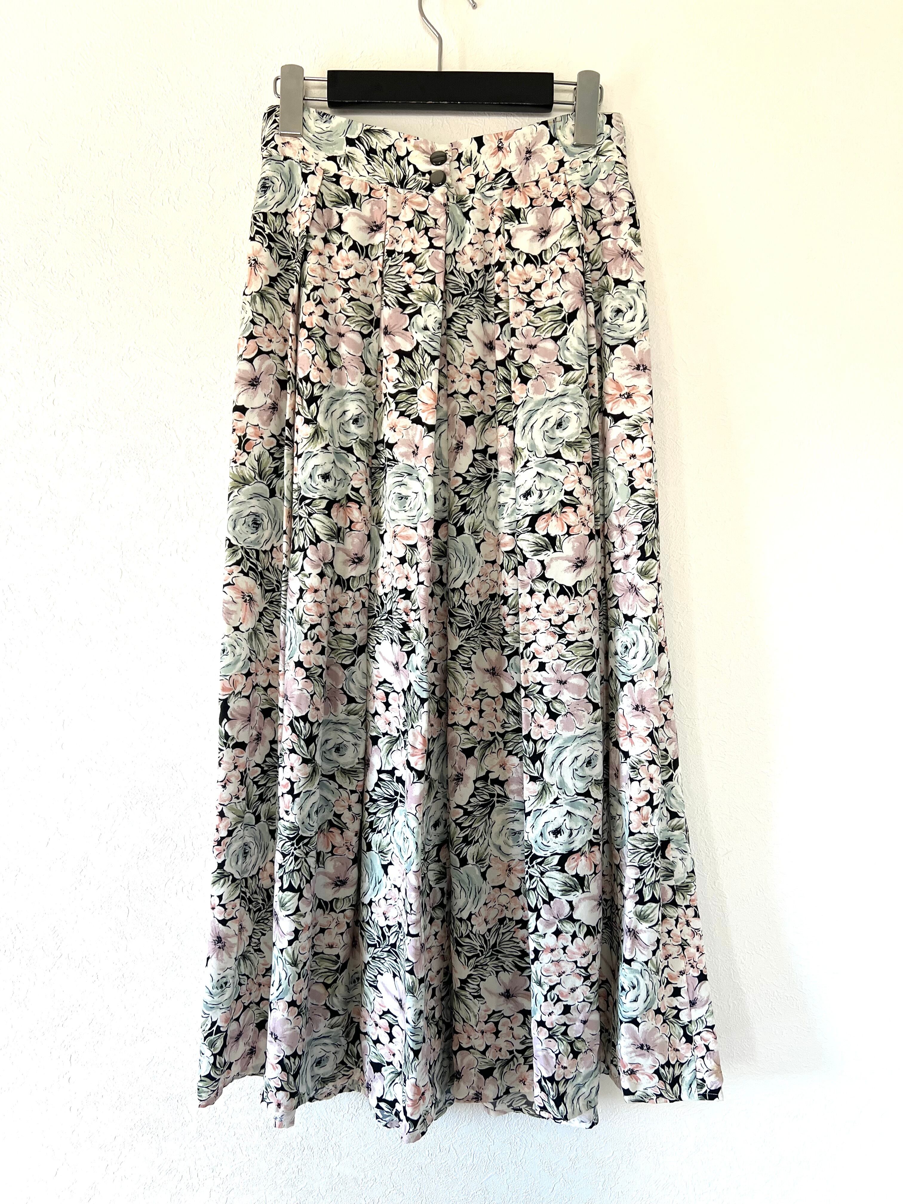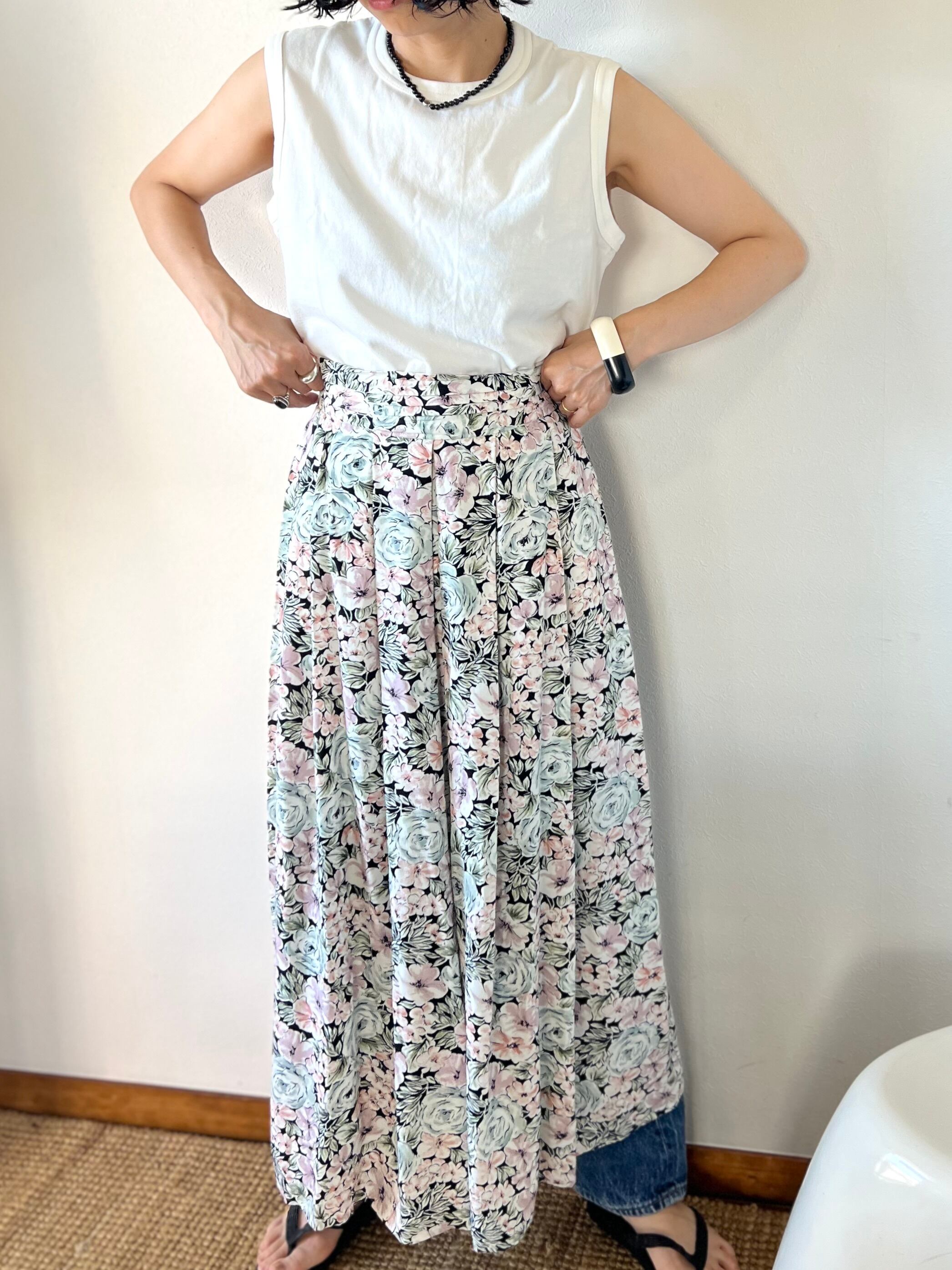 ブラックベースに水彩画のような綺麗な花柄のプリントで全体的にギャザーの入ったフレアシルエット。両サイドにポケットも付いています。