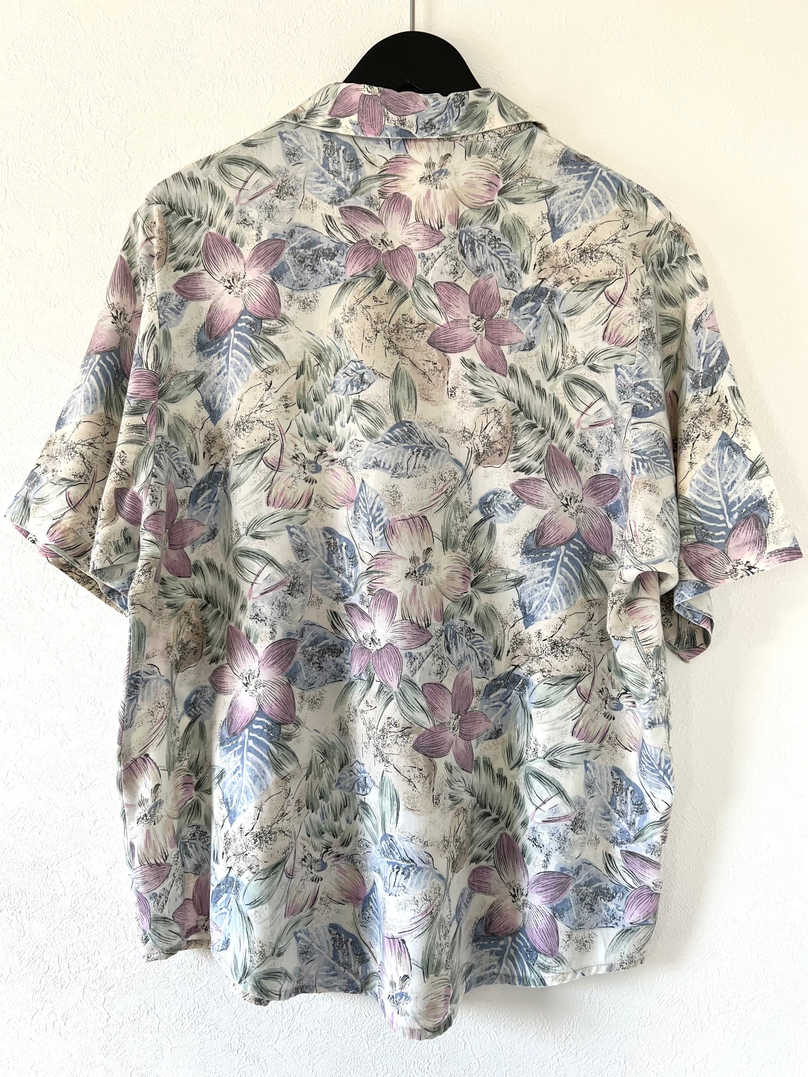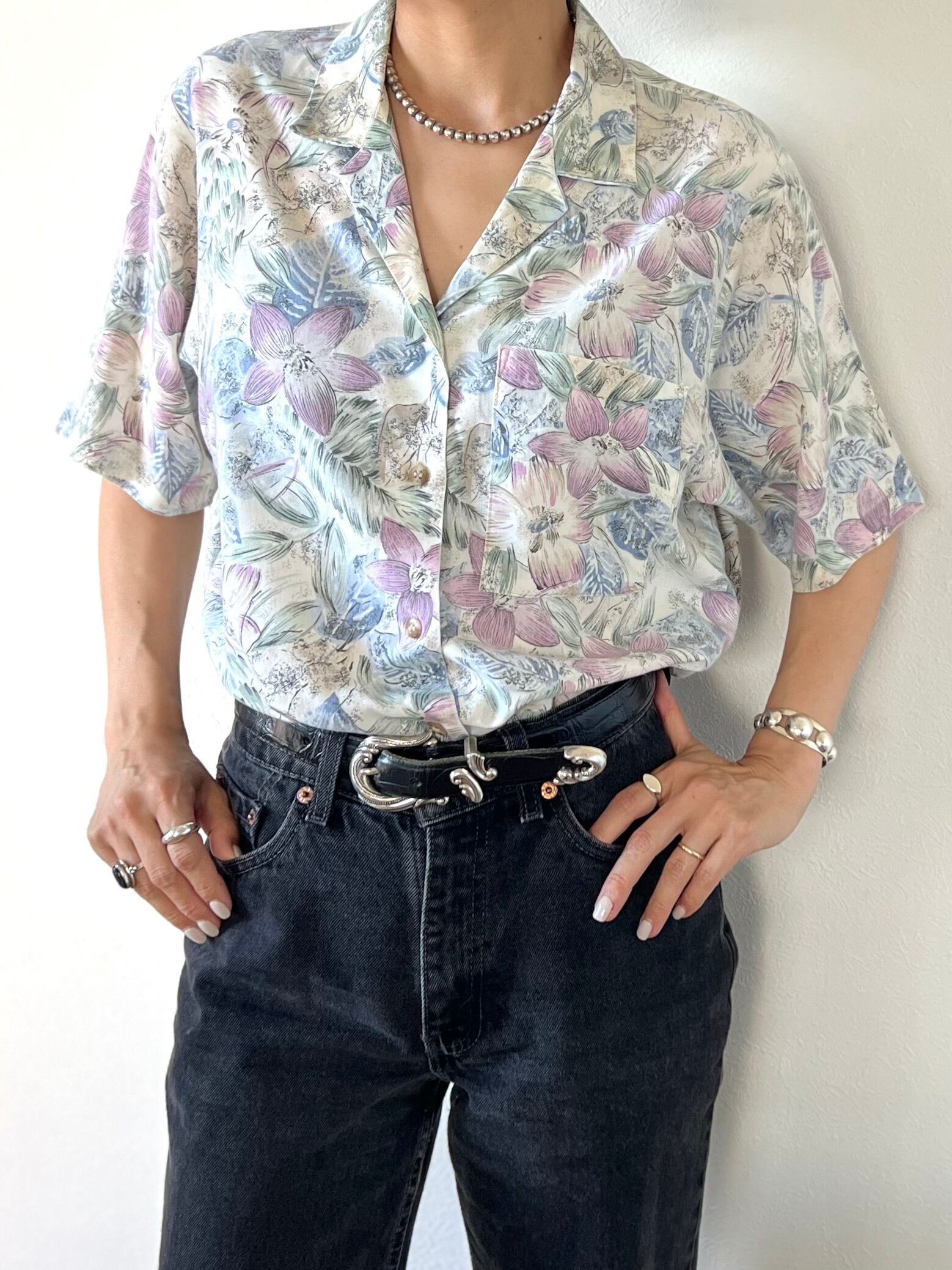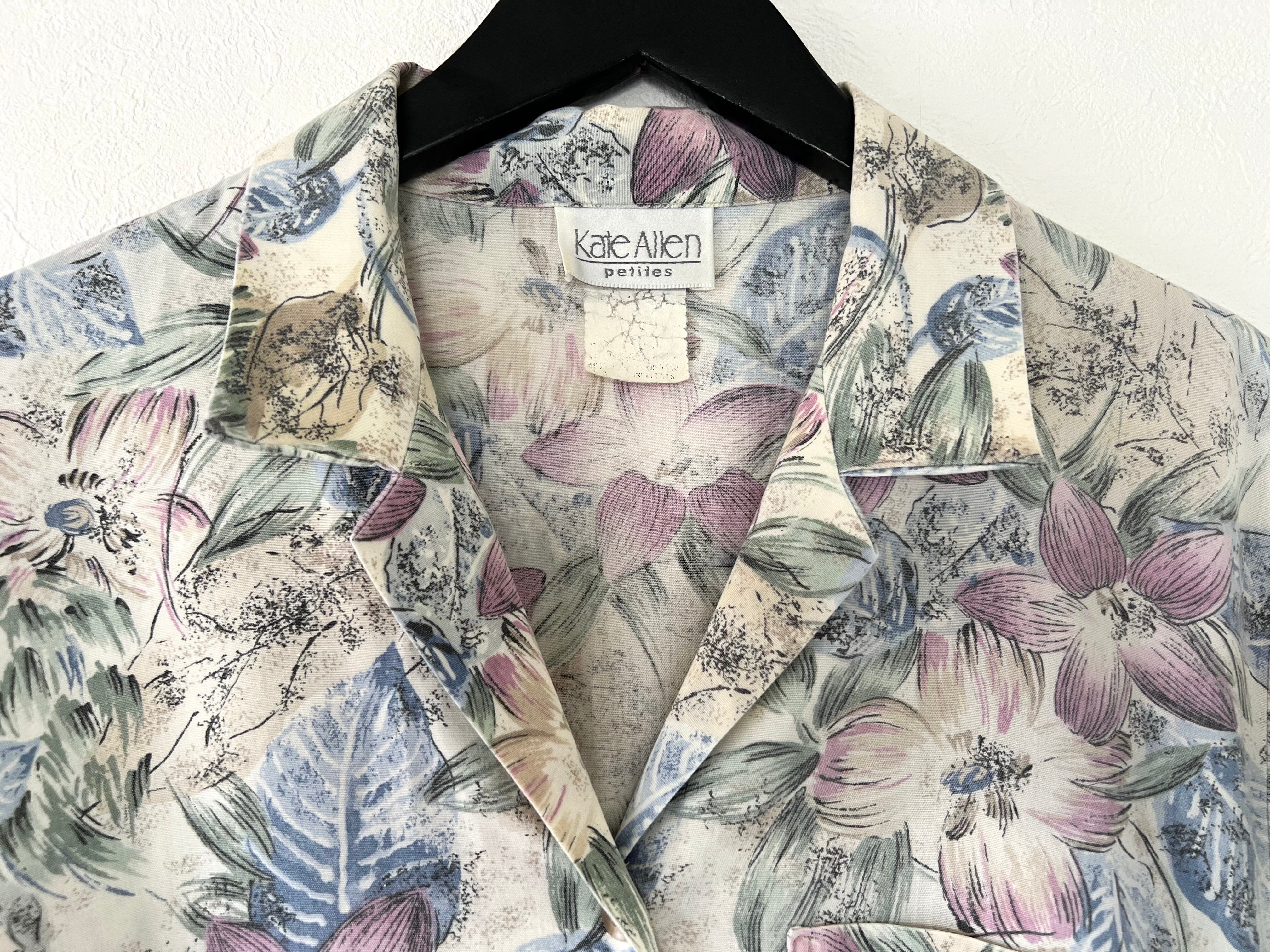 淡いカラートーンの花柄が素敵な80年代のkate allenオープンカラーシャツ。