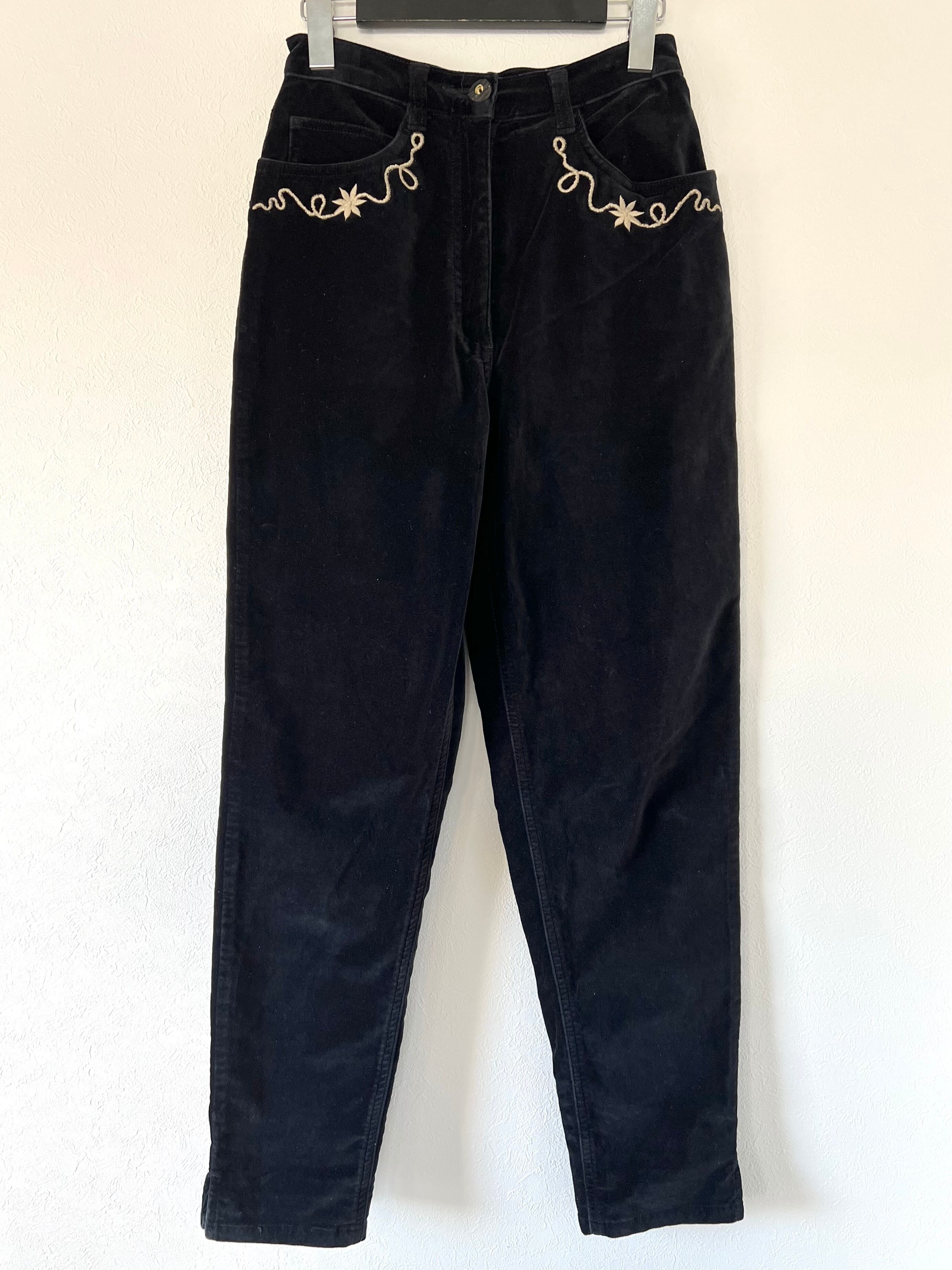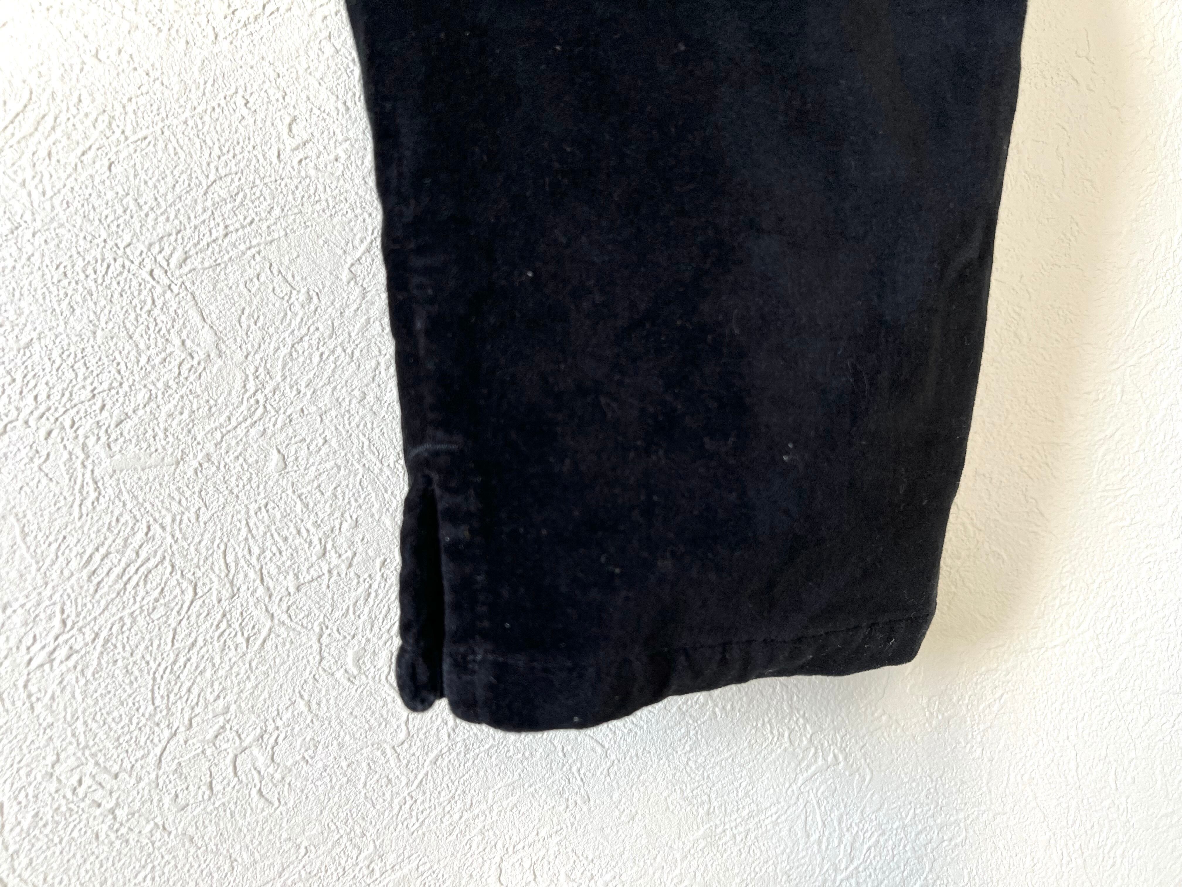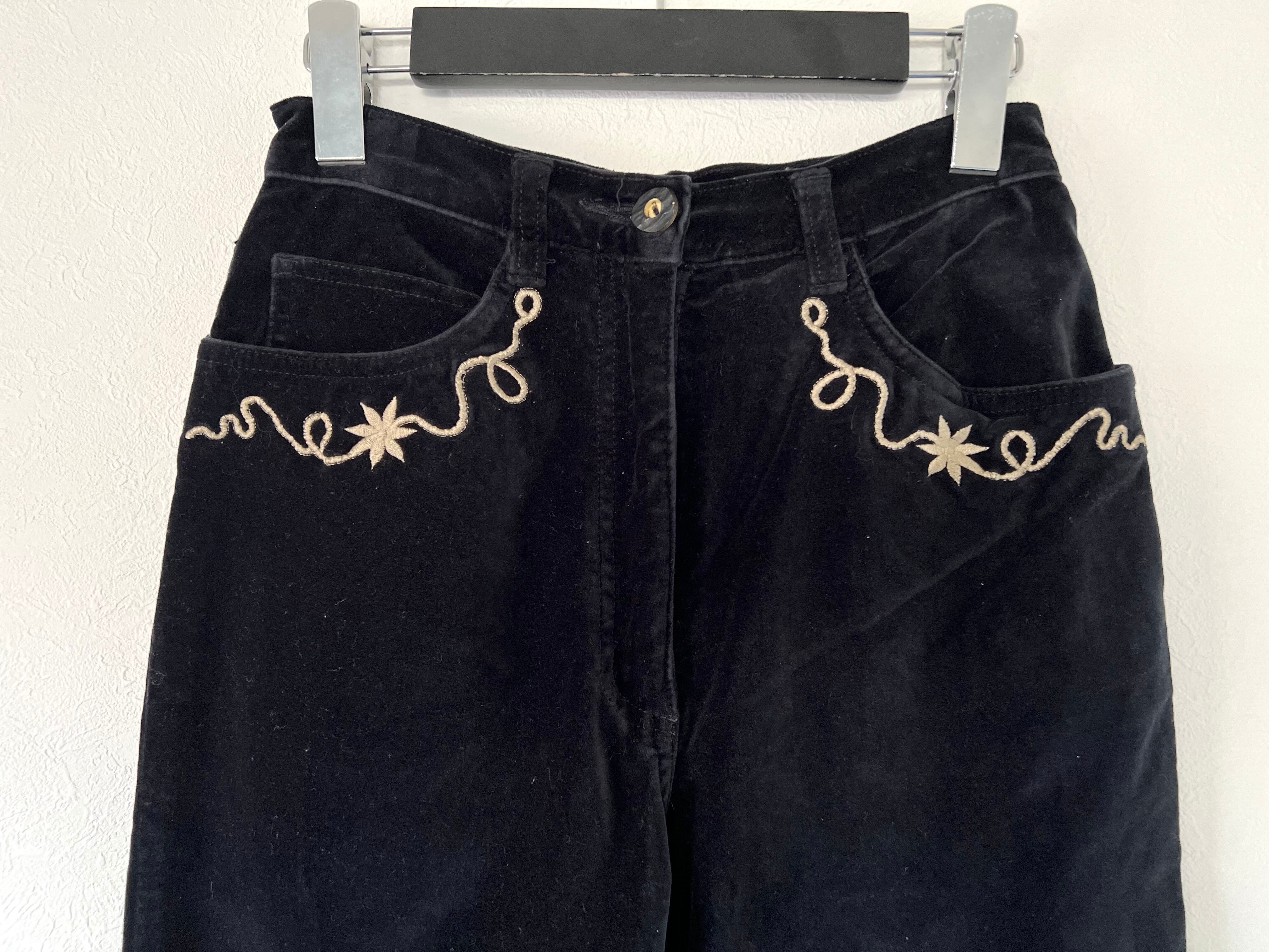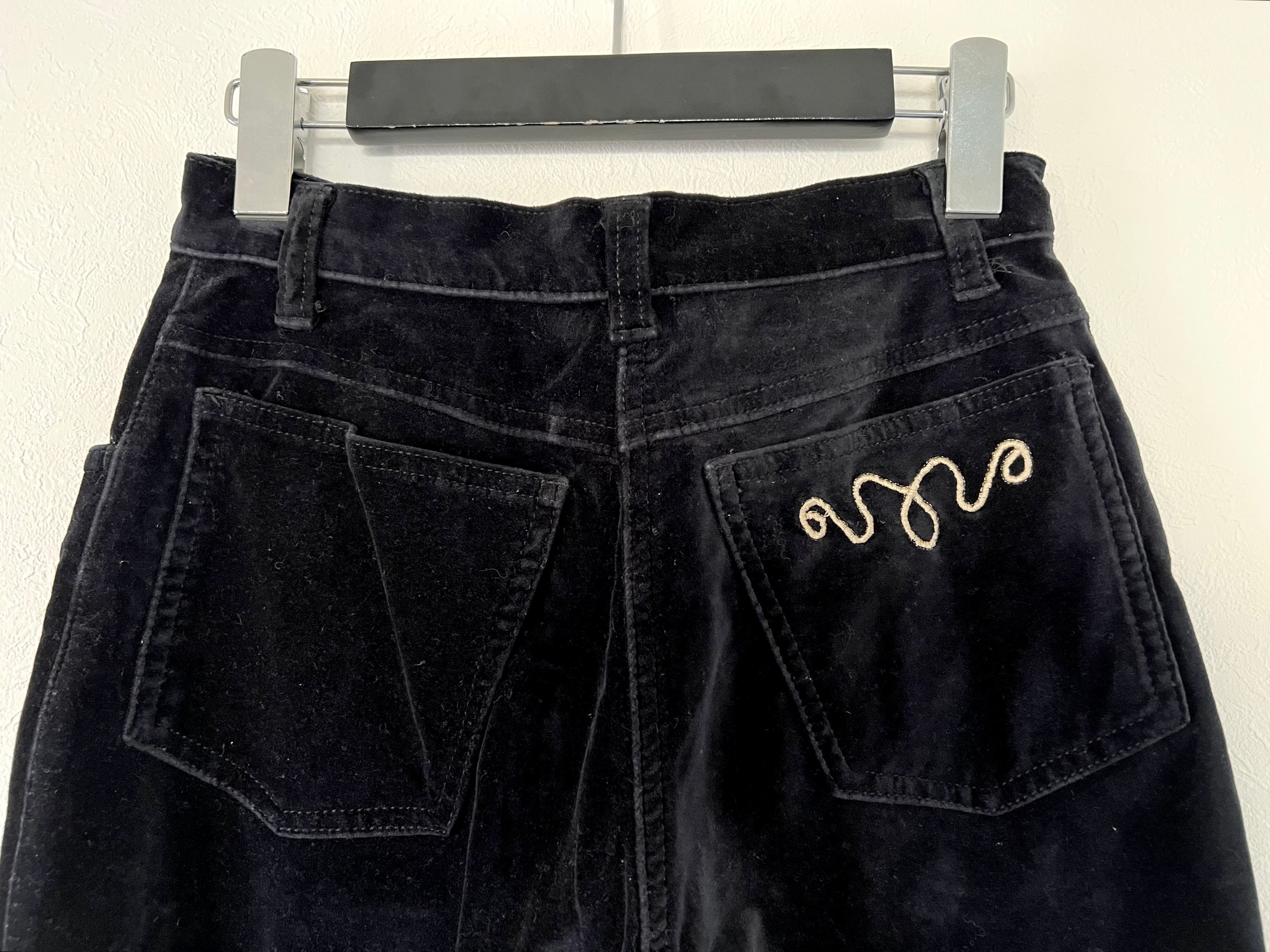 ポケットに刺繍がほどこされたストレッチのあるベロアパンツ。