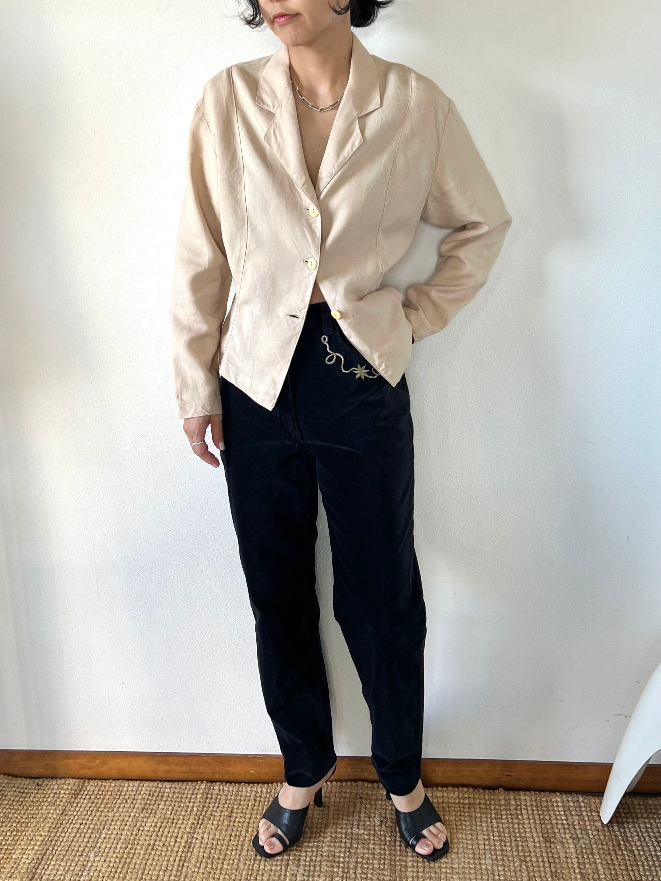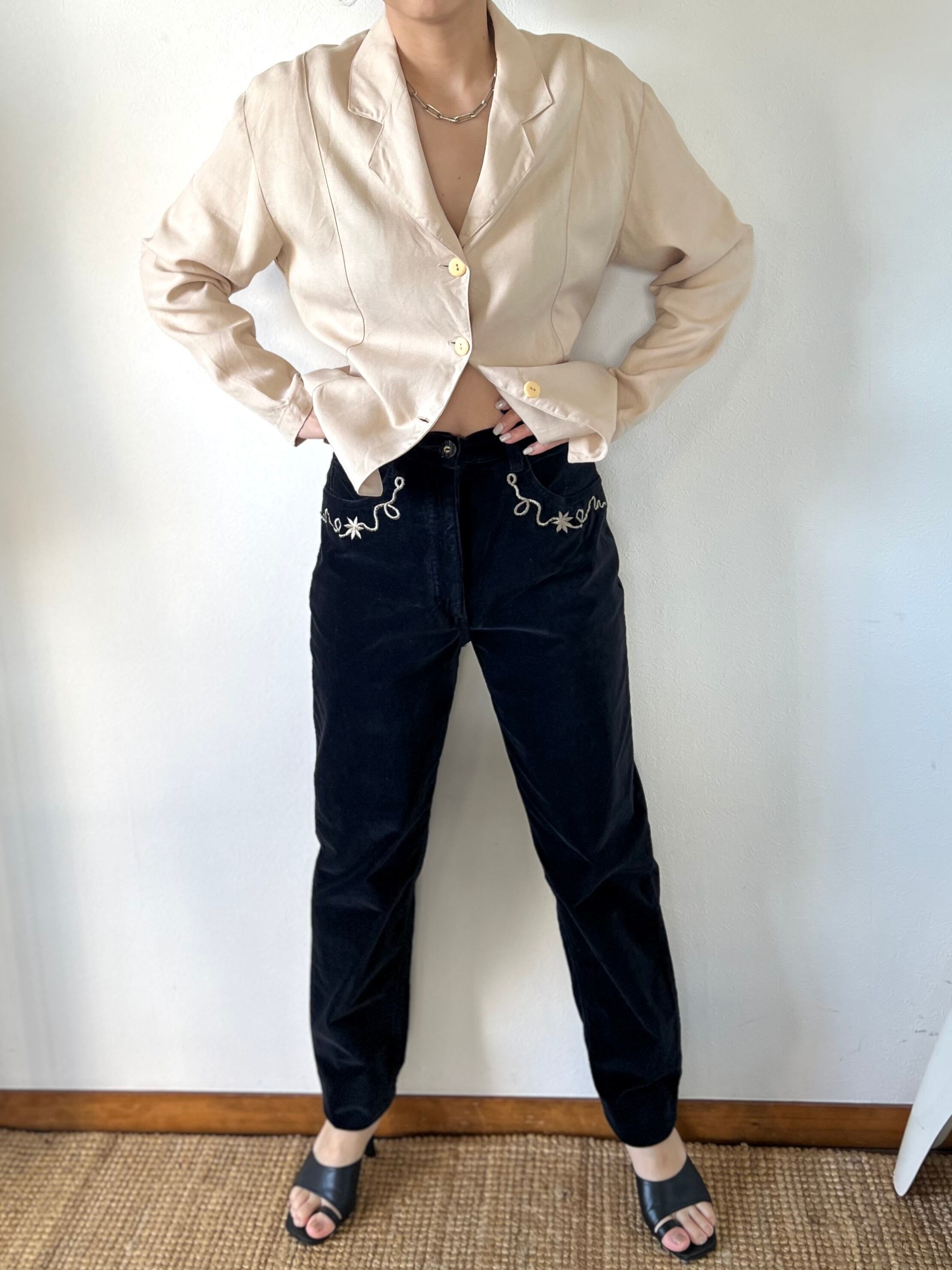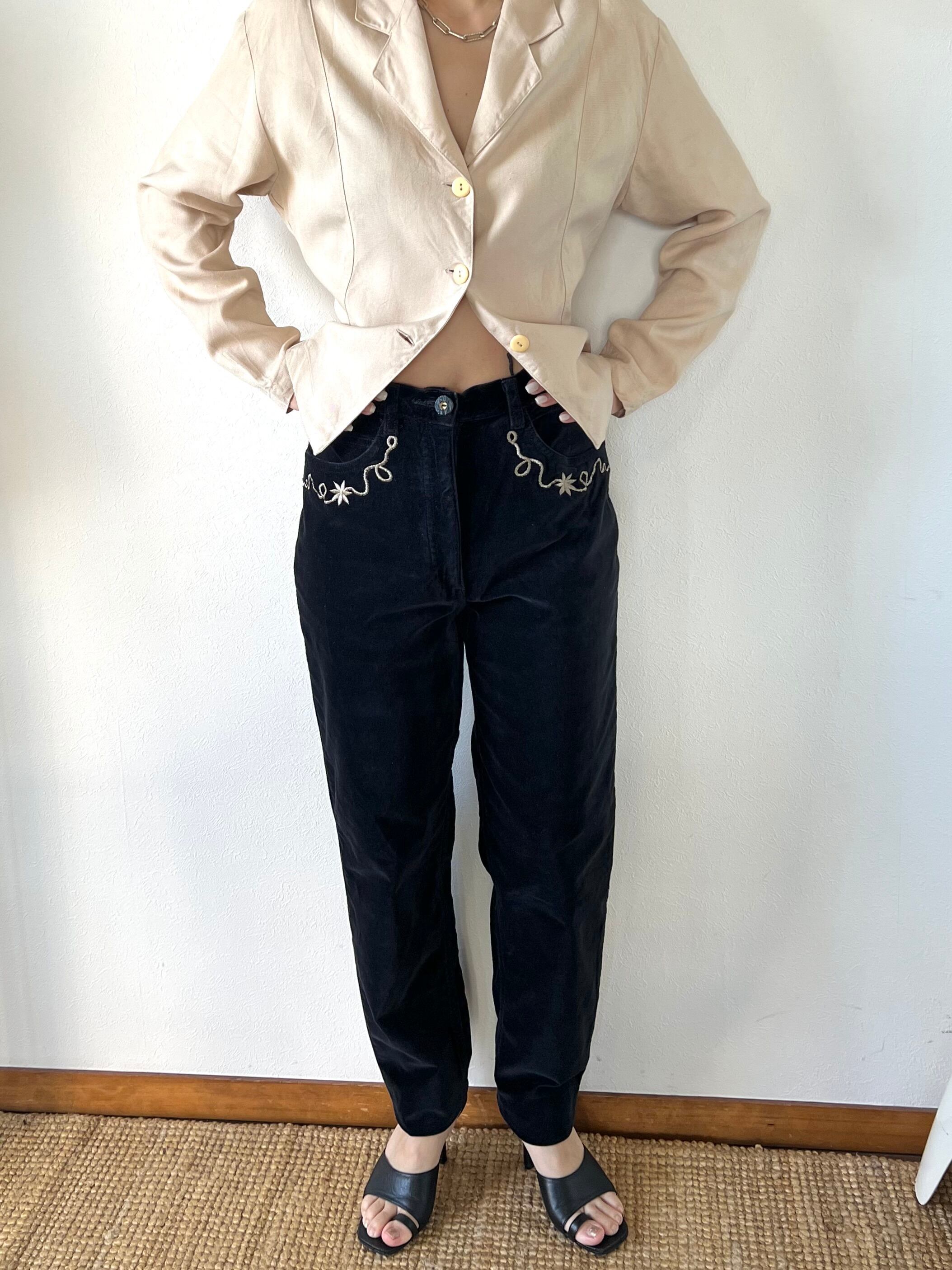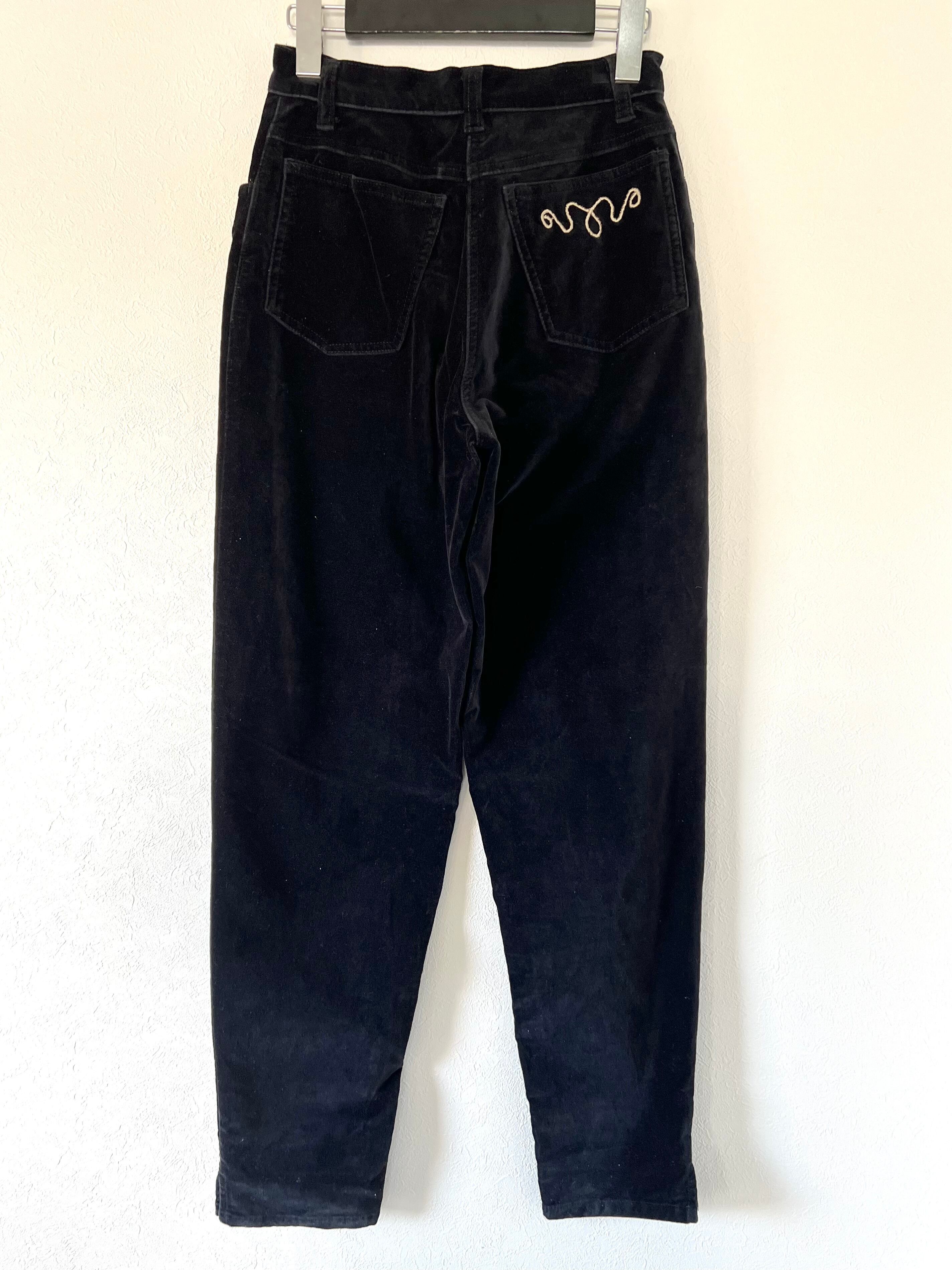 ポケットに刺繍がほどこされたストレッチのあるベロアパンツ。