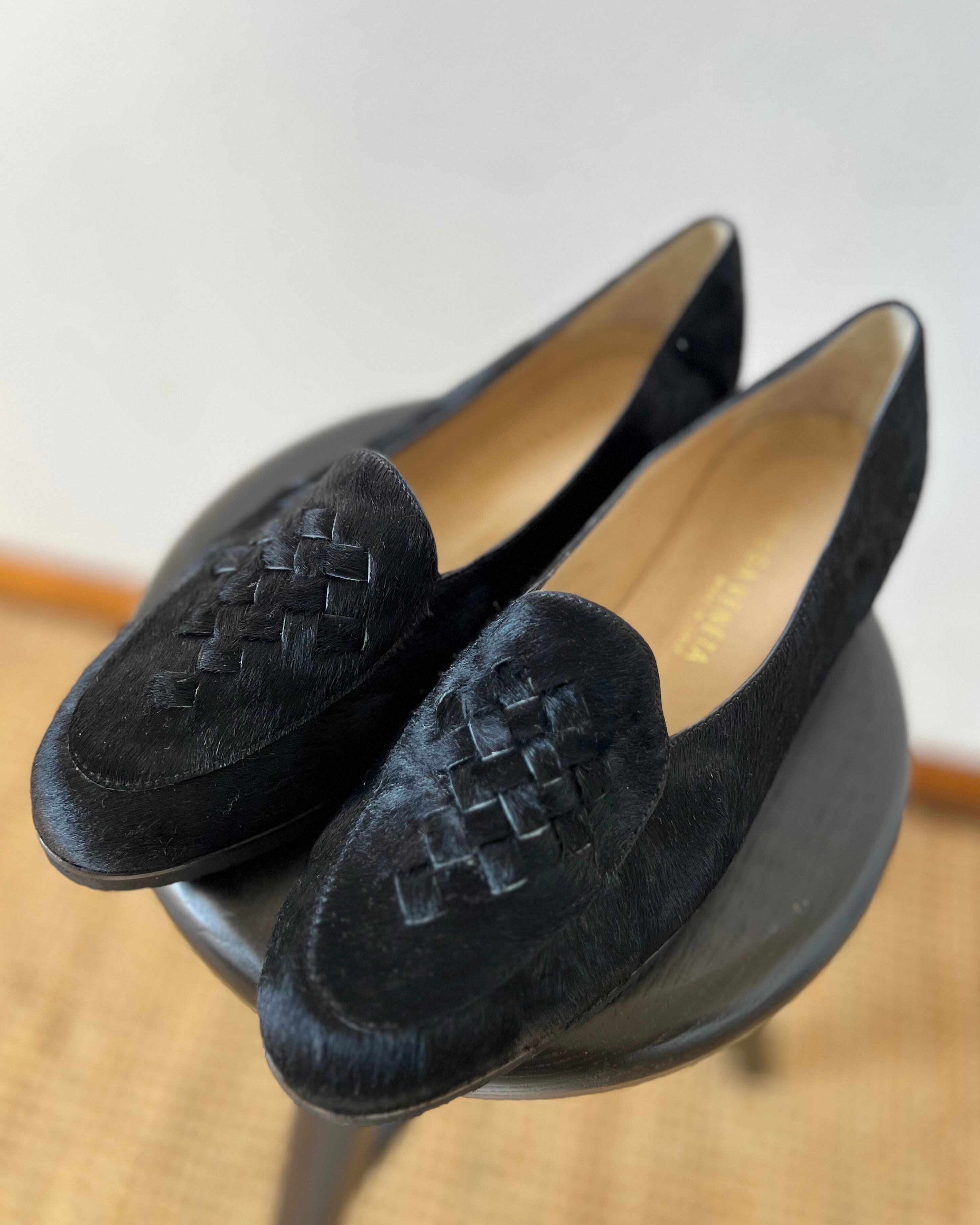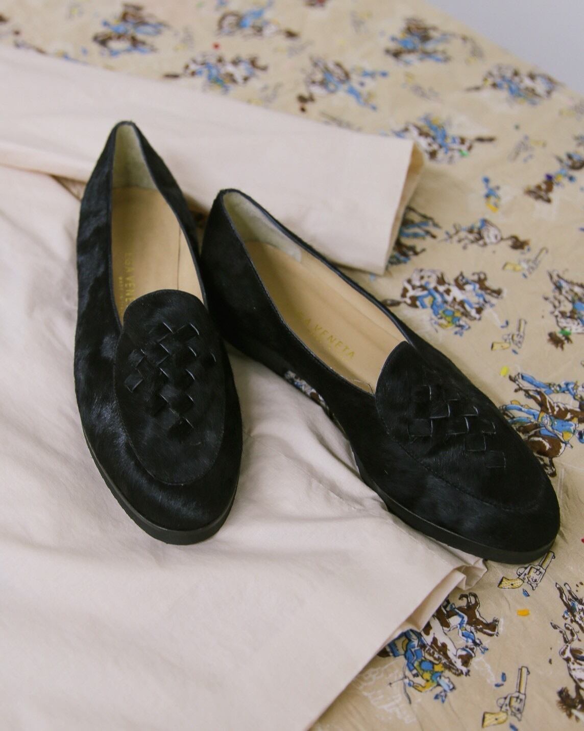 Bottega Venetaを象徴するイントレチャートの編み込みが素敵なハラコレザーのローファーシューズ。
