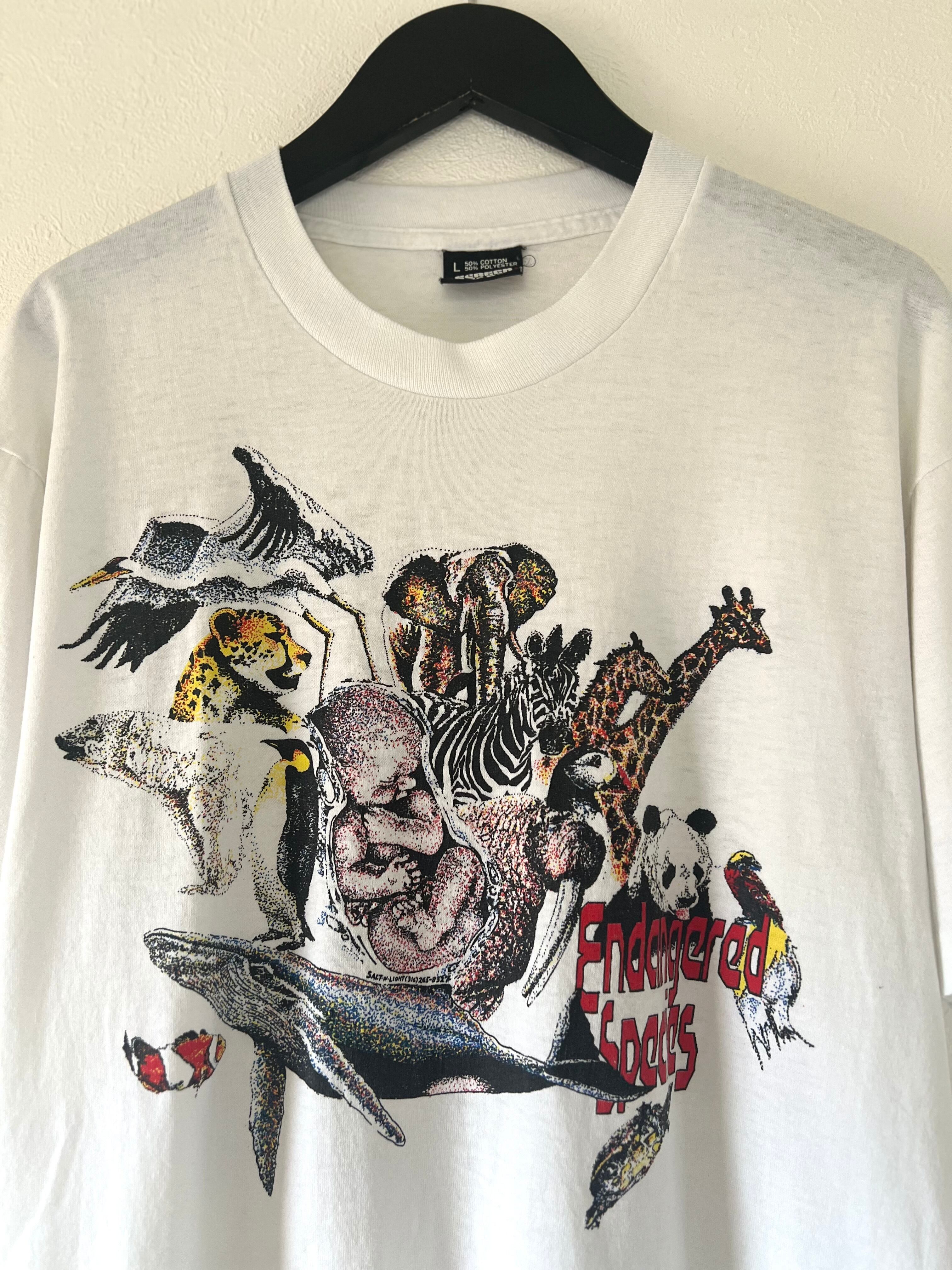 ベビーと多様なアニマルのプリントで国際自然保護連合が定めた絶滅危惧の文字や電話番号の入ったデザインです。