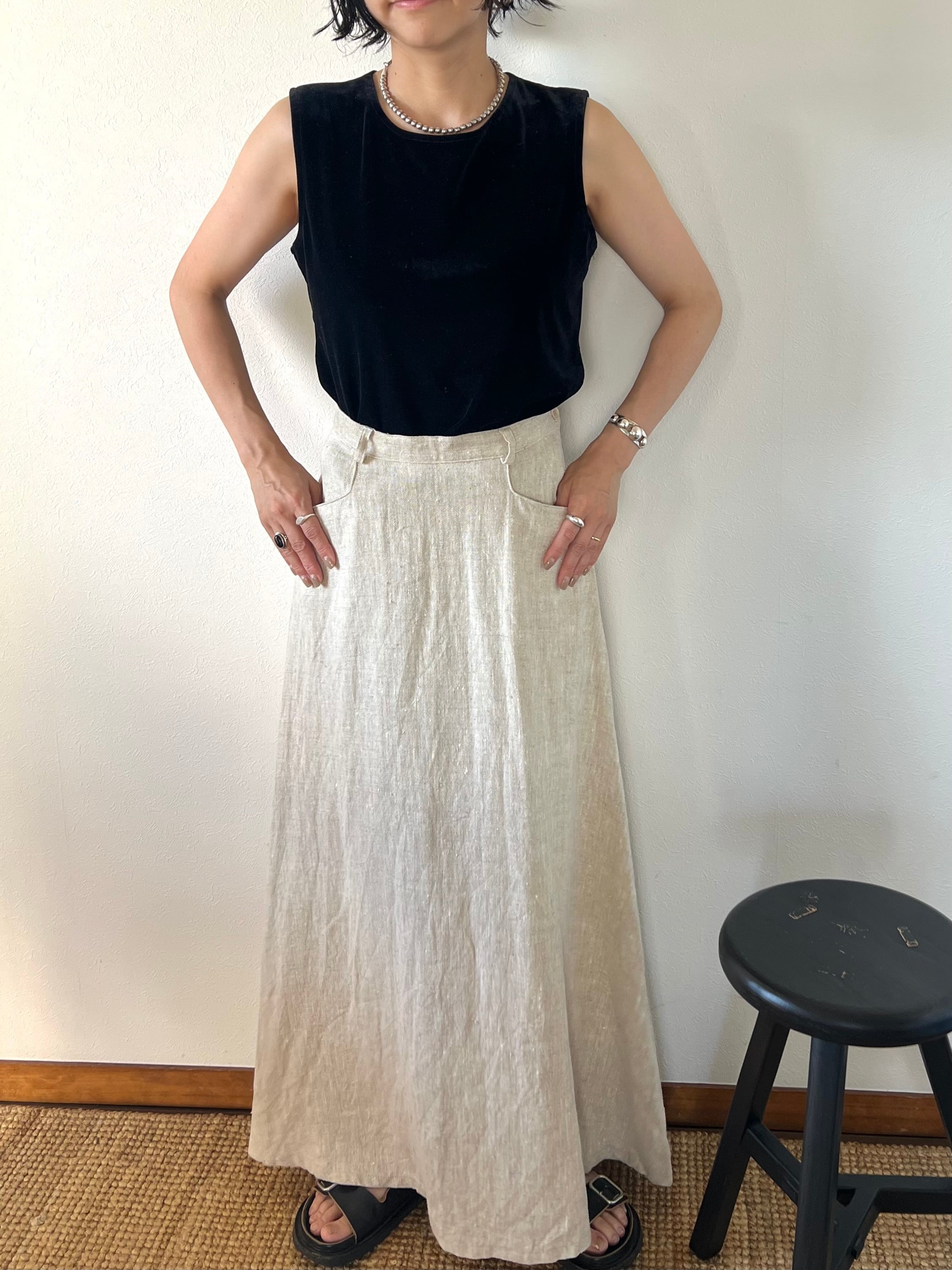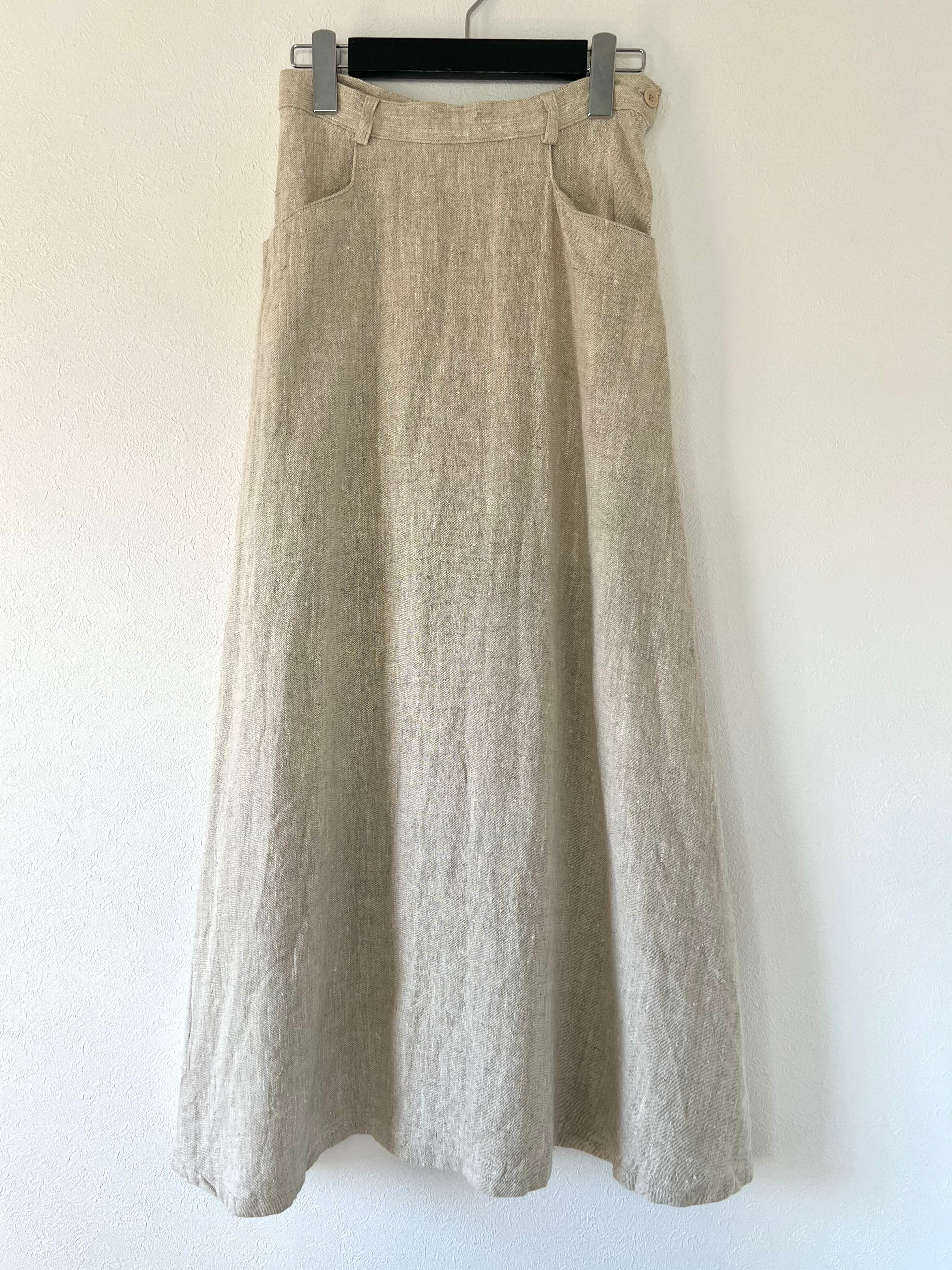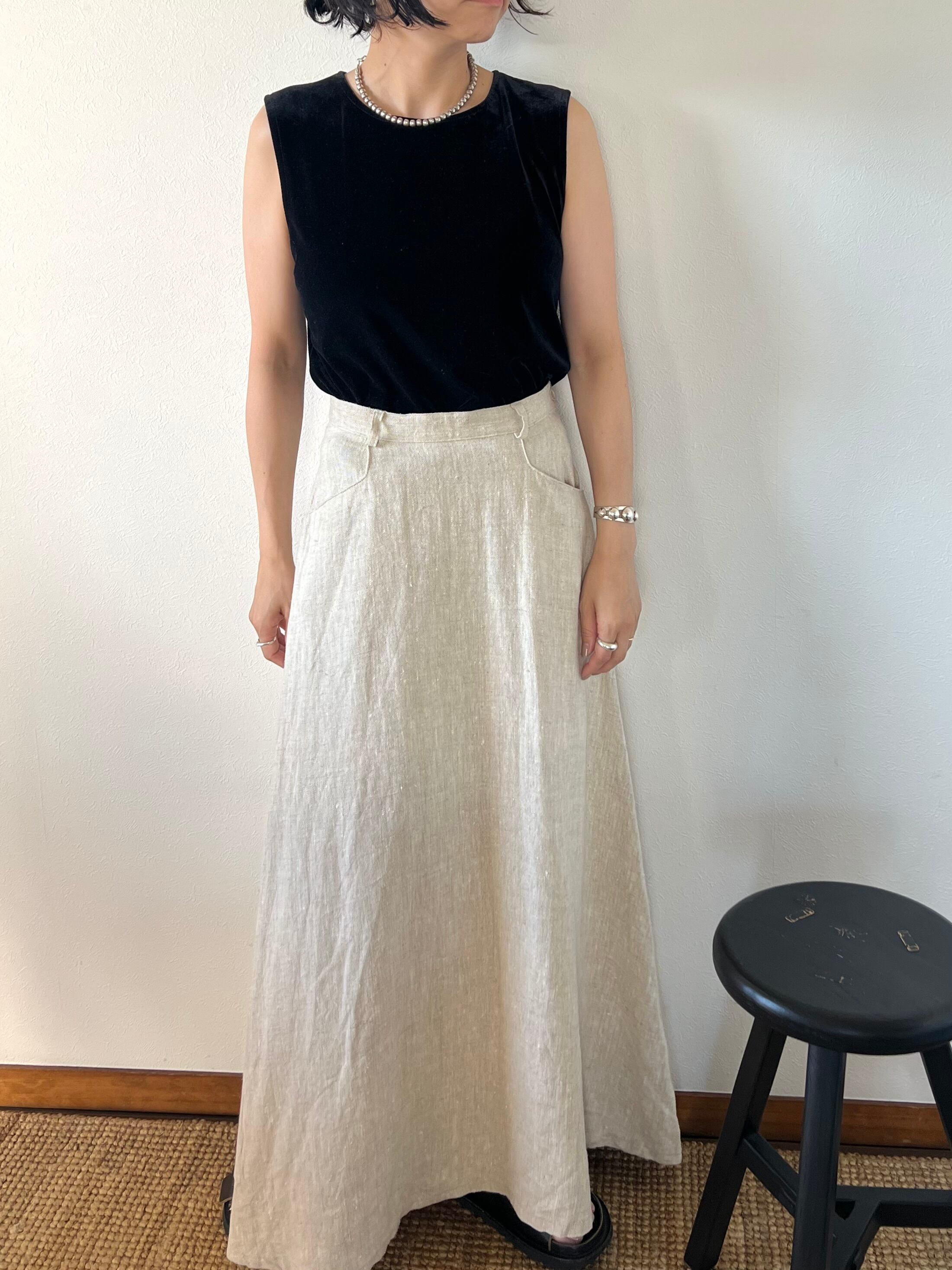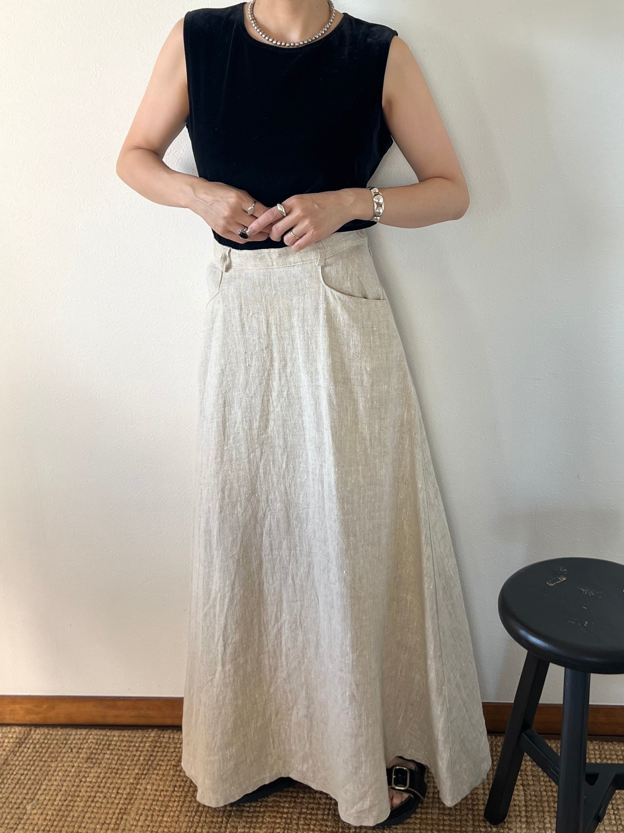 たっぷりとリネンを使用したフレアのシルエットがシンプルでもドラマチックな印象のロングスカート。