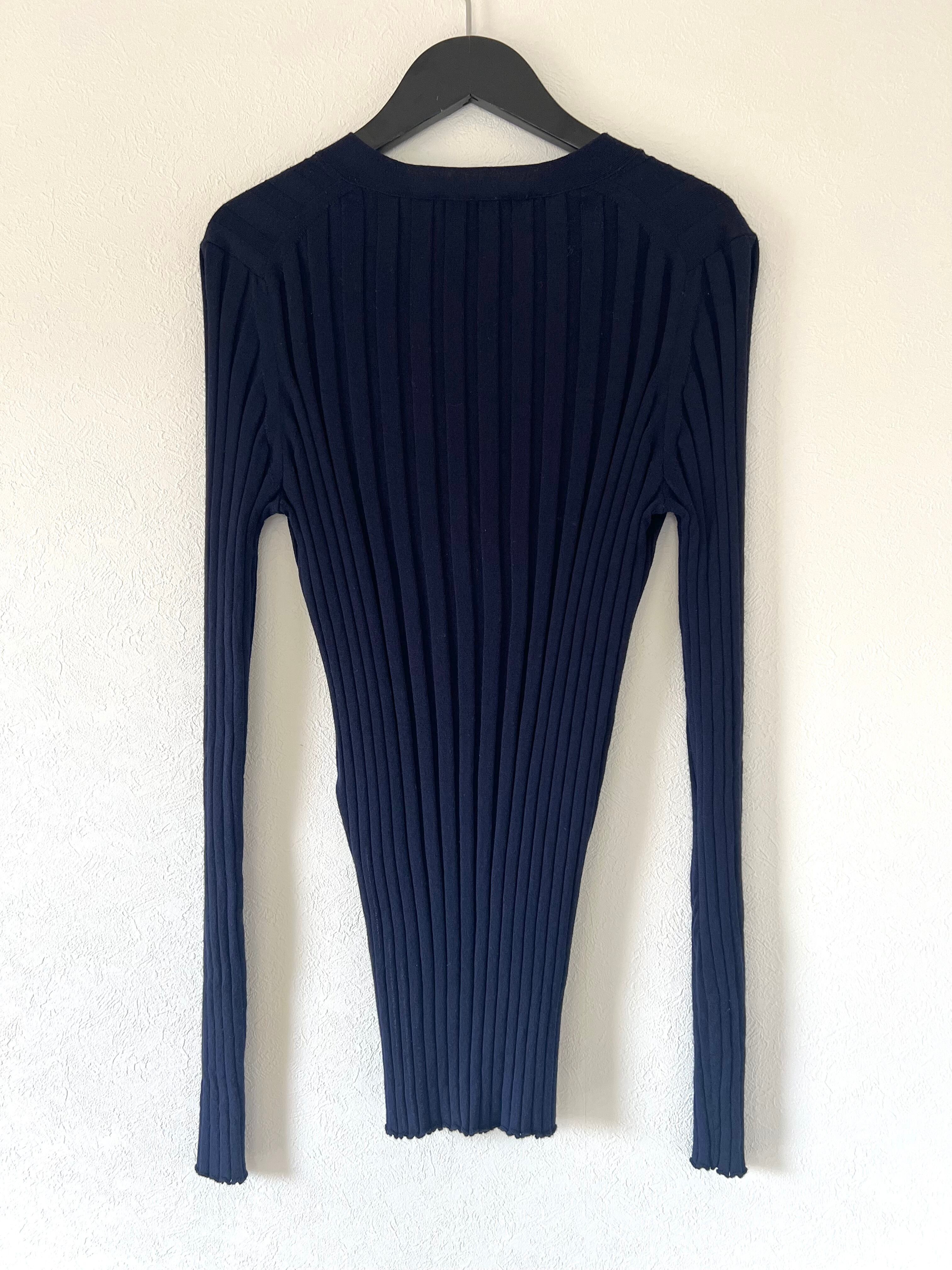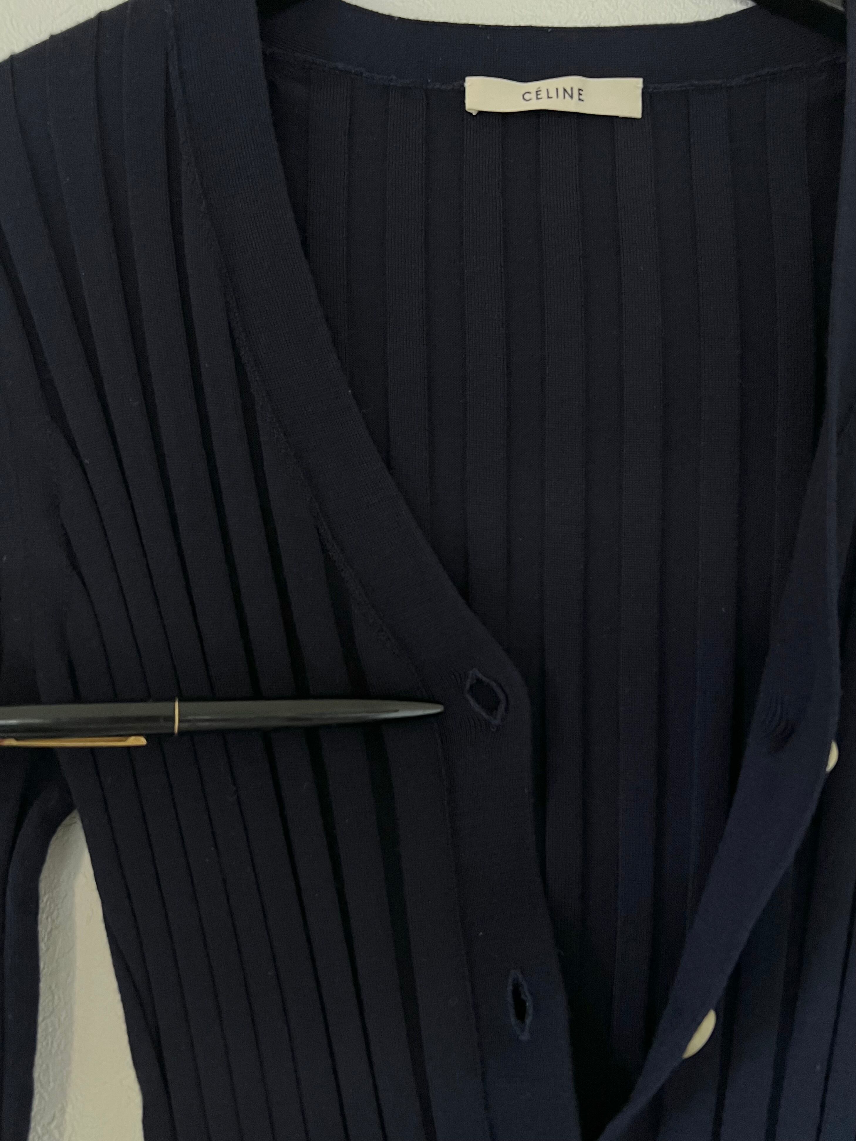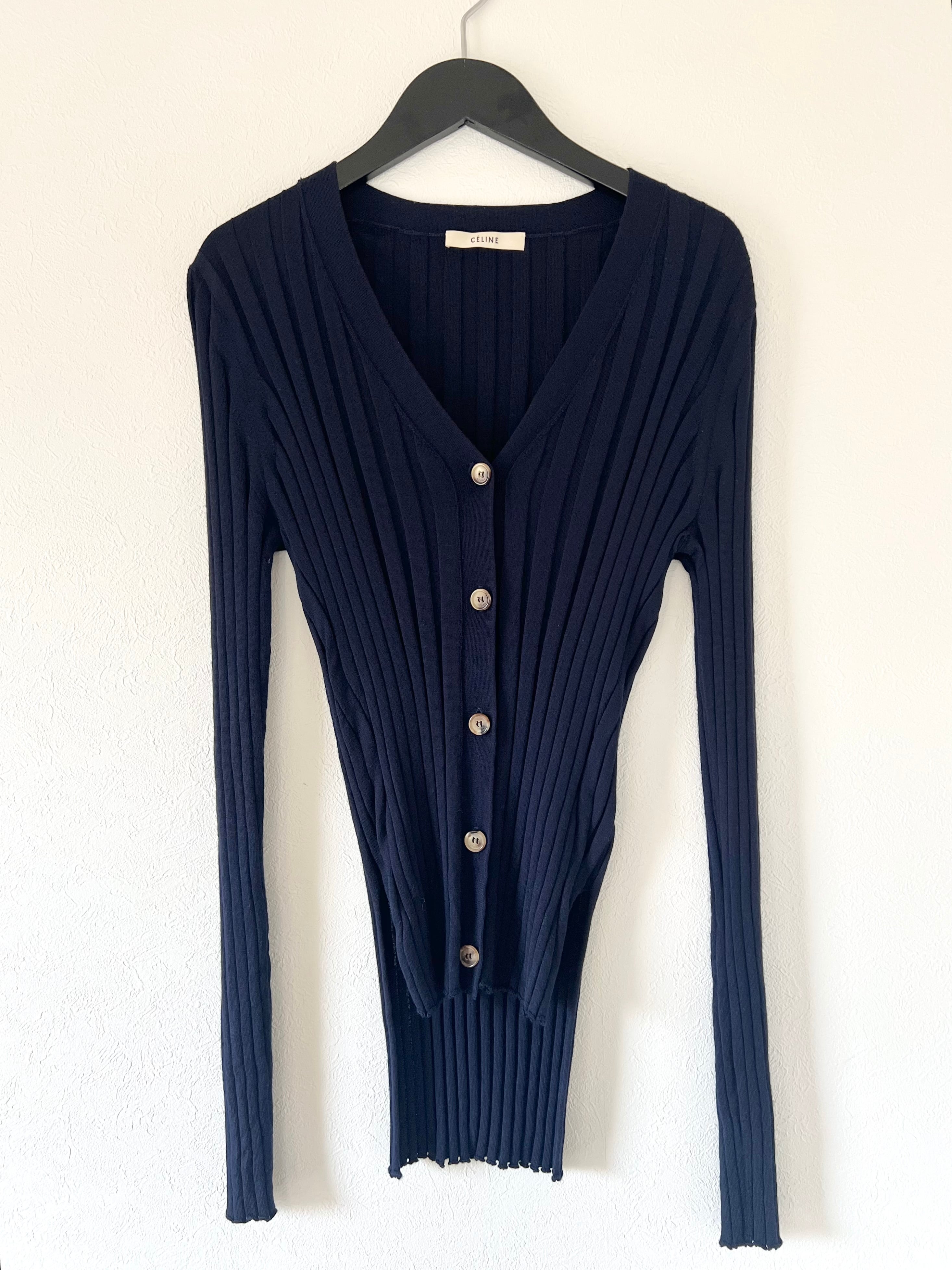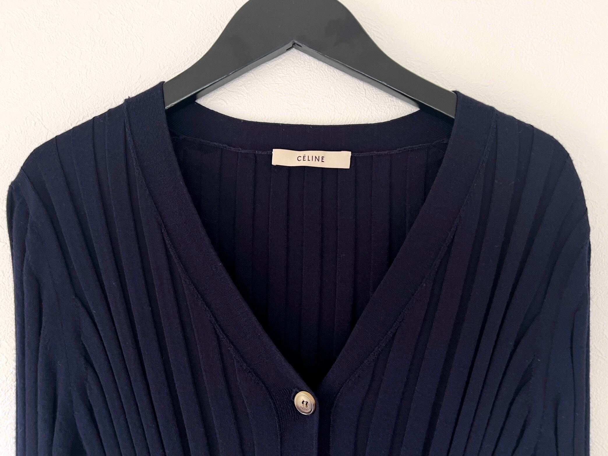 そぎ落とされたいミニマムなアイテムながら、スリットやバックのみ長いシルエットなど細部までこだわり抜かれた強さのあるデザインが魅力のCELINEニットカーディガン。
