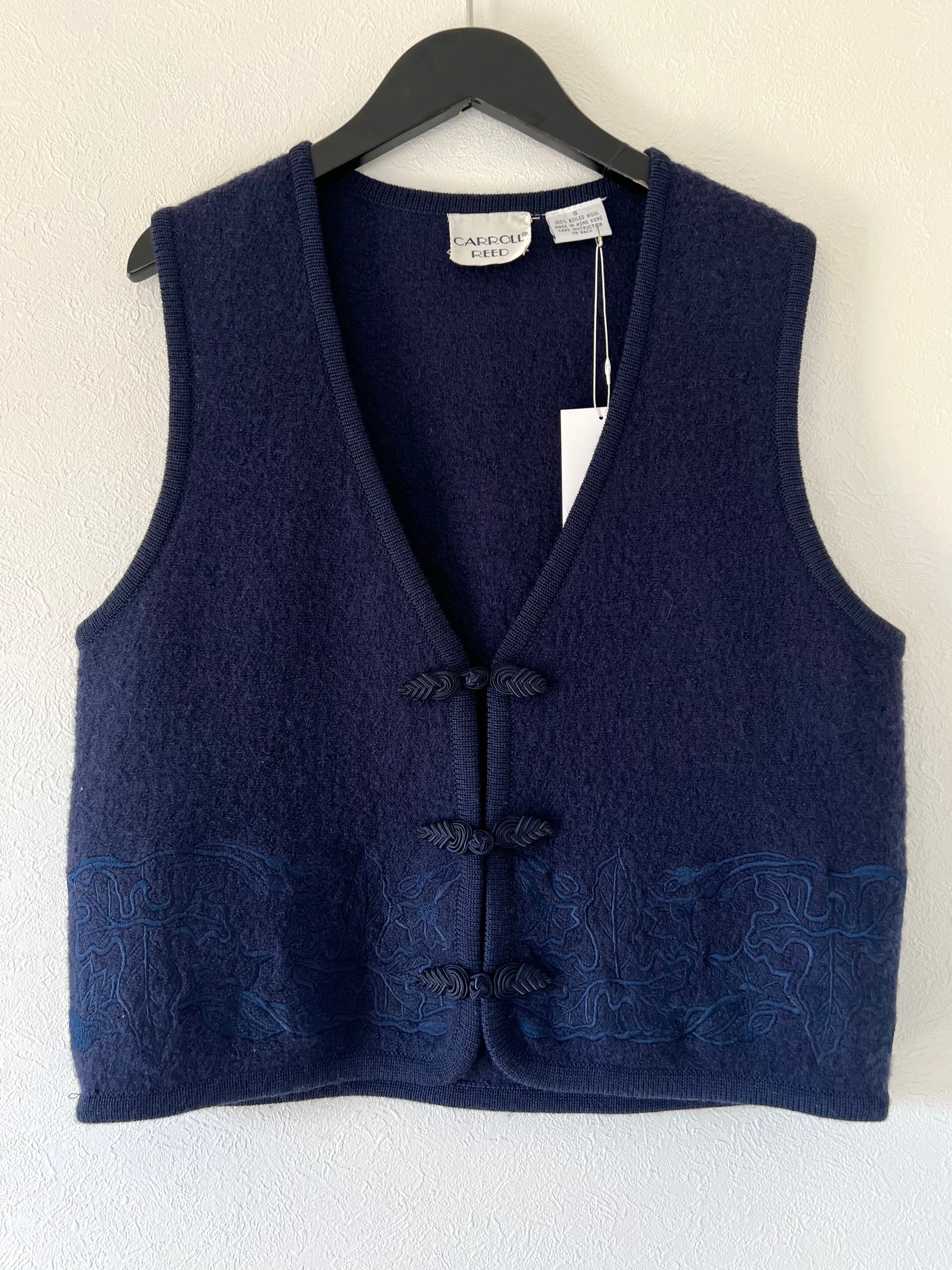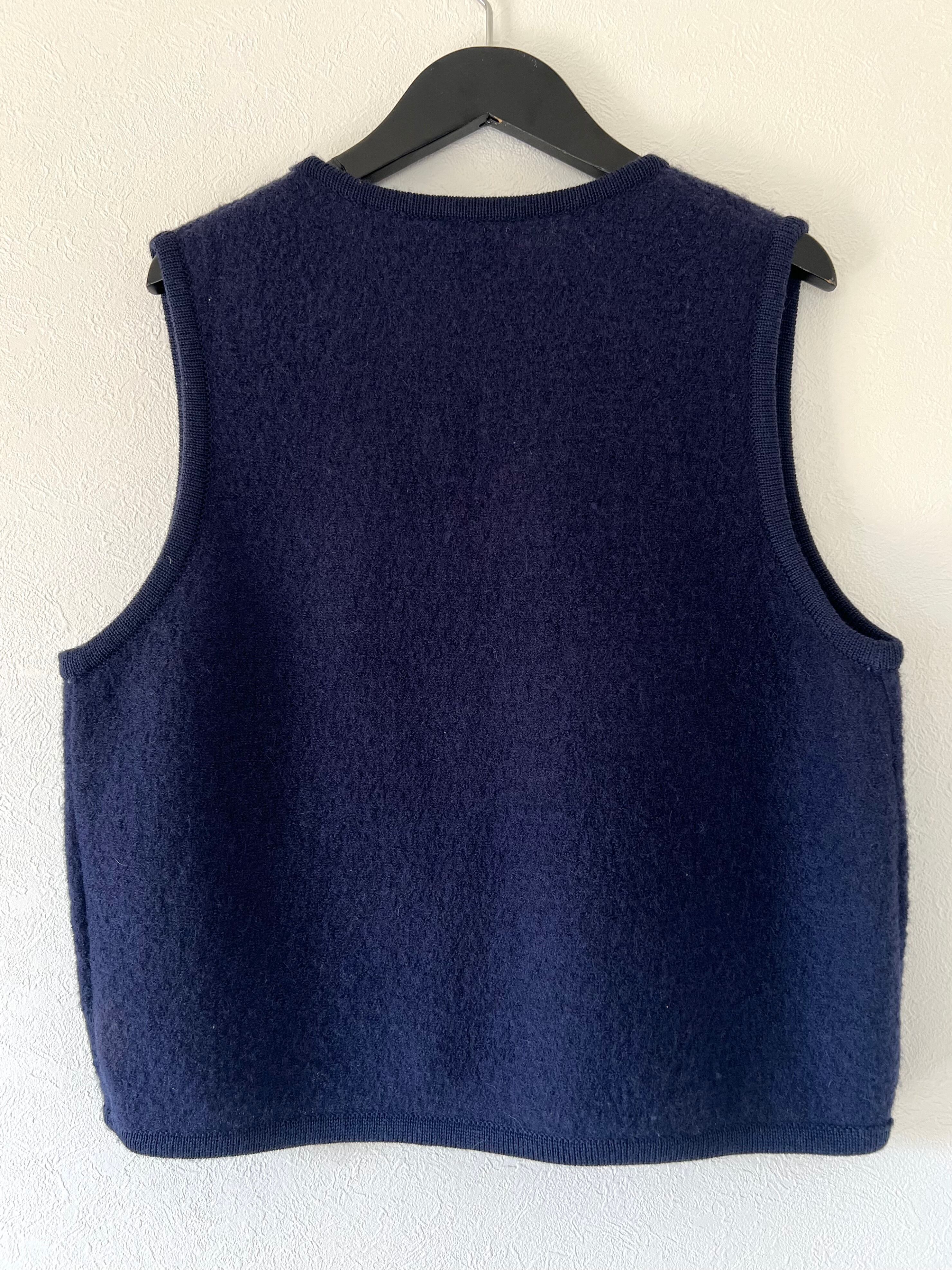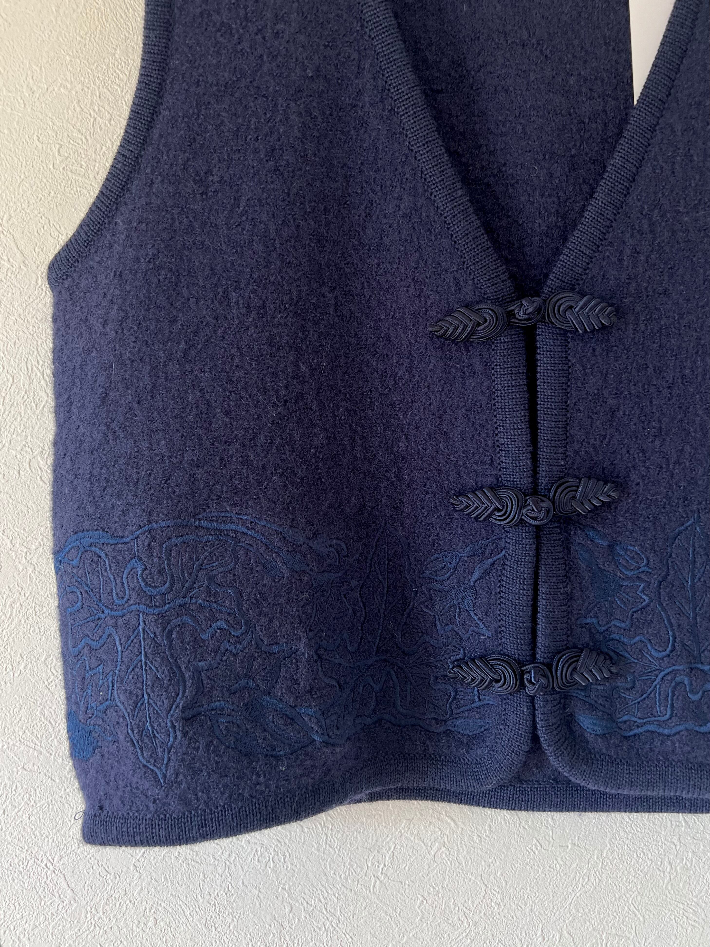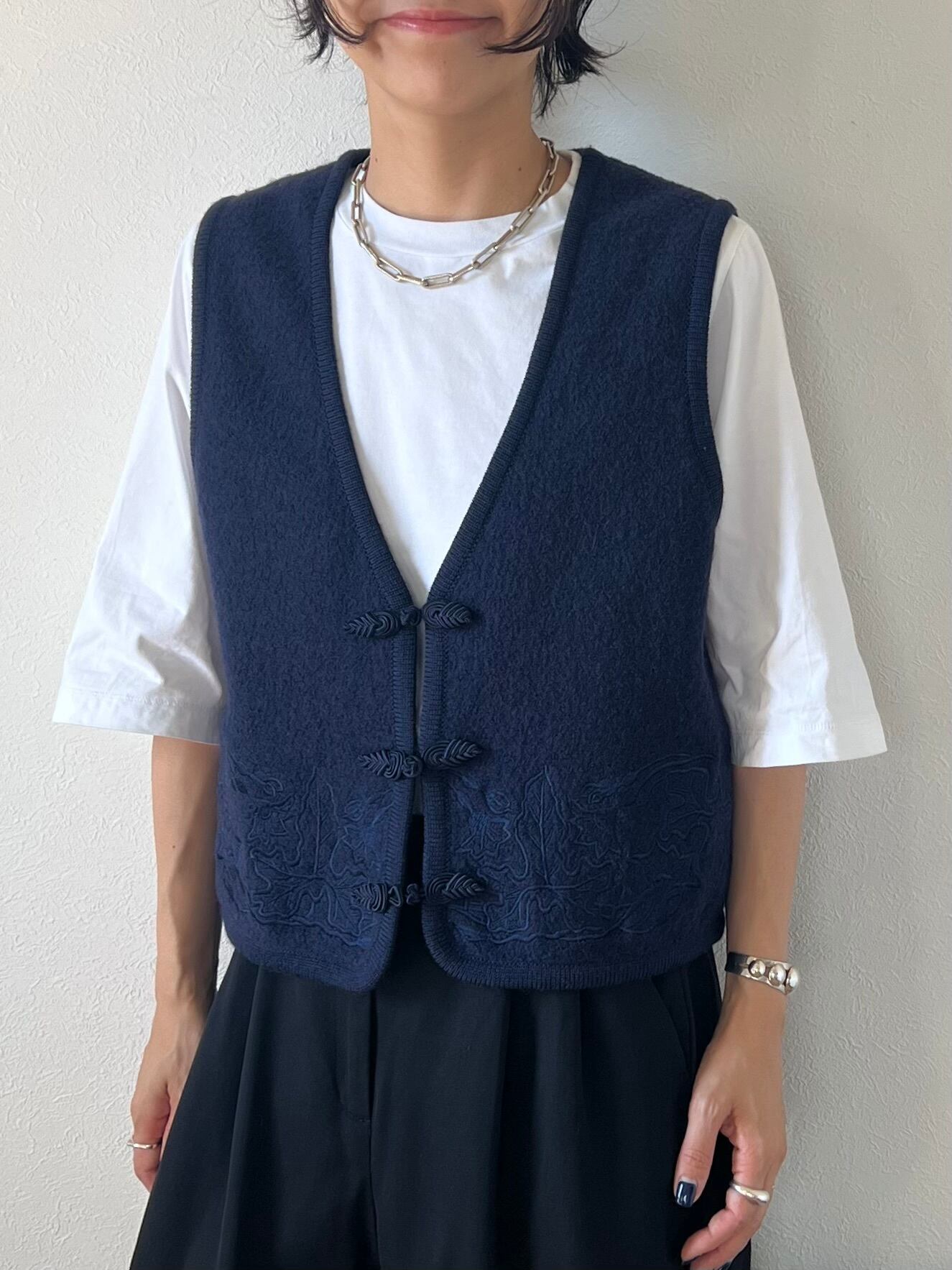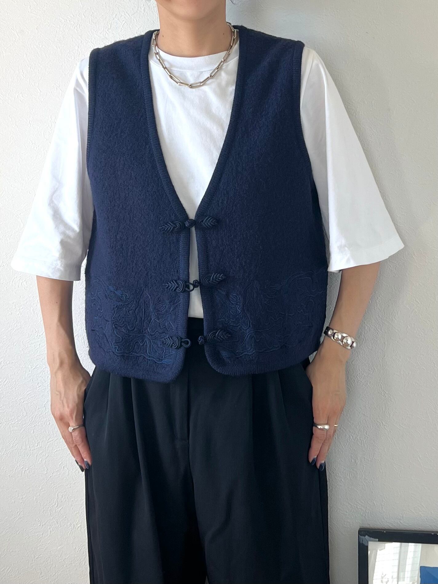 チャイナ風のボタンやさりげない同色の刺繍が素敵なボイルドウールのベスト。