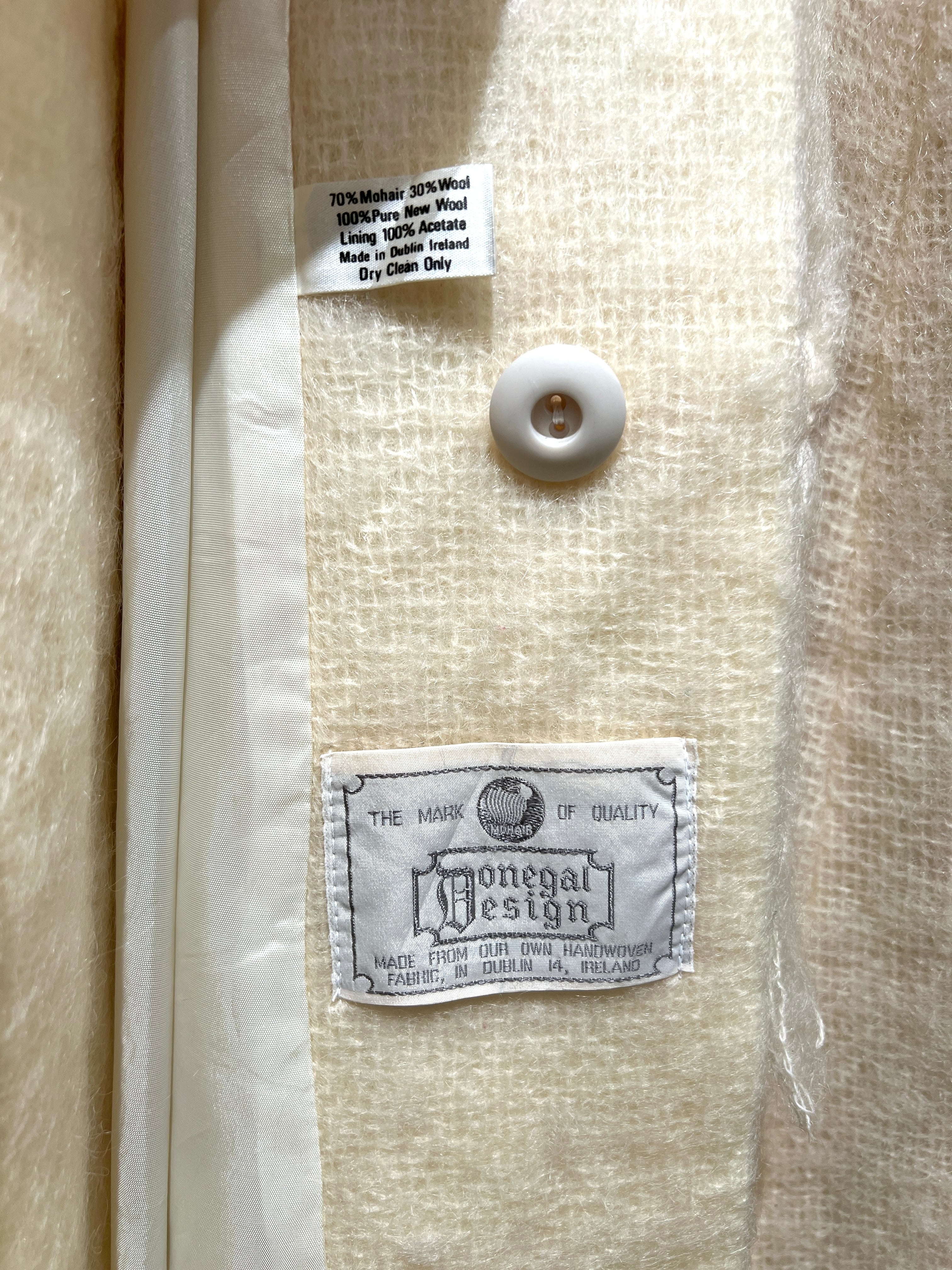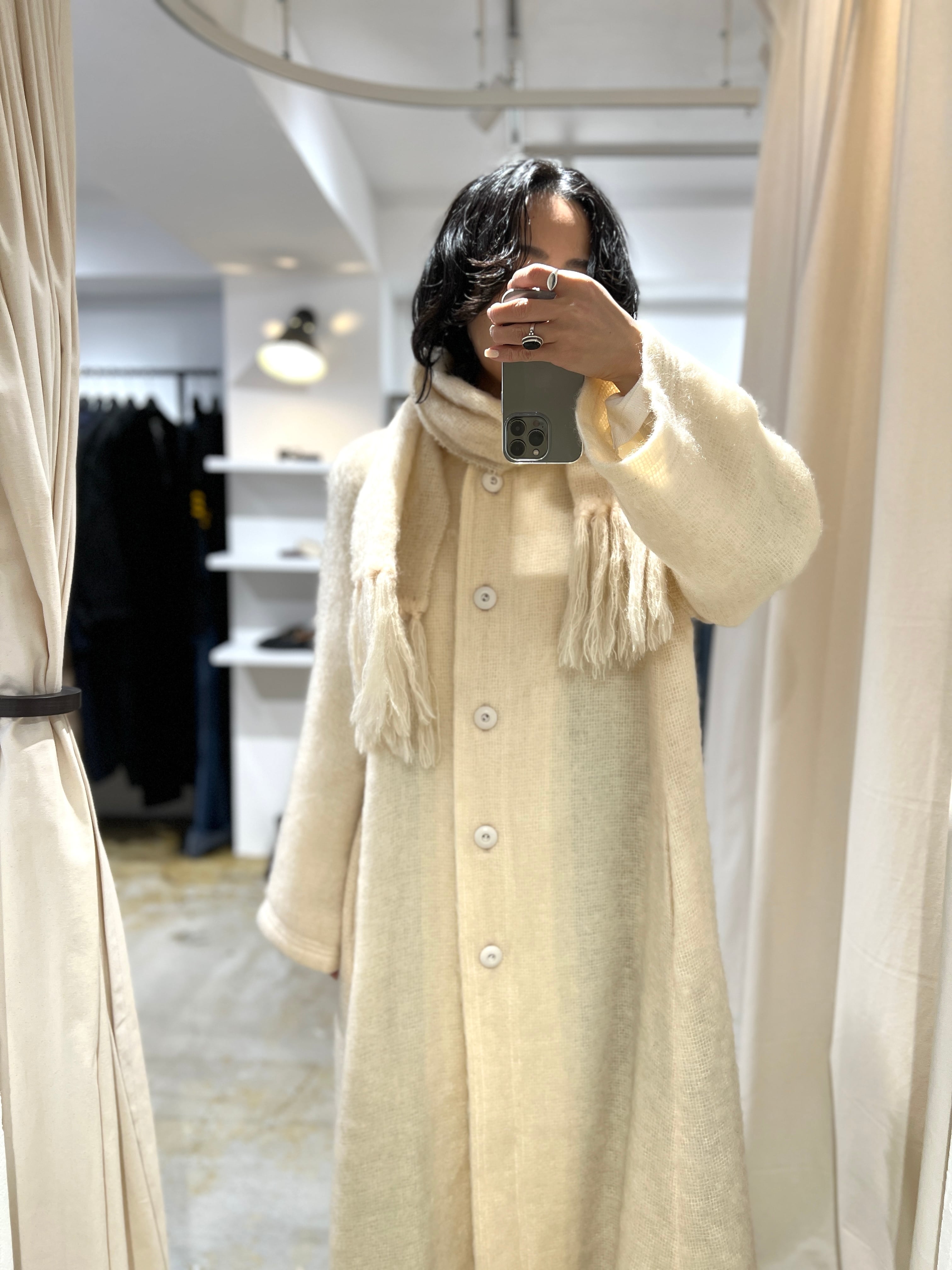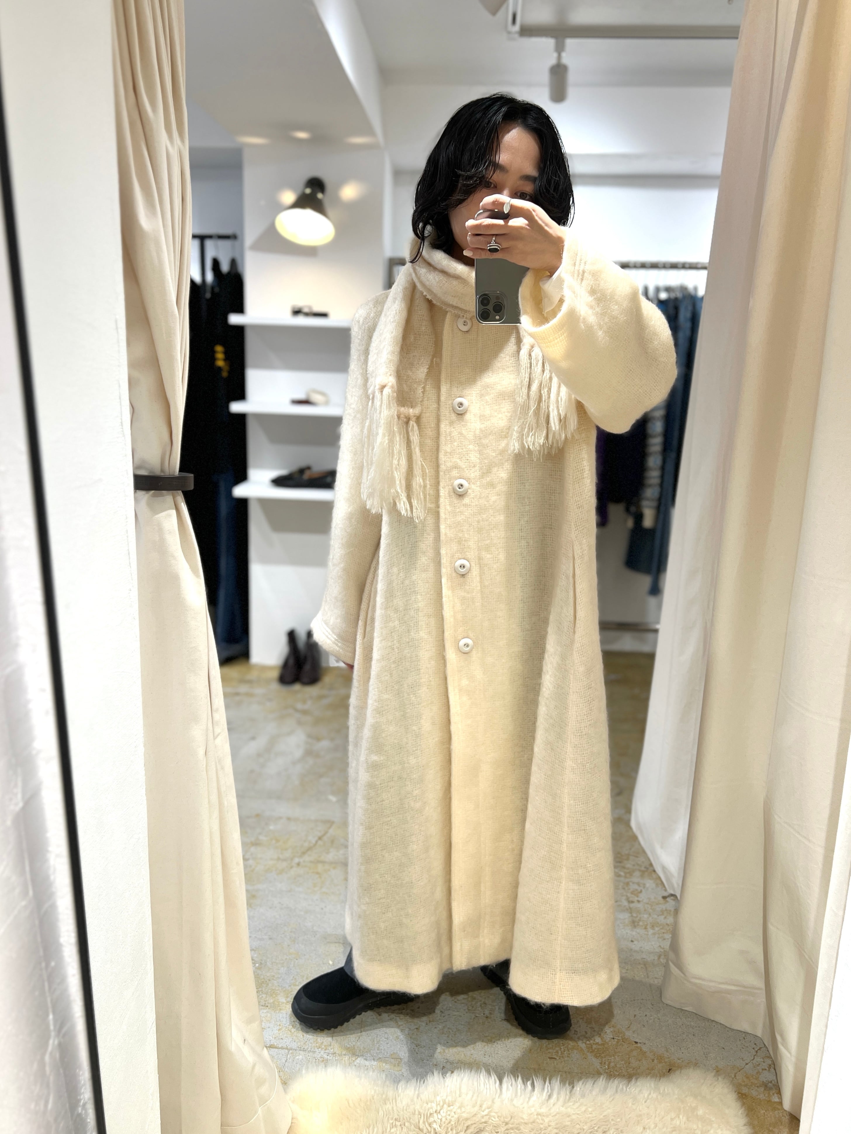 ふわっと柔らかいモヘアに長めのフリンジスカーフの組み合わせが可愛いヴィンテージらしいコートです。