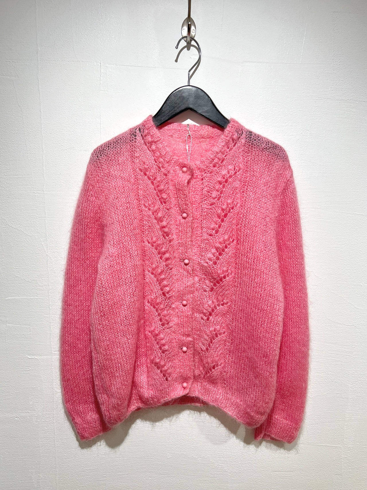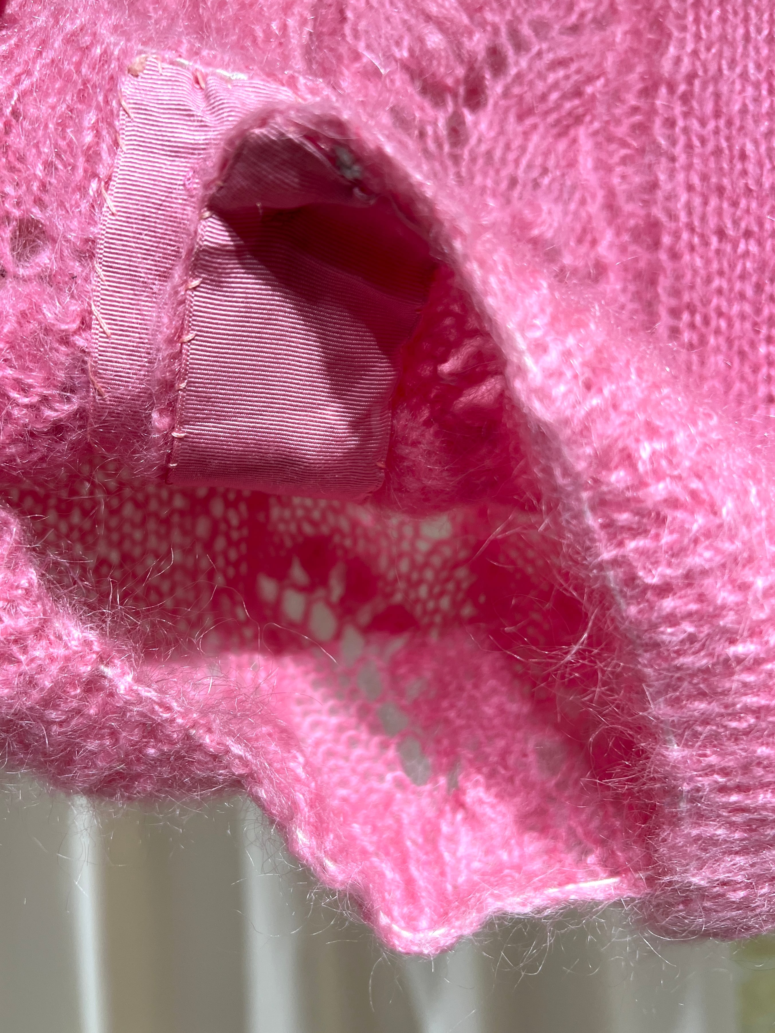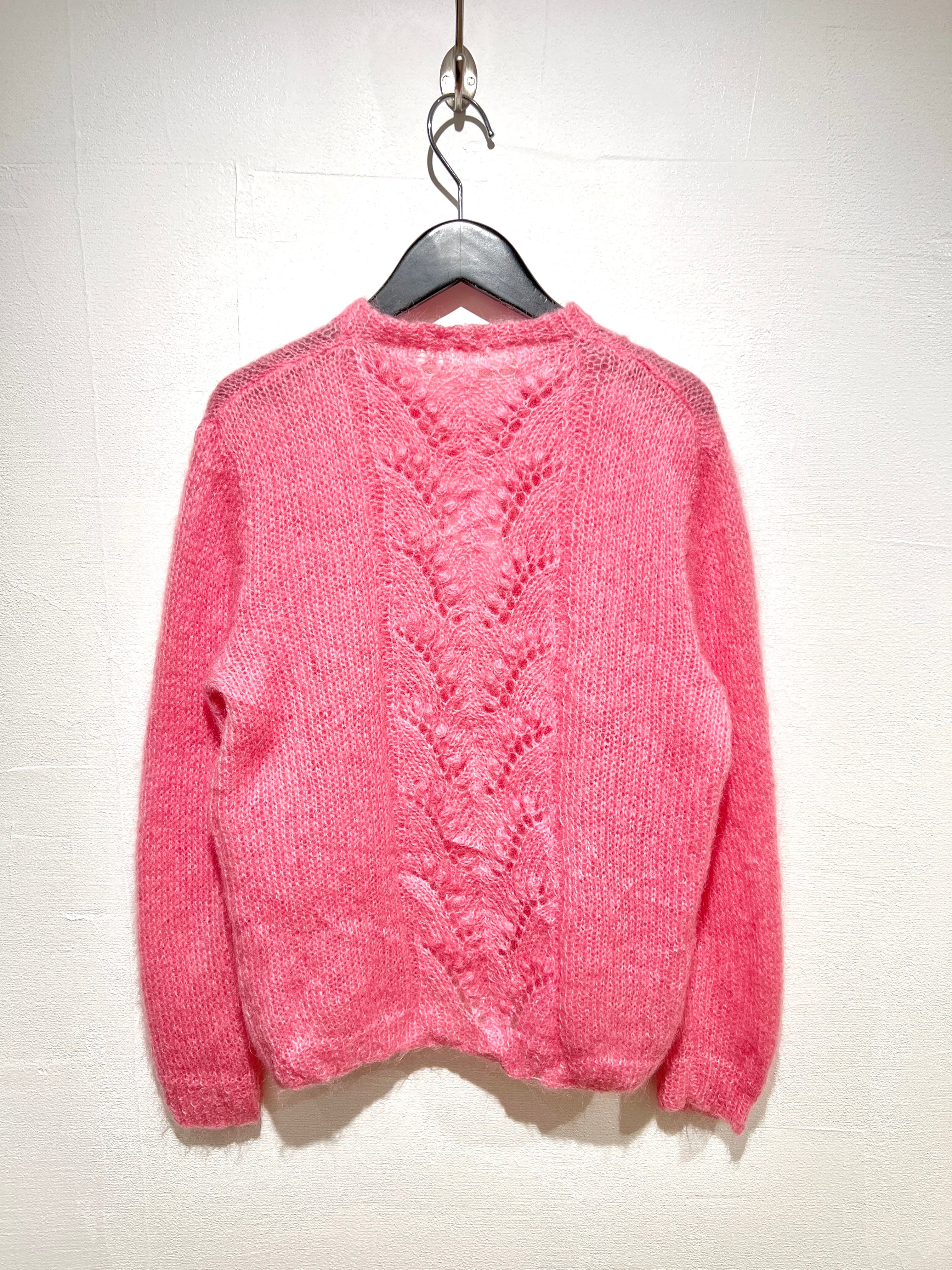 ふわっと軽いモヘアと思われる毛足のあるピンクカラーとすずらんの花のような編みが可愛いデザインです。