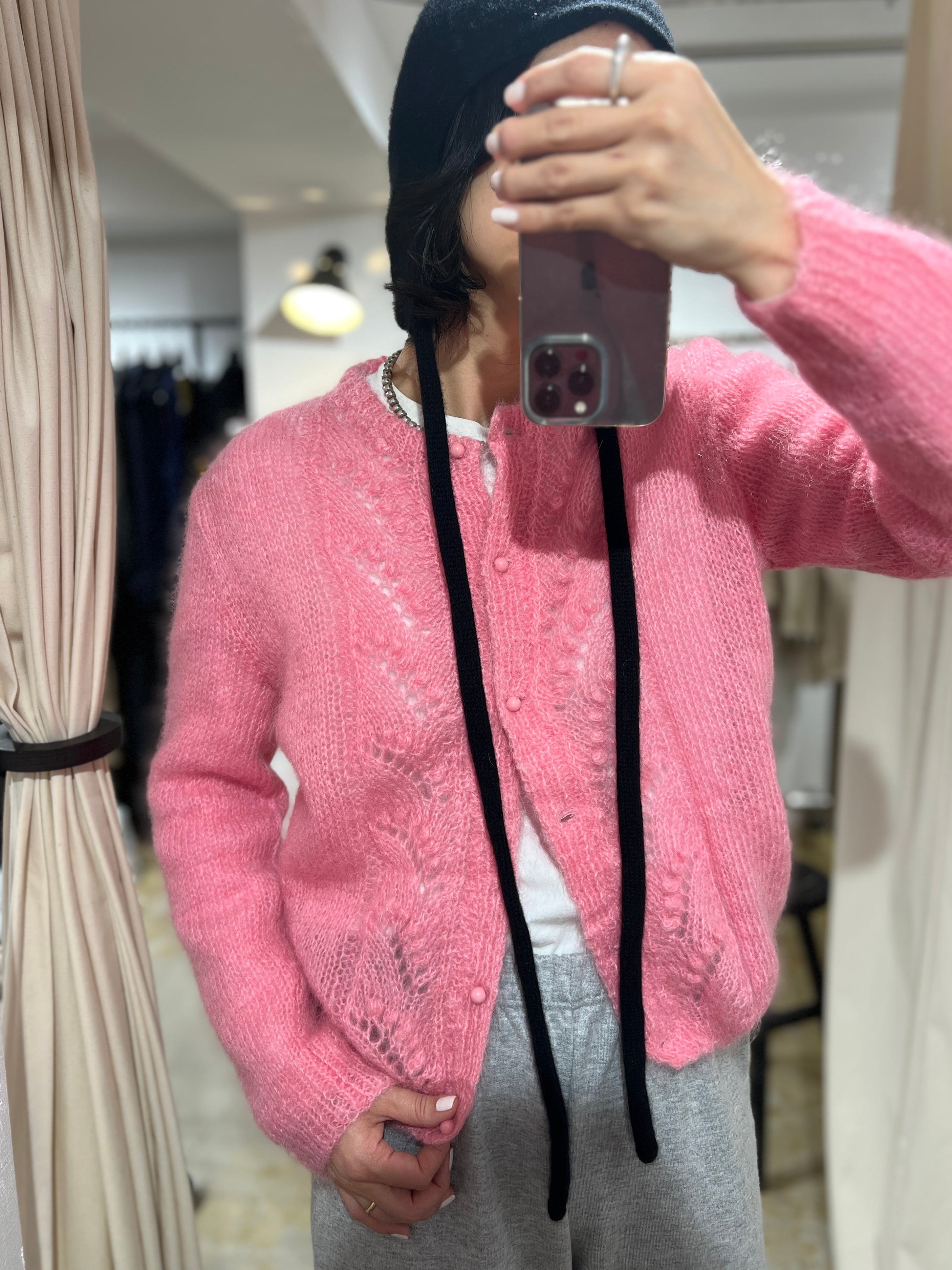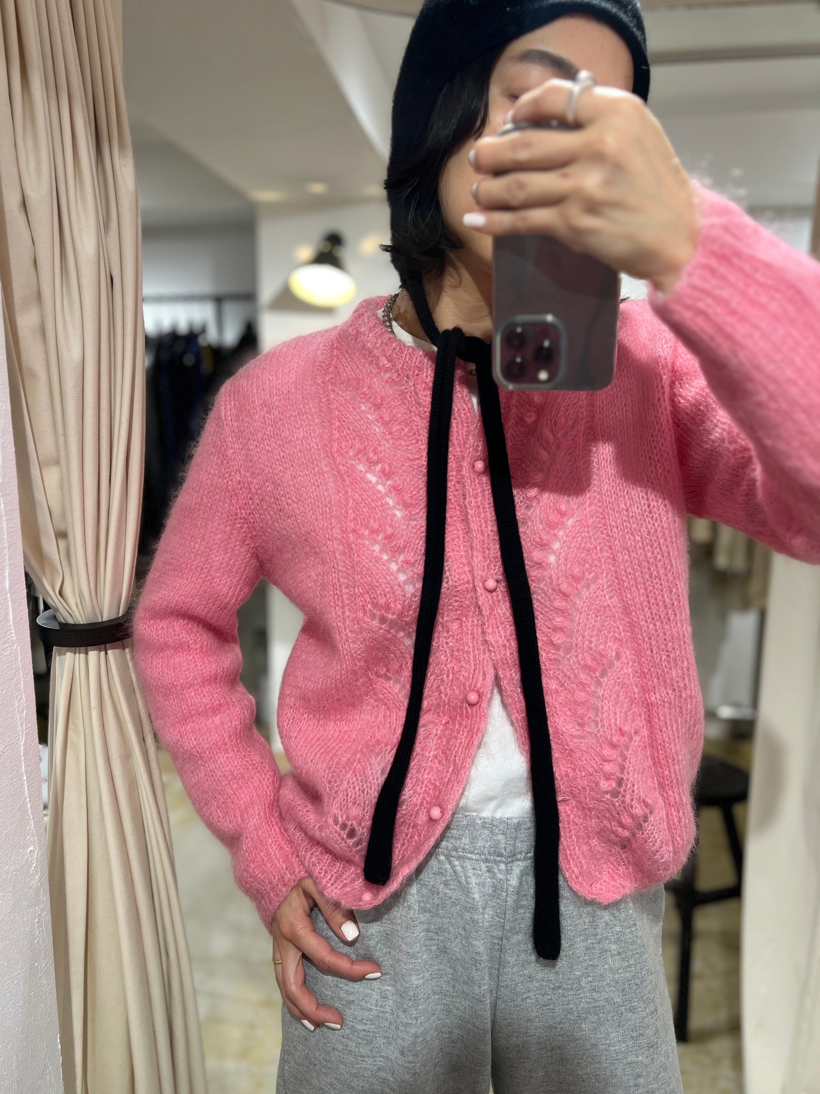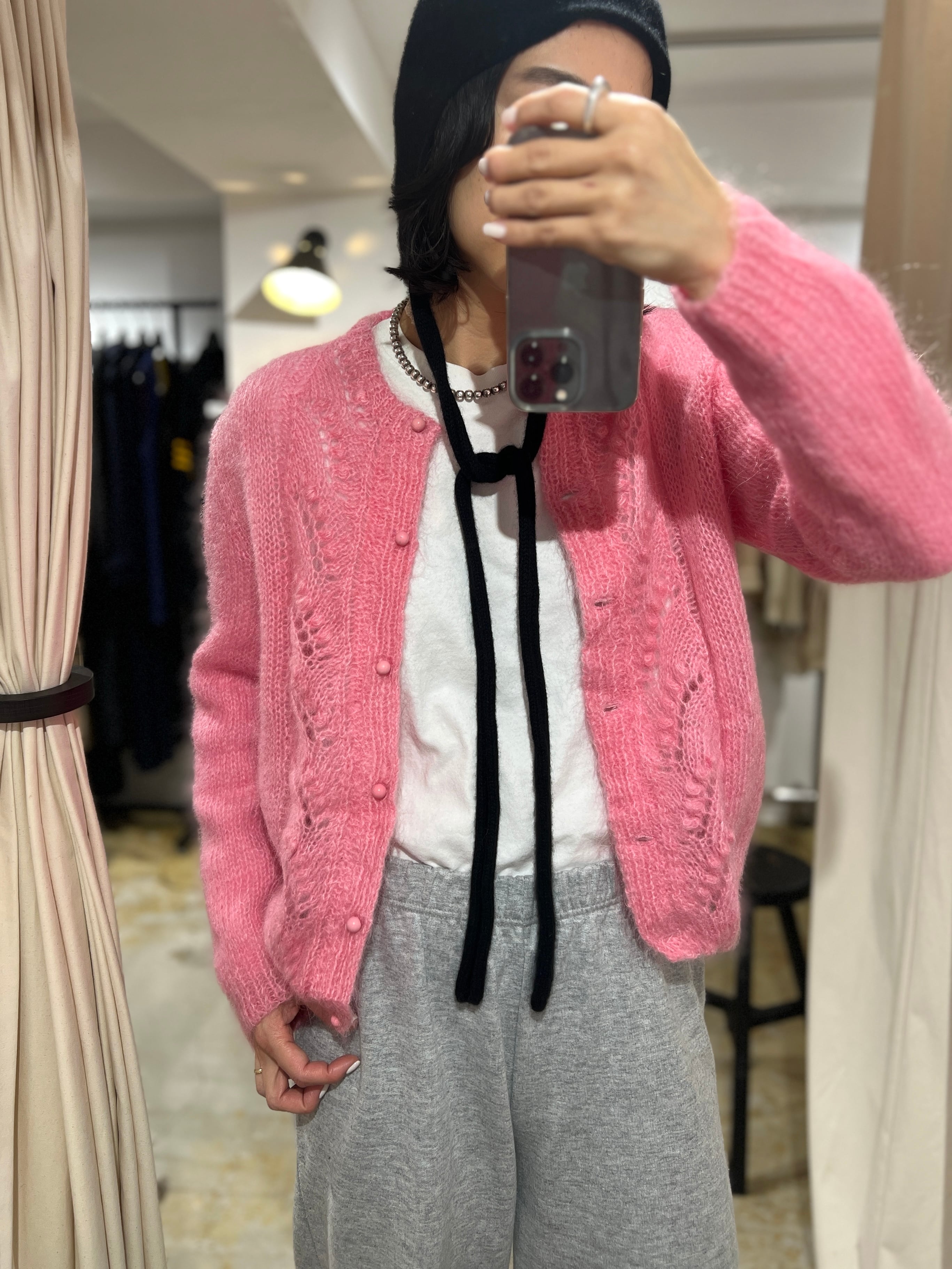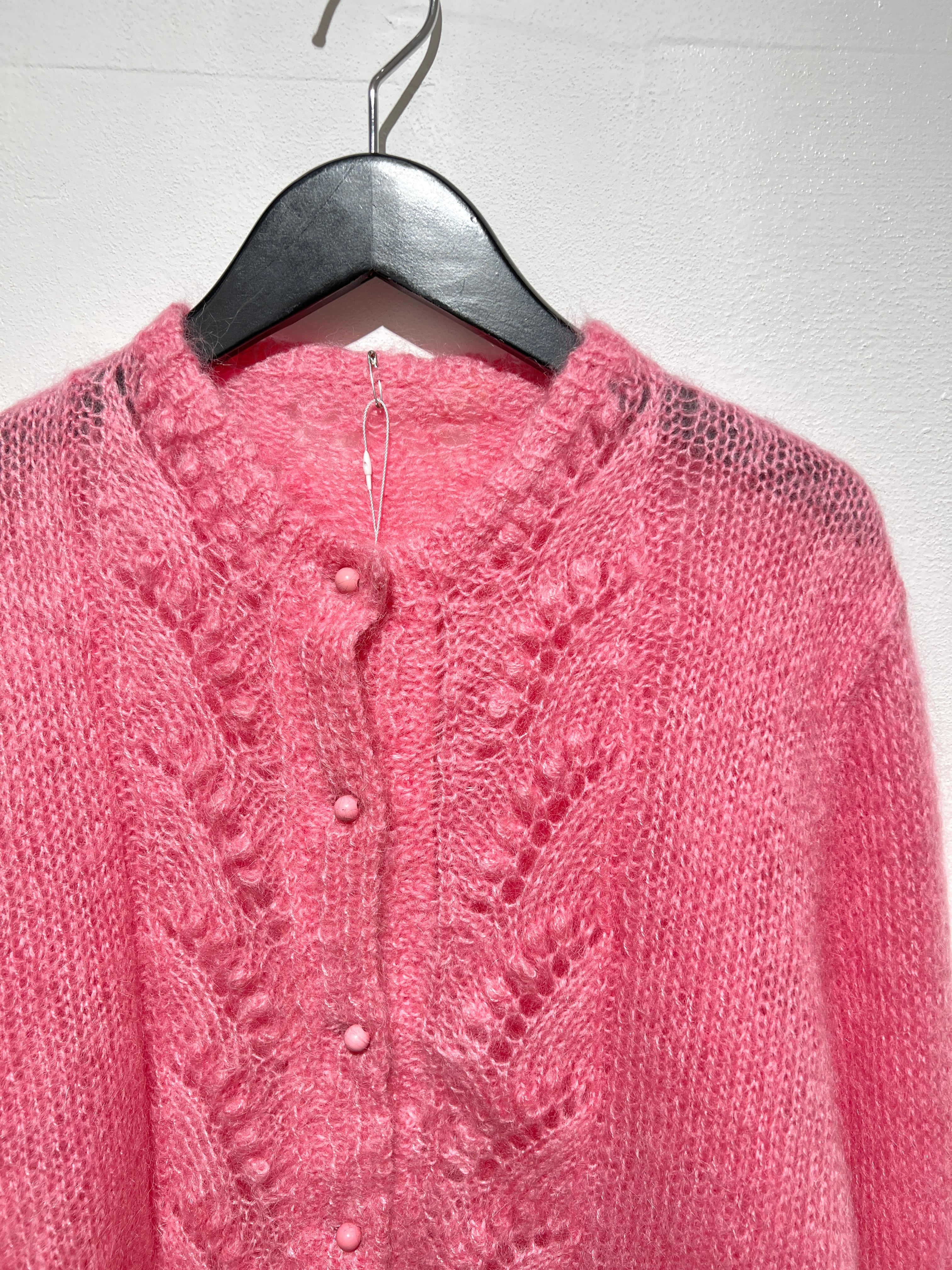 ふわっと軽いモヘアと思われる毛足のあるピンクカラーとすずらんの花のような編みが可愛いデザインです。