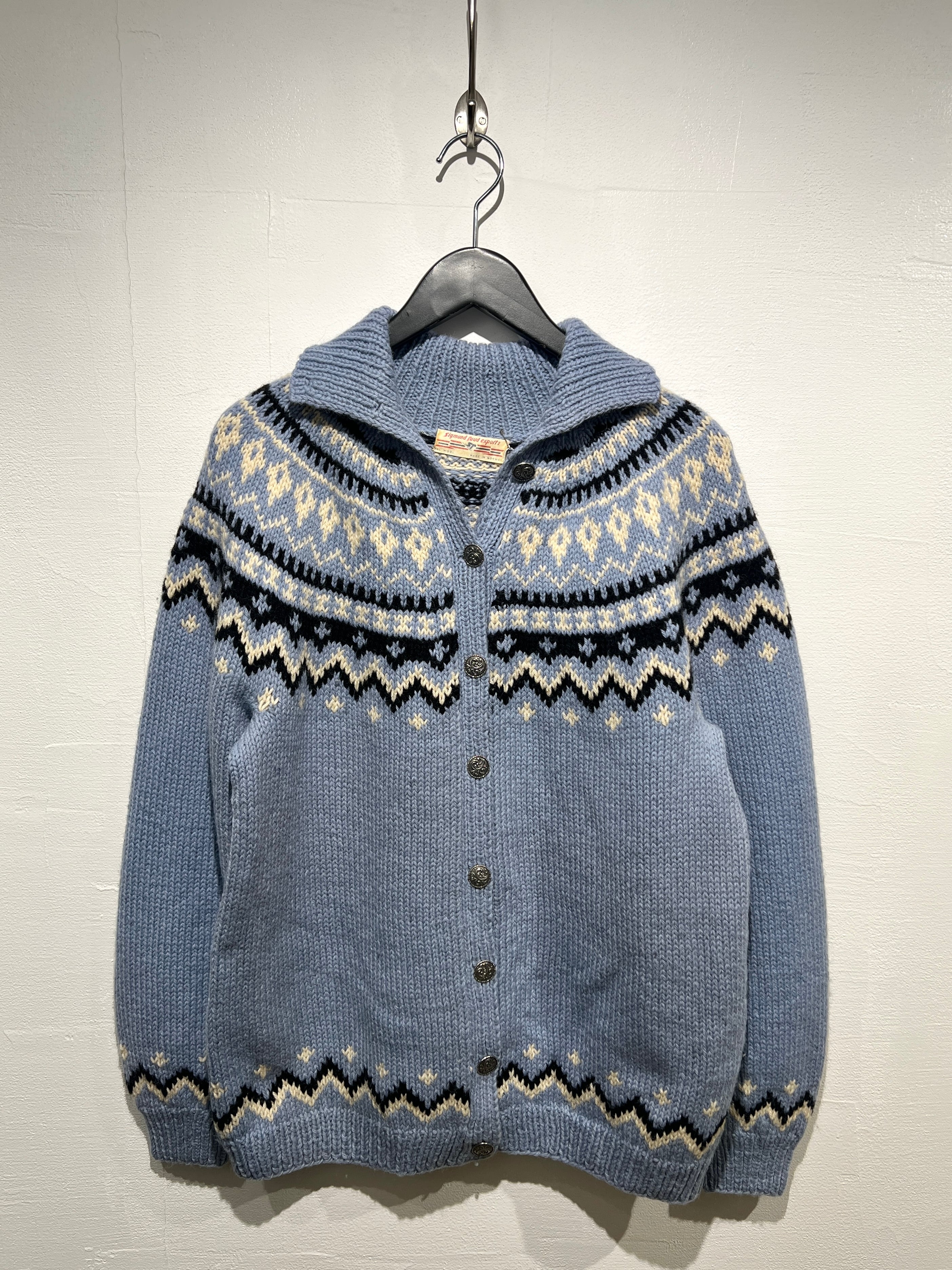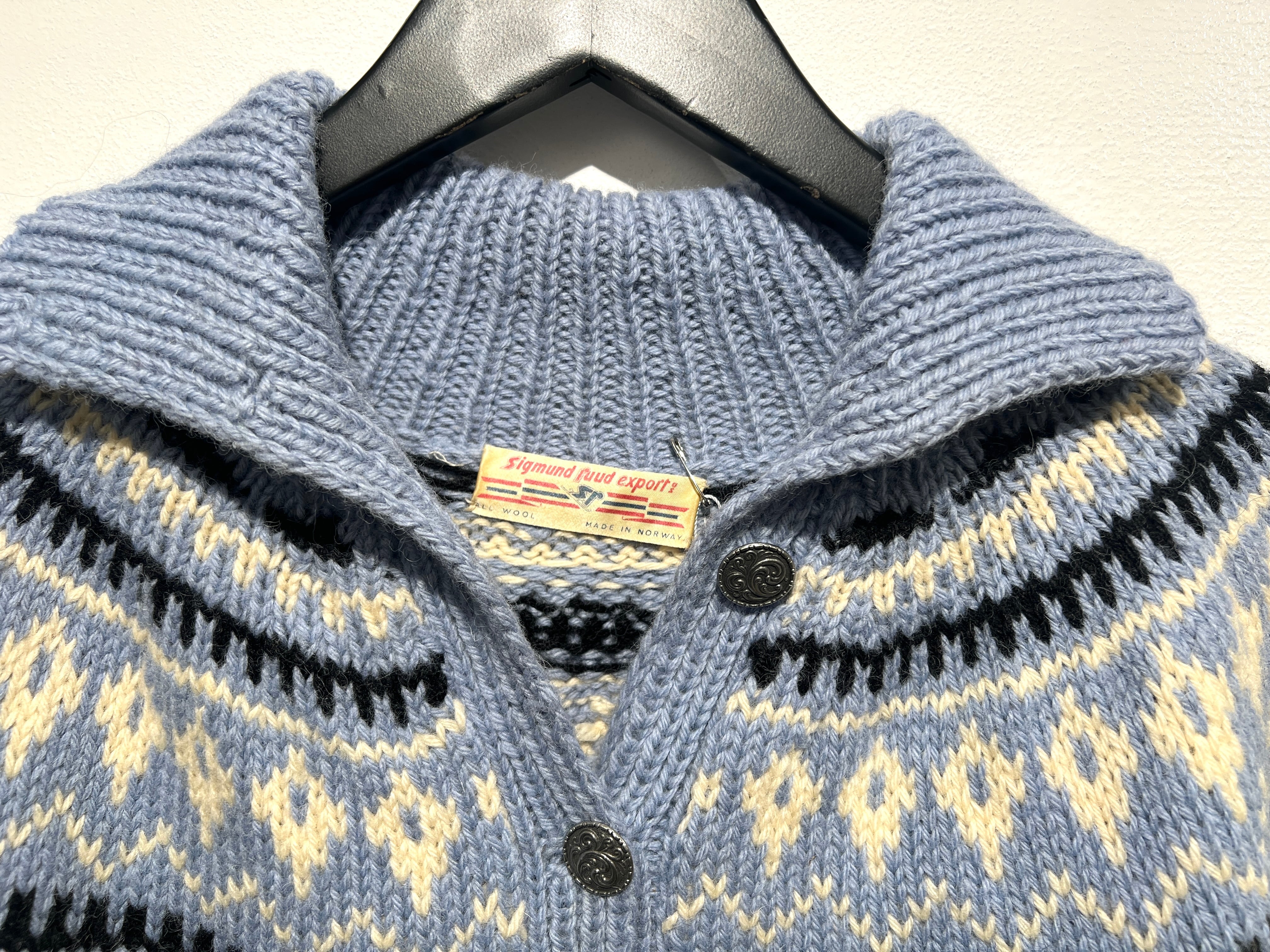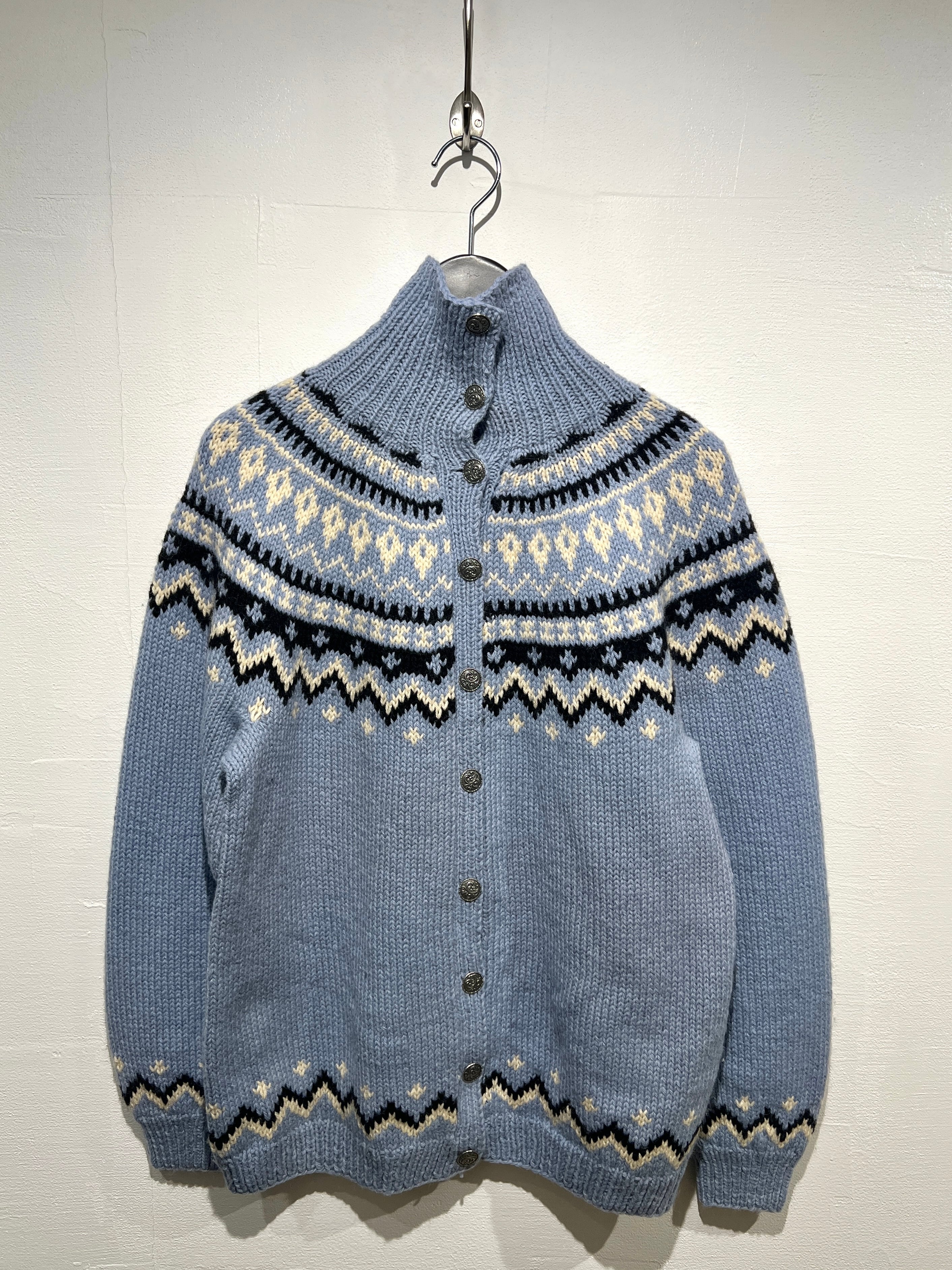 水色にハイネックが可愛いノルウェー製のノルディック柄ニットカーディガン。