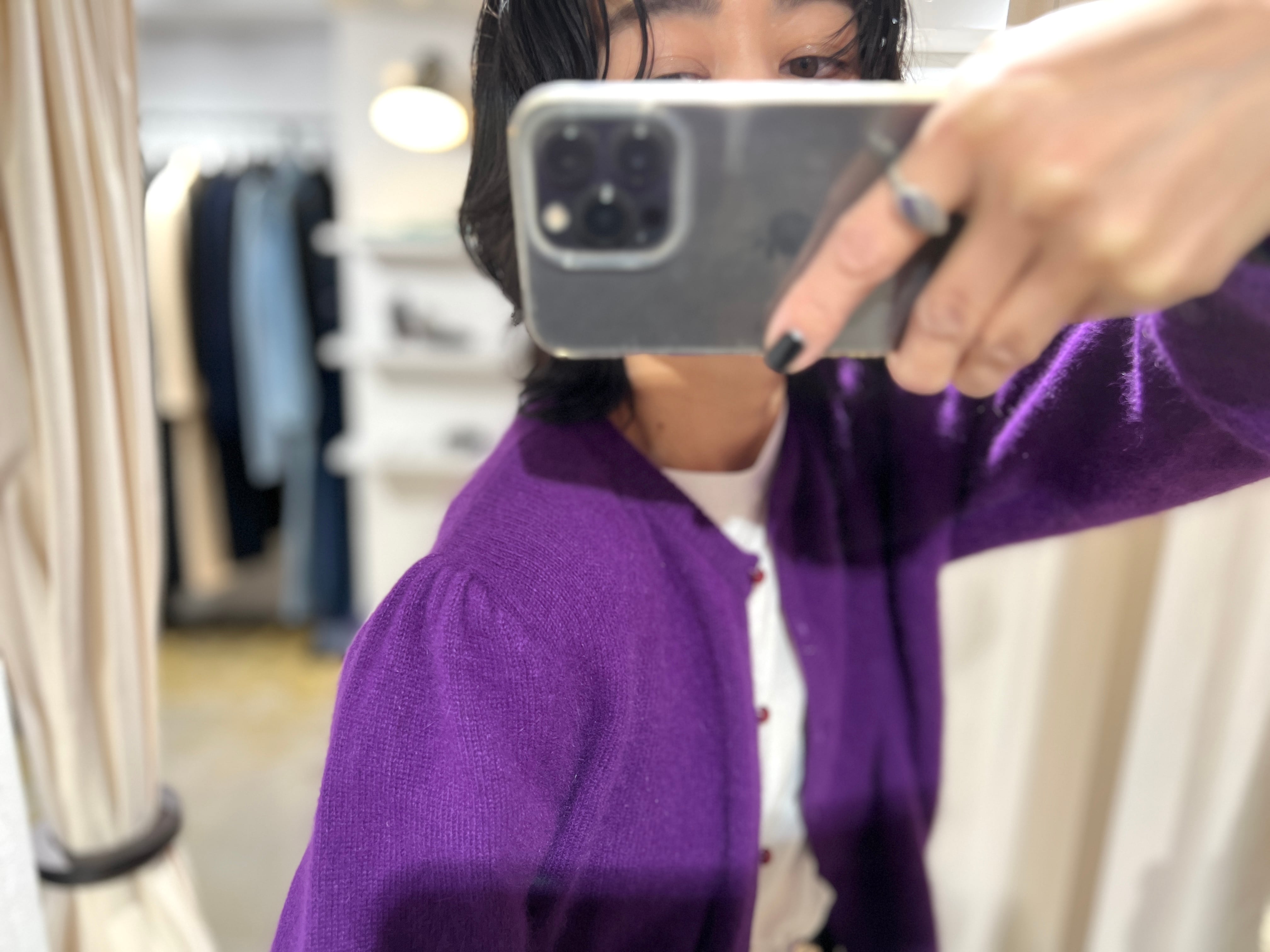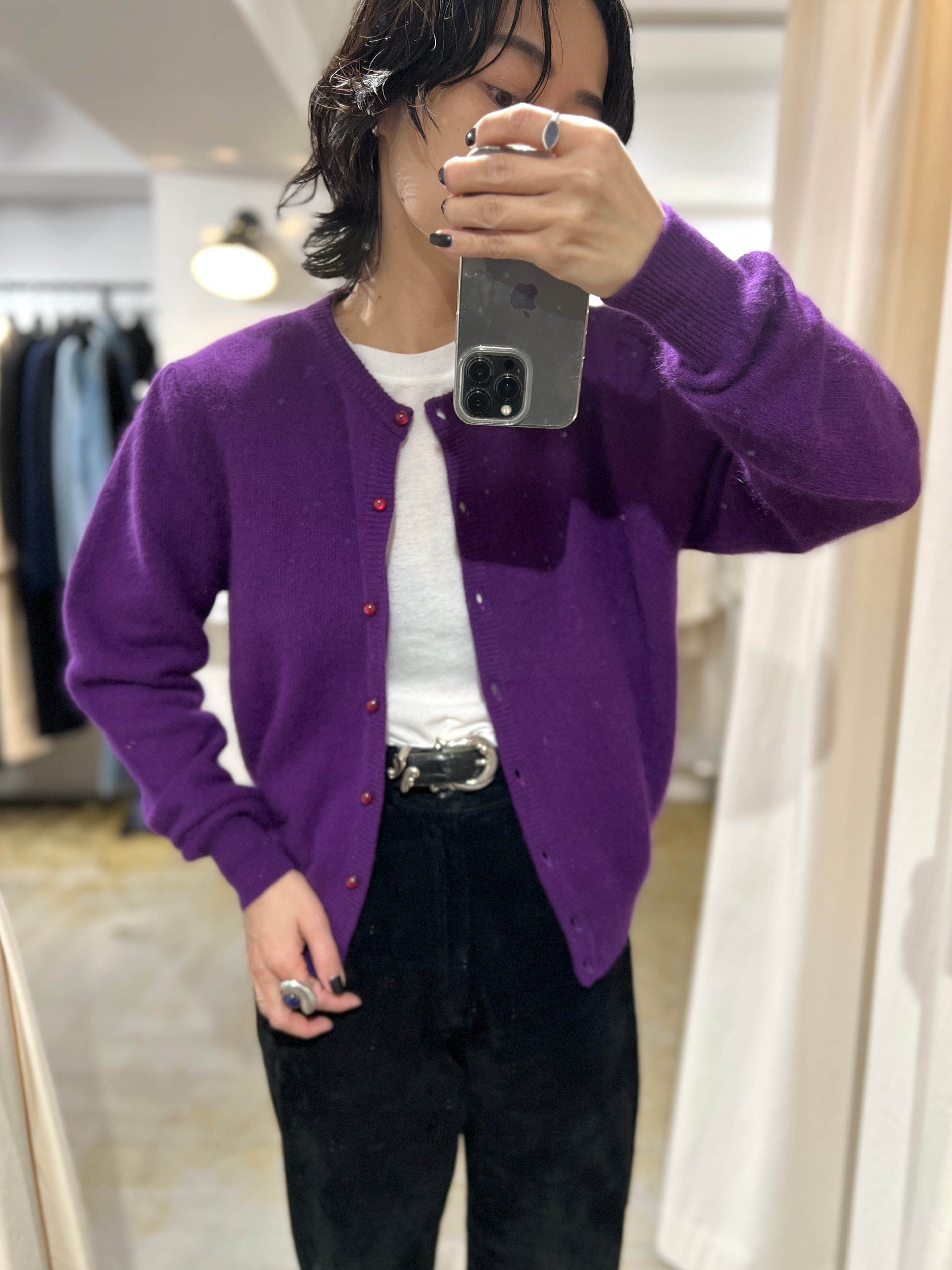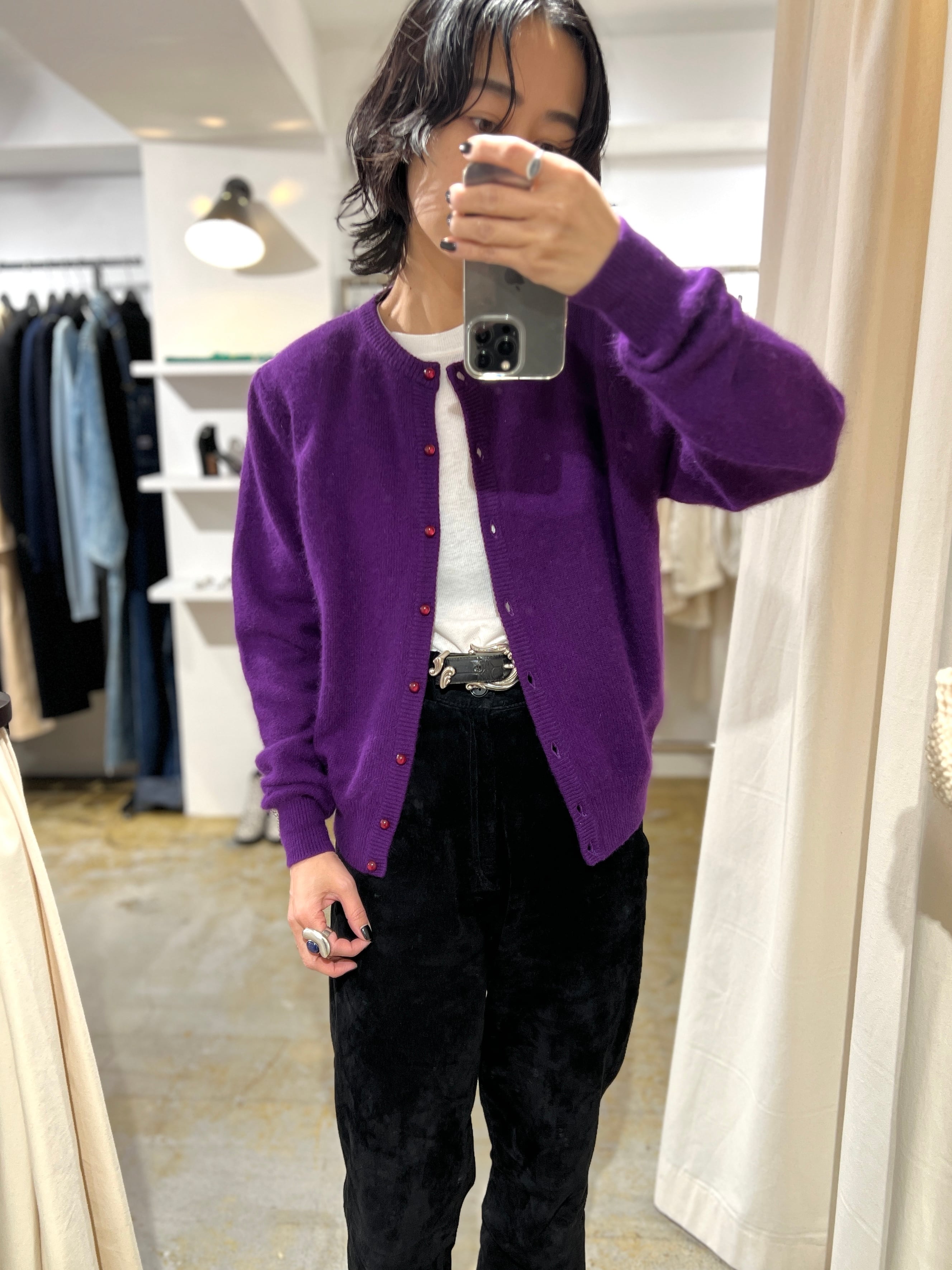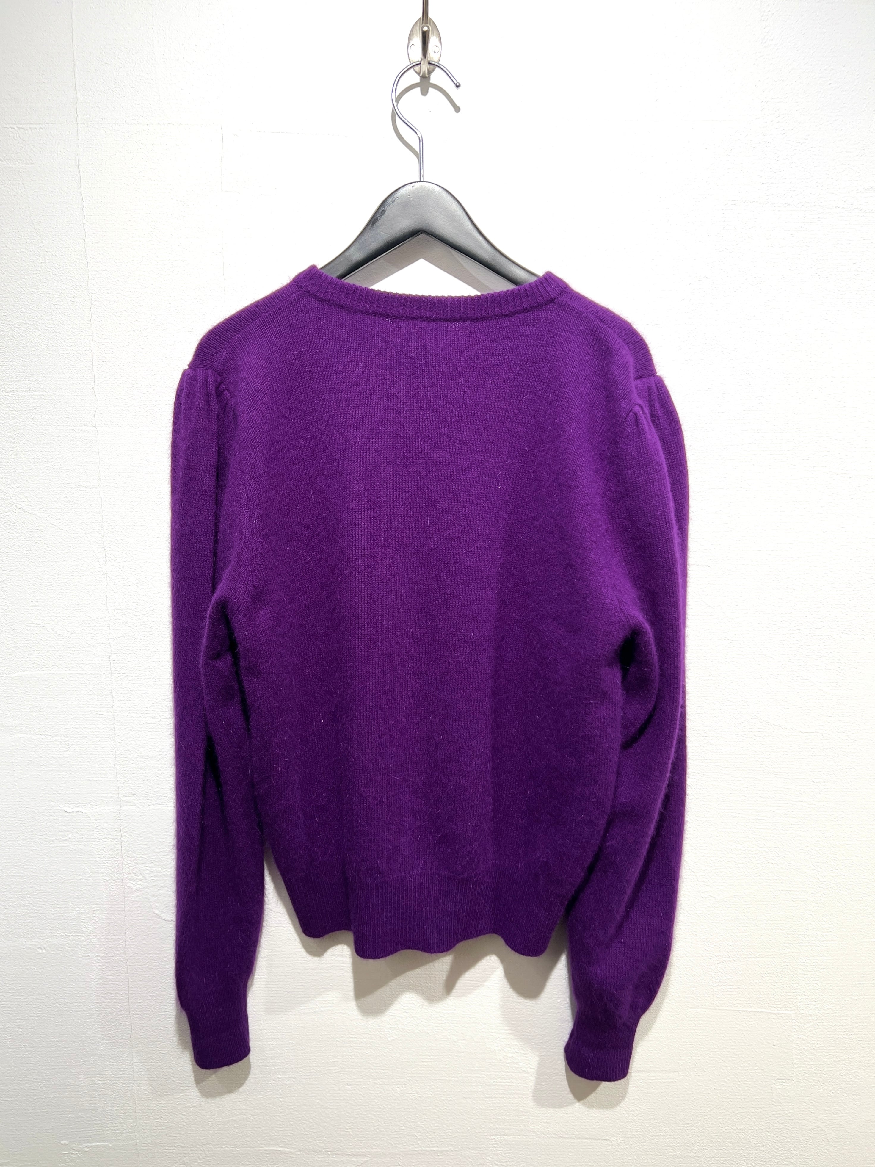 ふわふわのアンゴラ素材にたくさん付いたボタンと肩のパプスリーブが可愛い80年代のニットカーディガン。