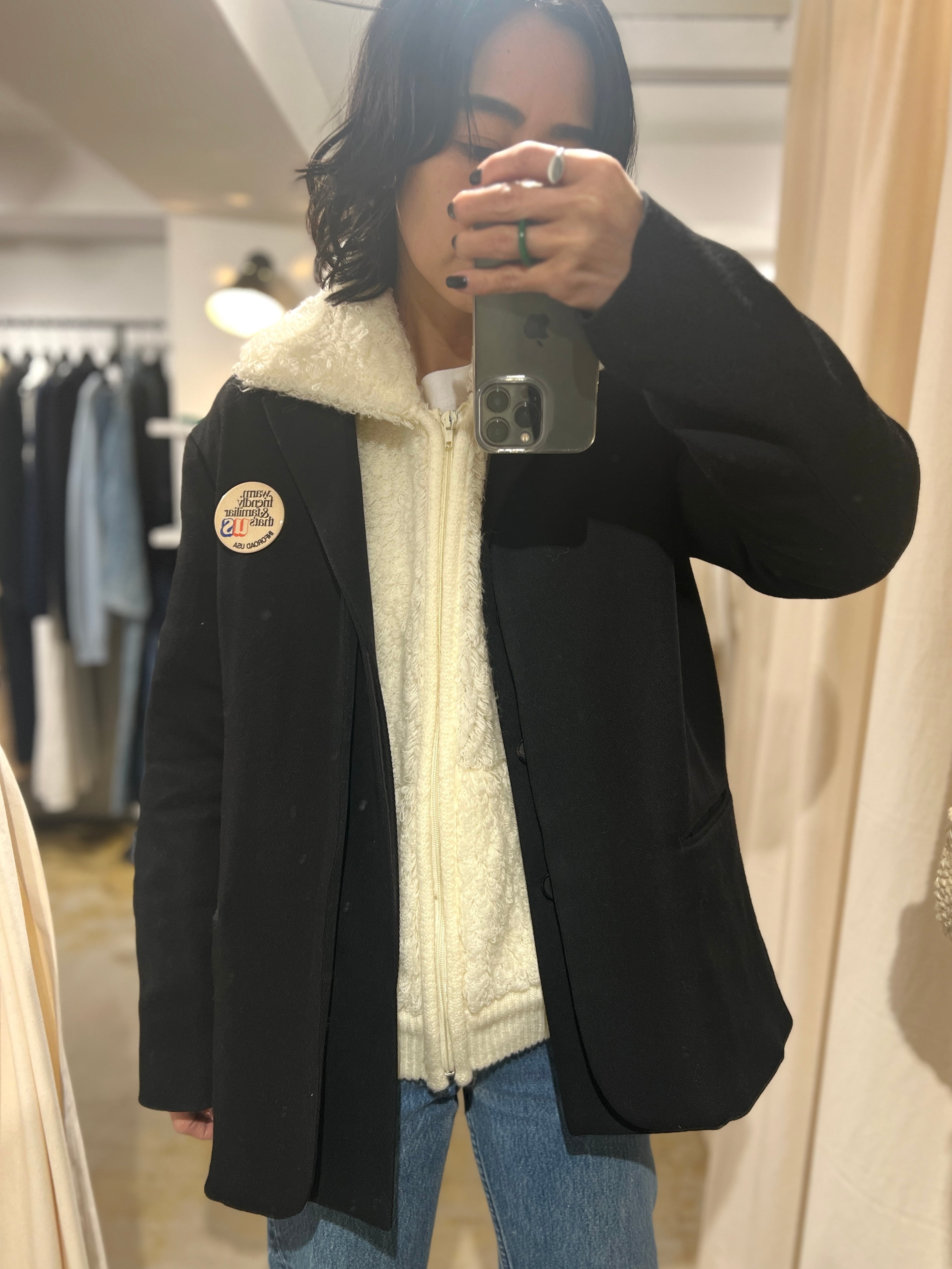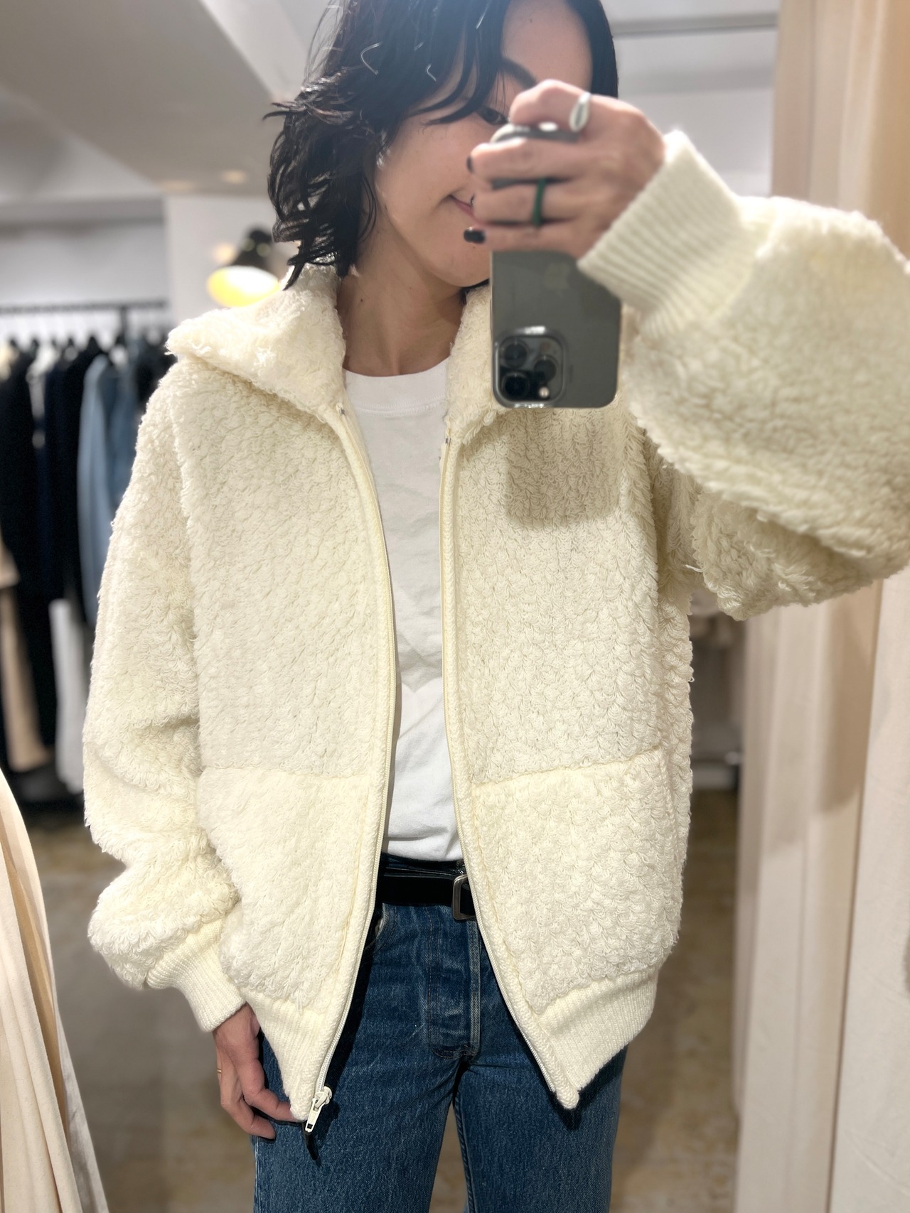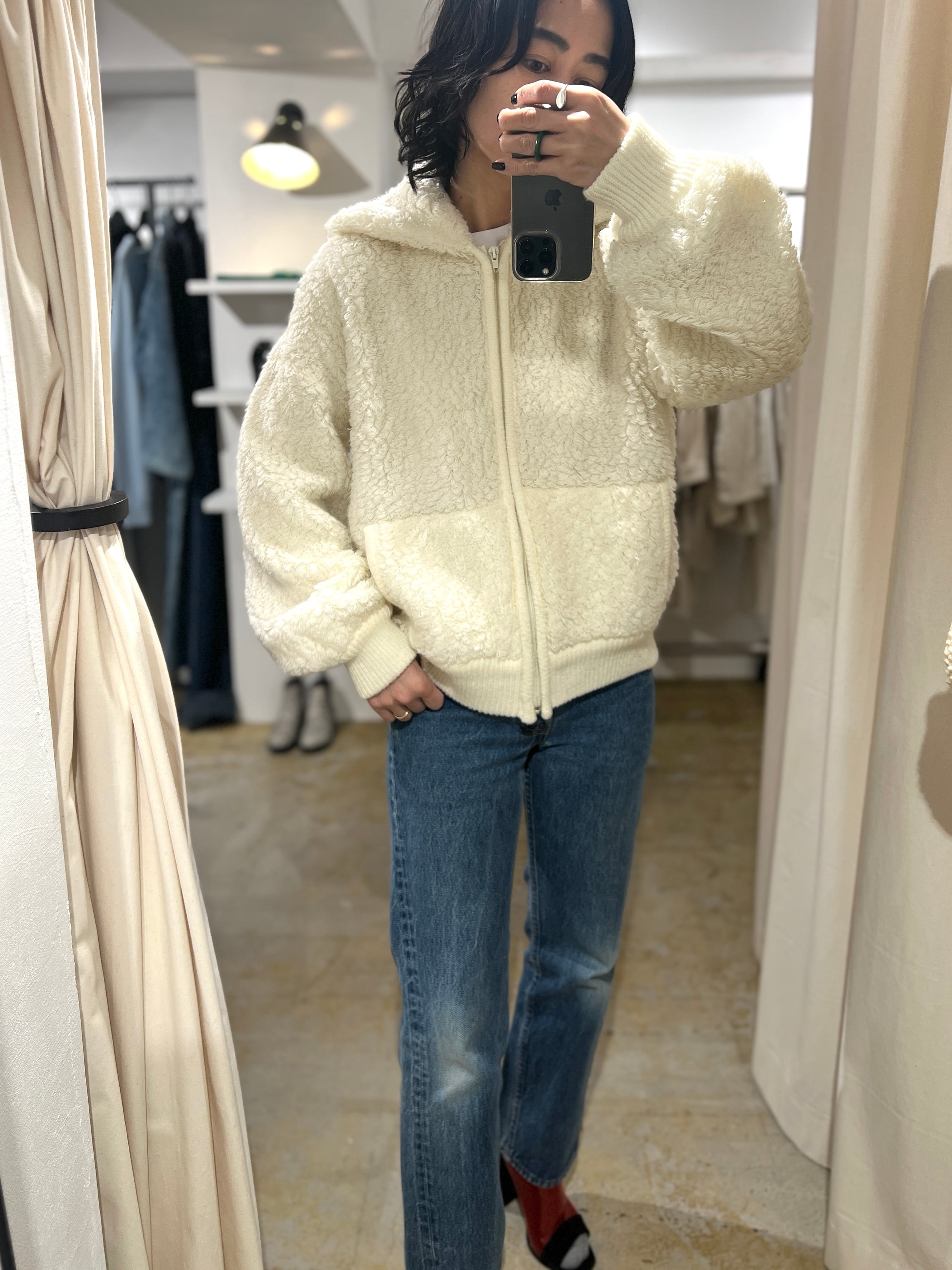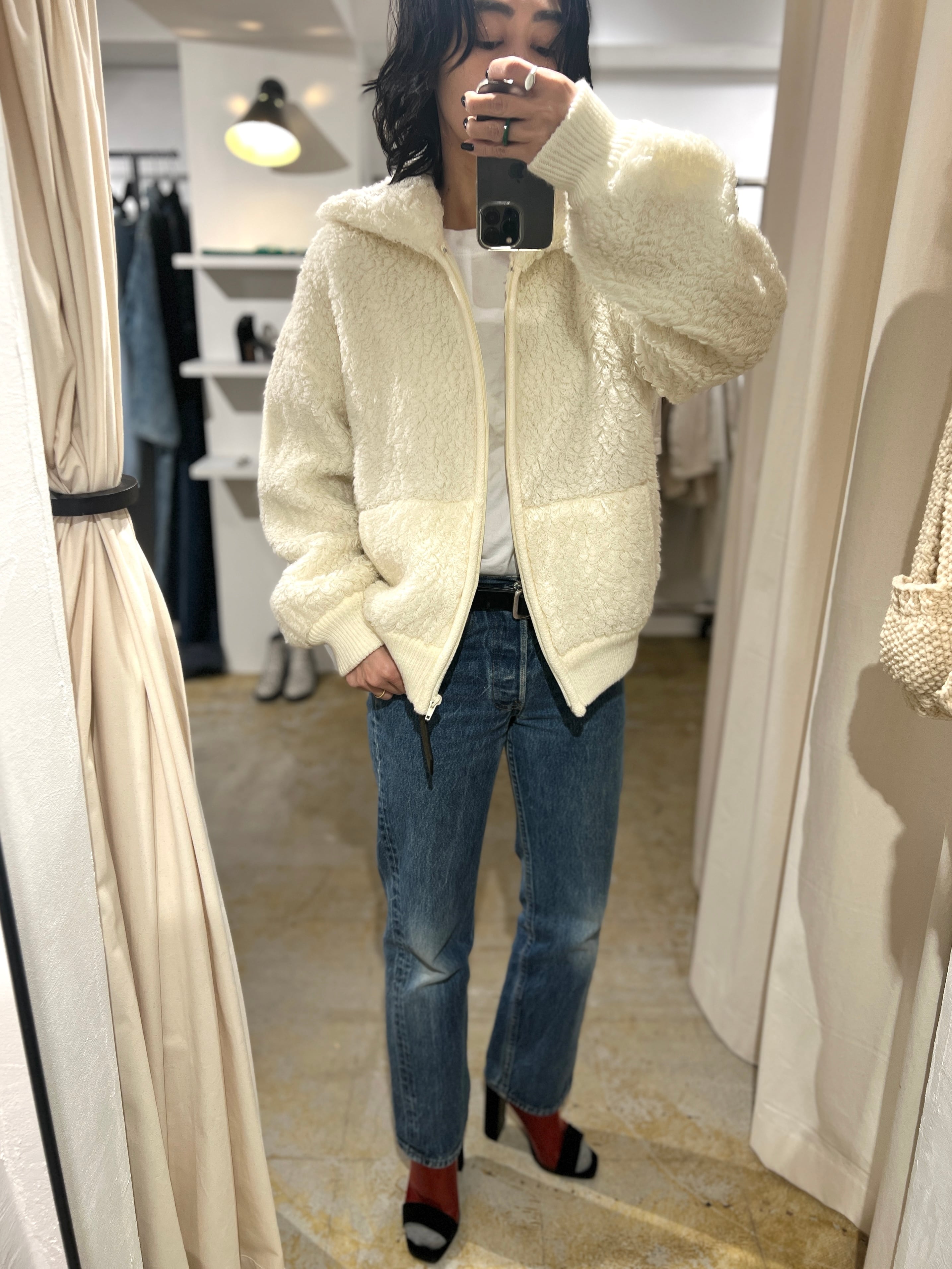 カーディガンではなくジップアップなのが素敵で、裏地は無いので真冬のアウターにはなりませんが、ゆったりしたコートやジャケットを合わせることが出来るので襟のレイヤードも可愛いです。