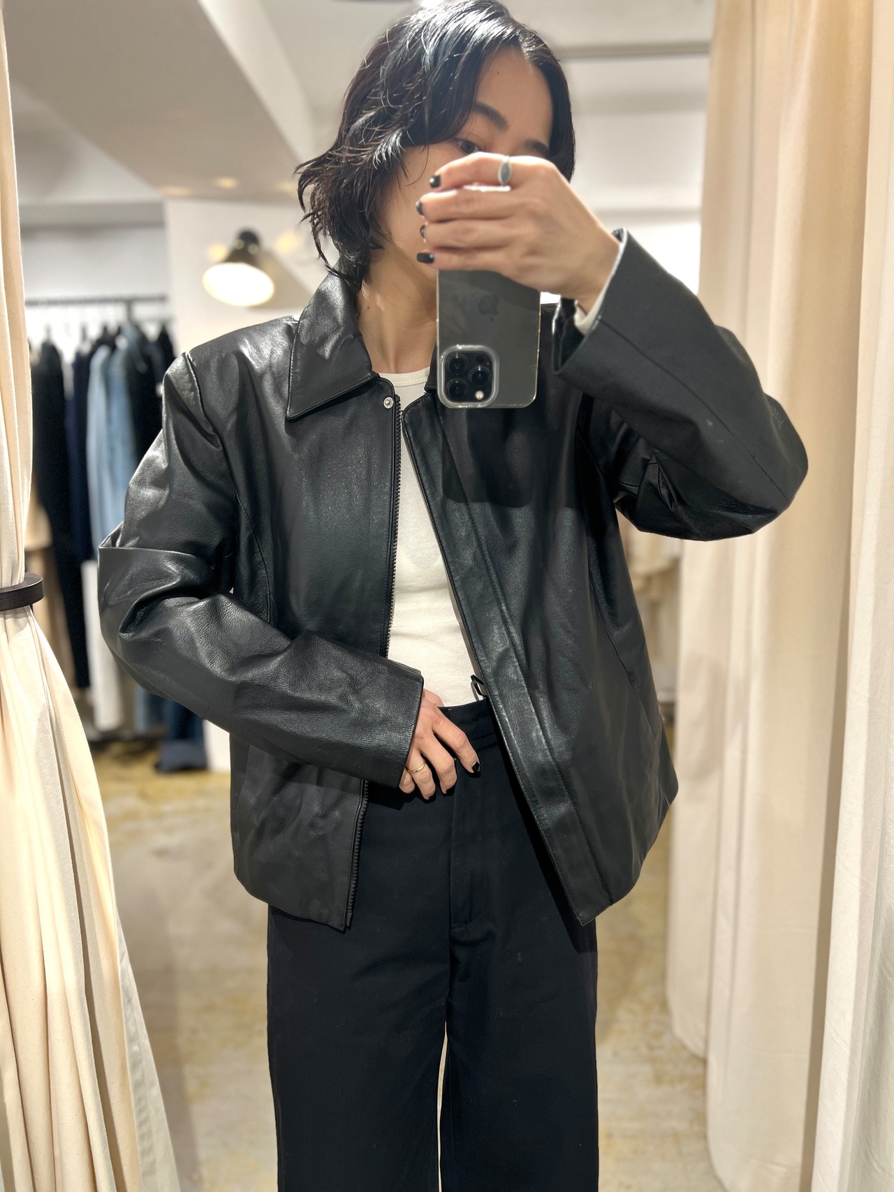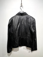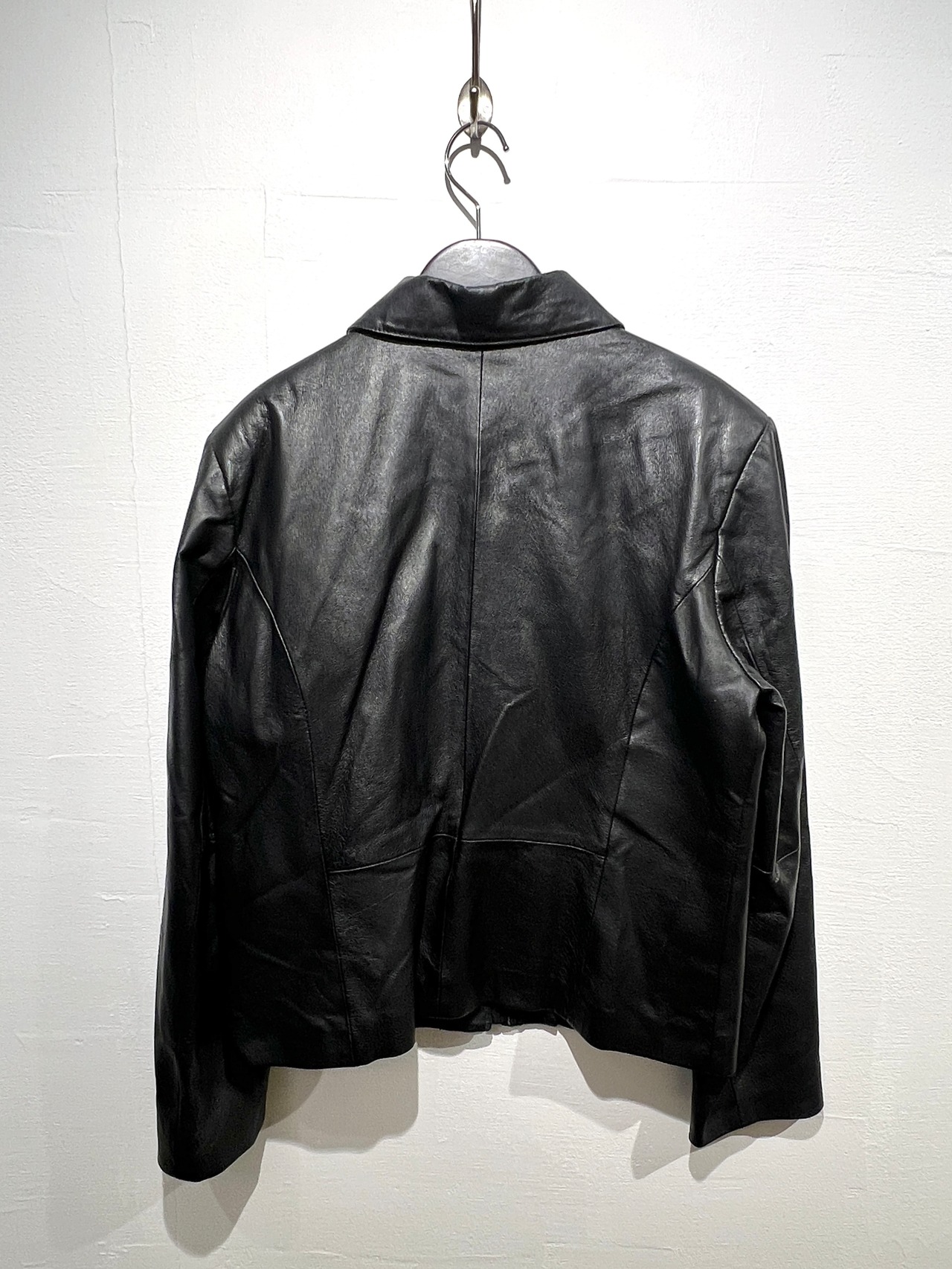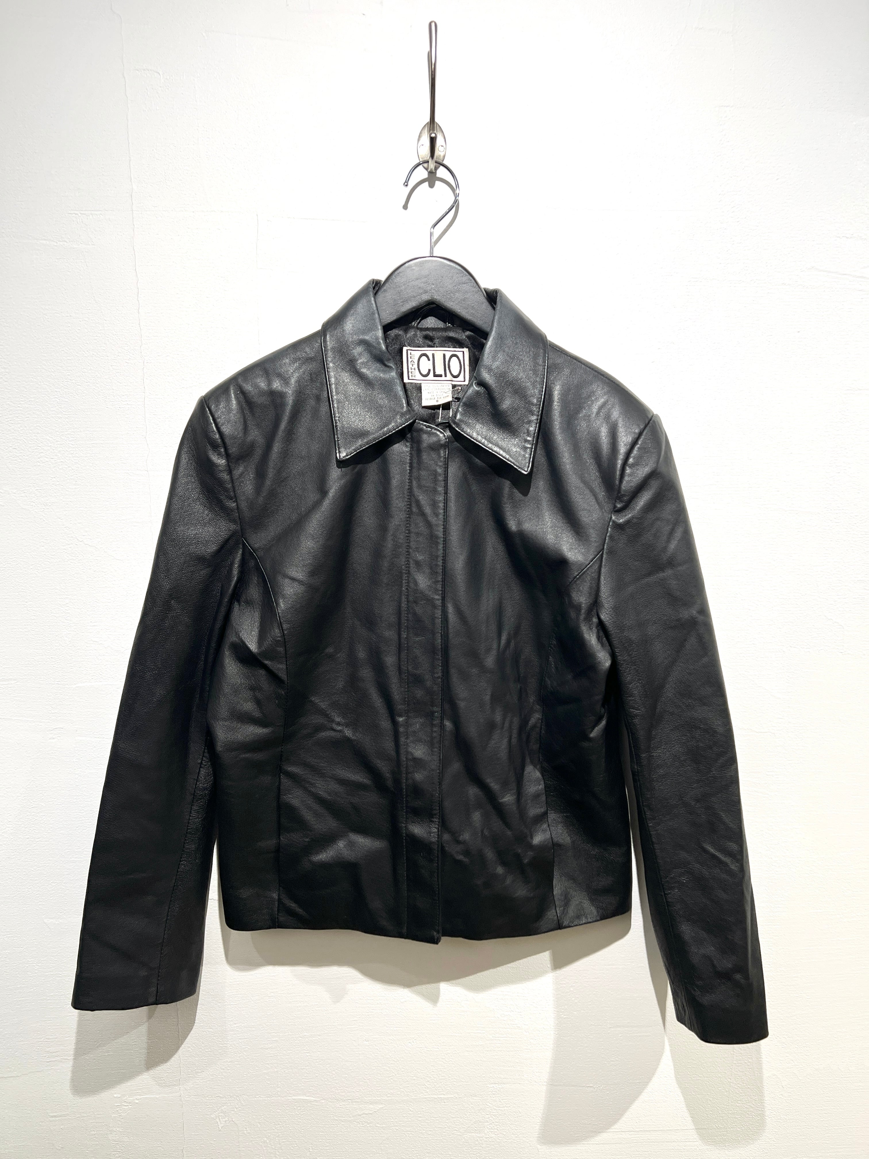 90年代らしい肩パッドのあるショルダーラインにやや着丈が短めのボックスシルエットが可愛いレザーのジップアップジャケット。
