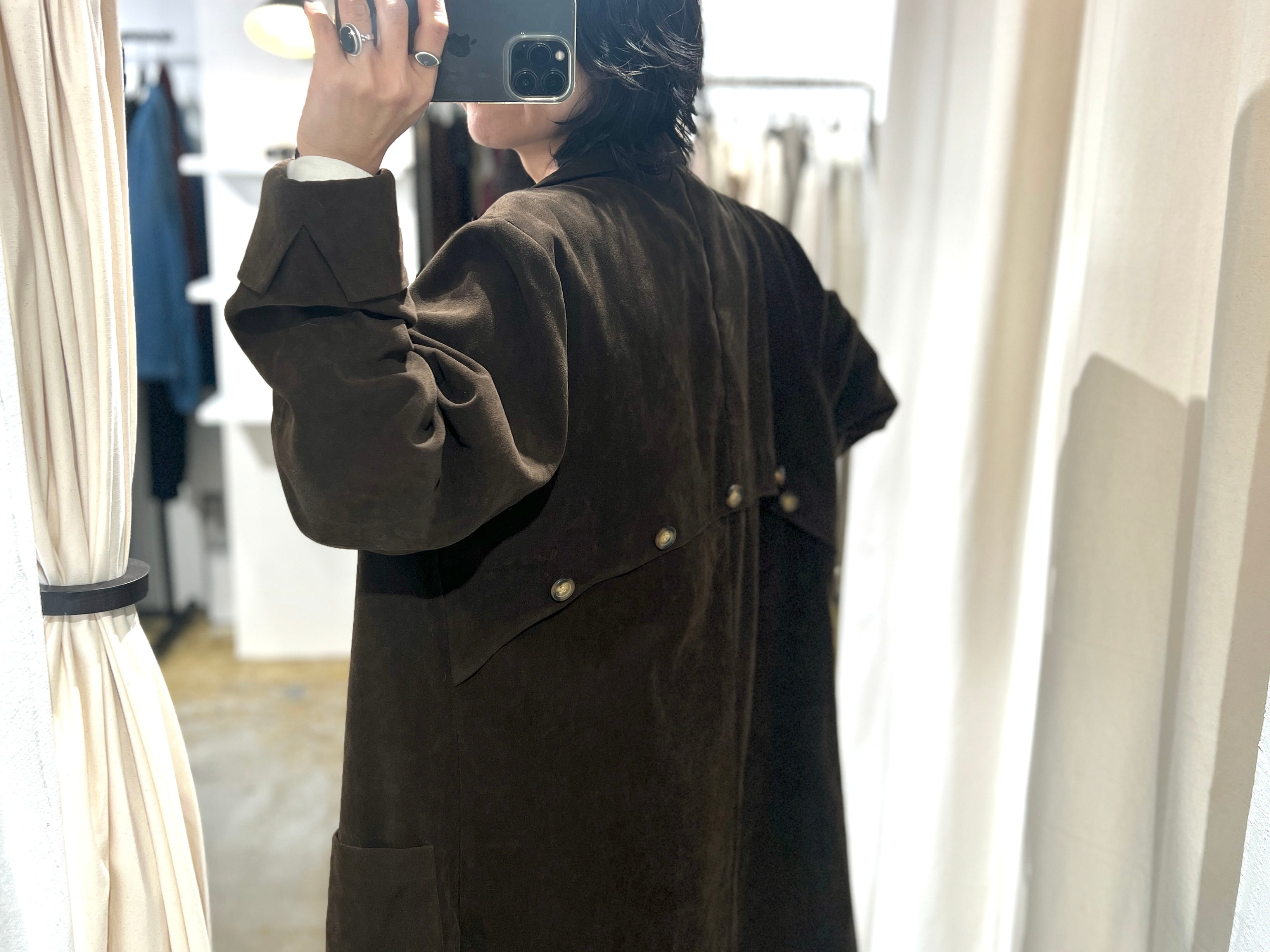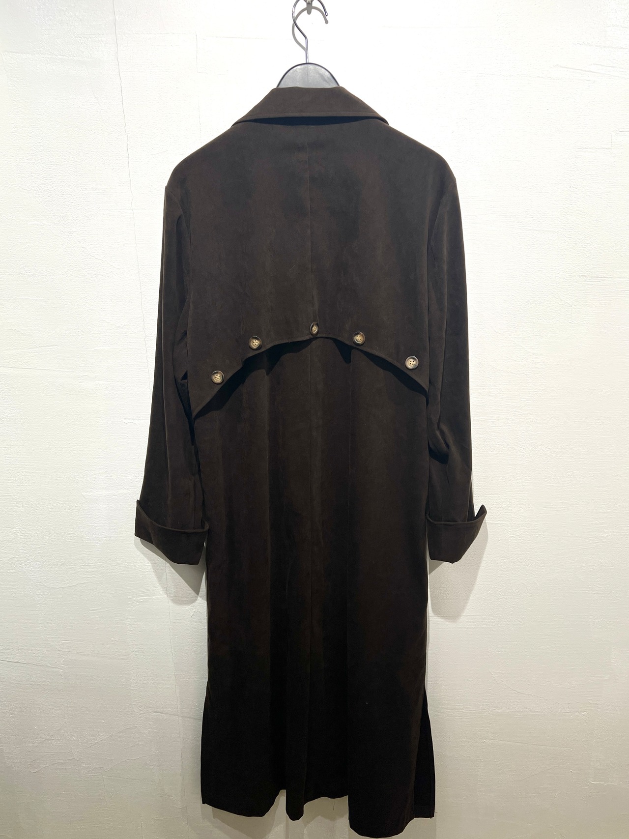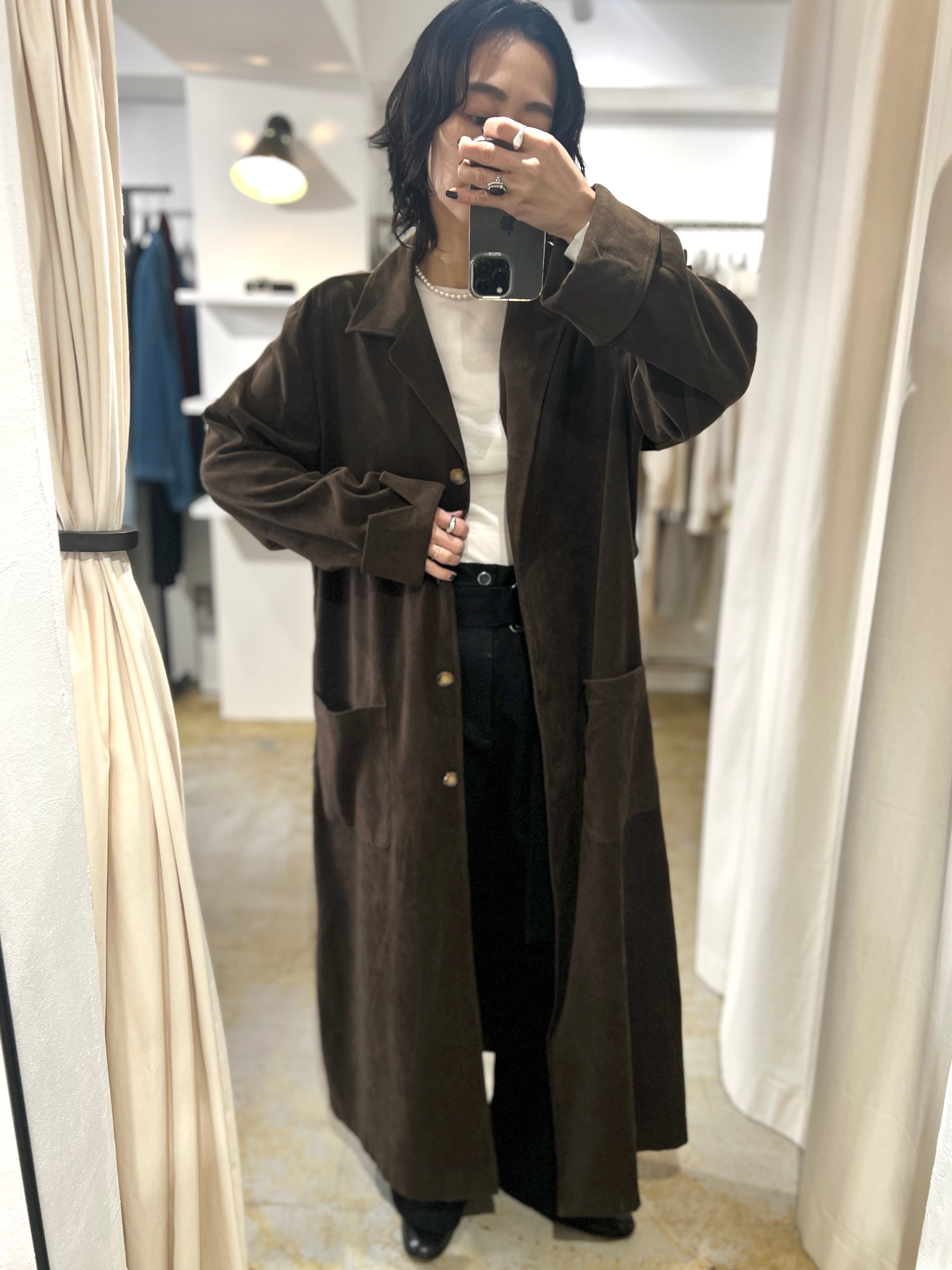 ゆったりしたサイズ感に軽い着心地のフェイクスエードのロングコート。