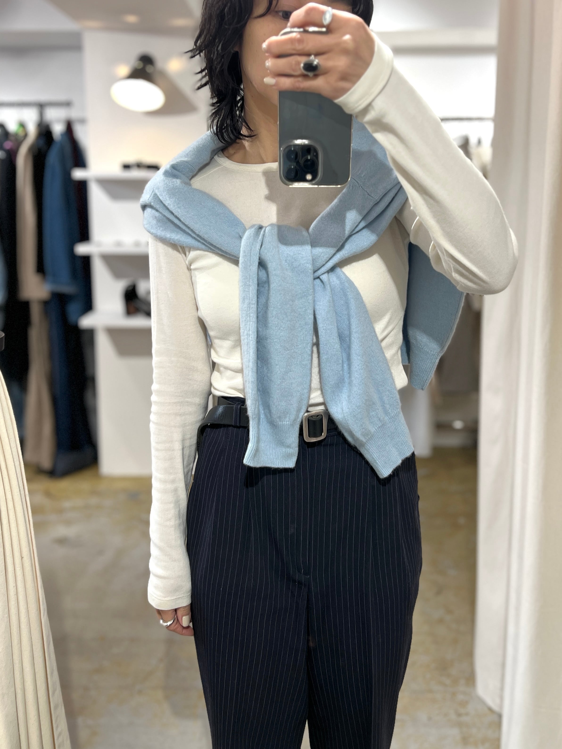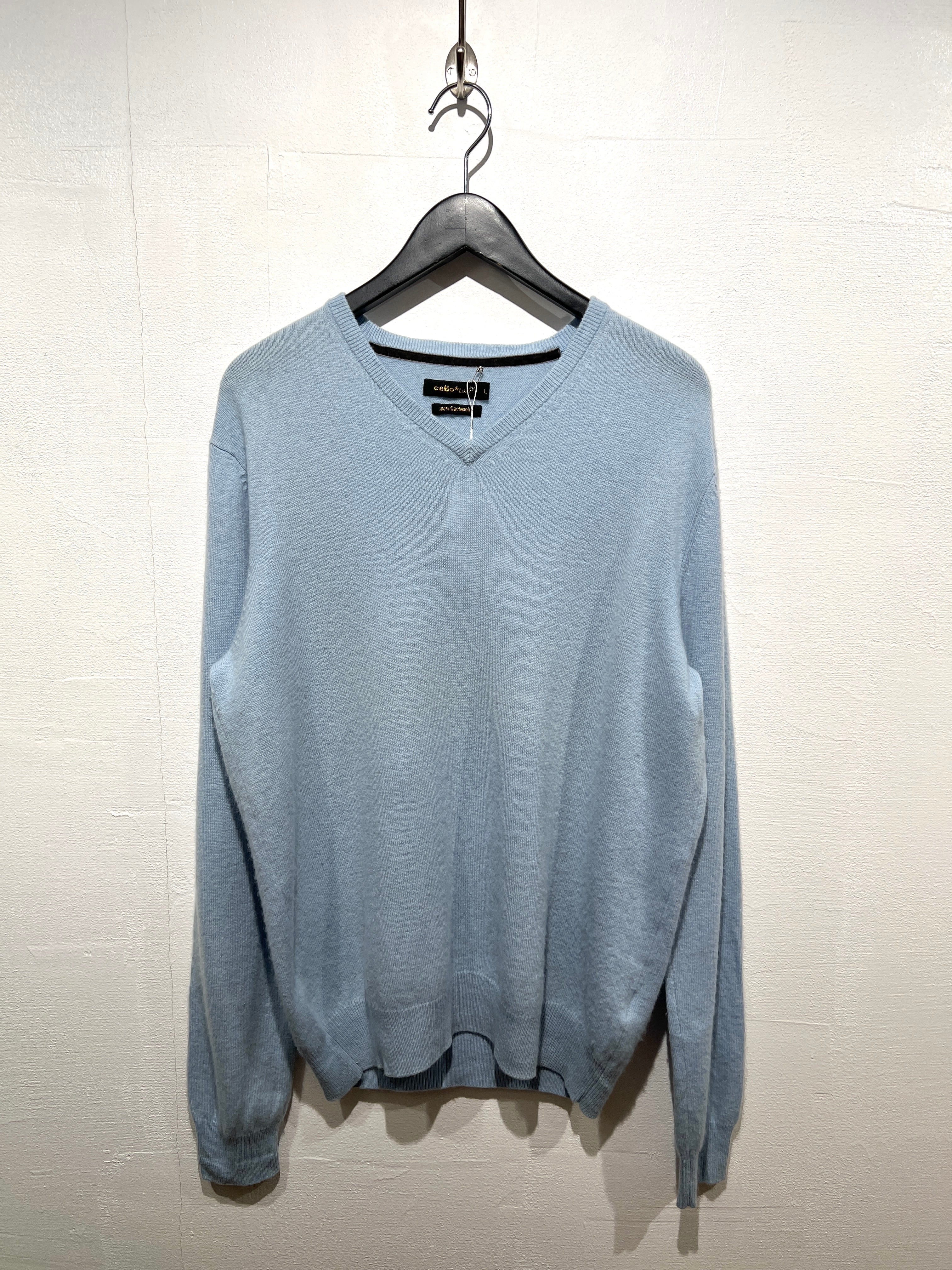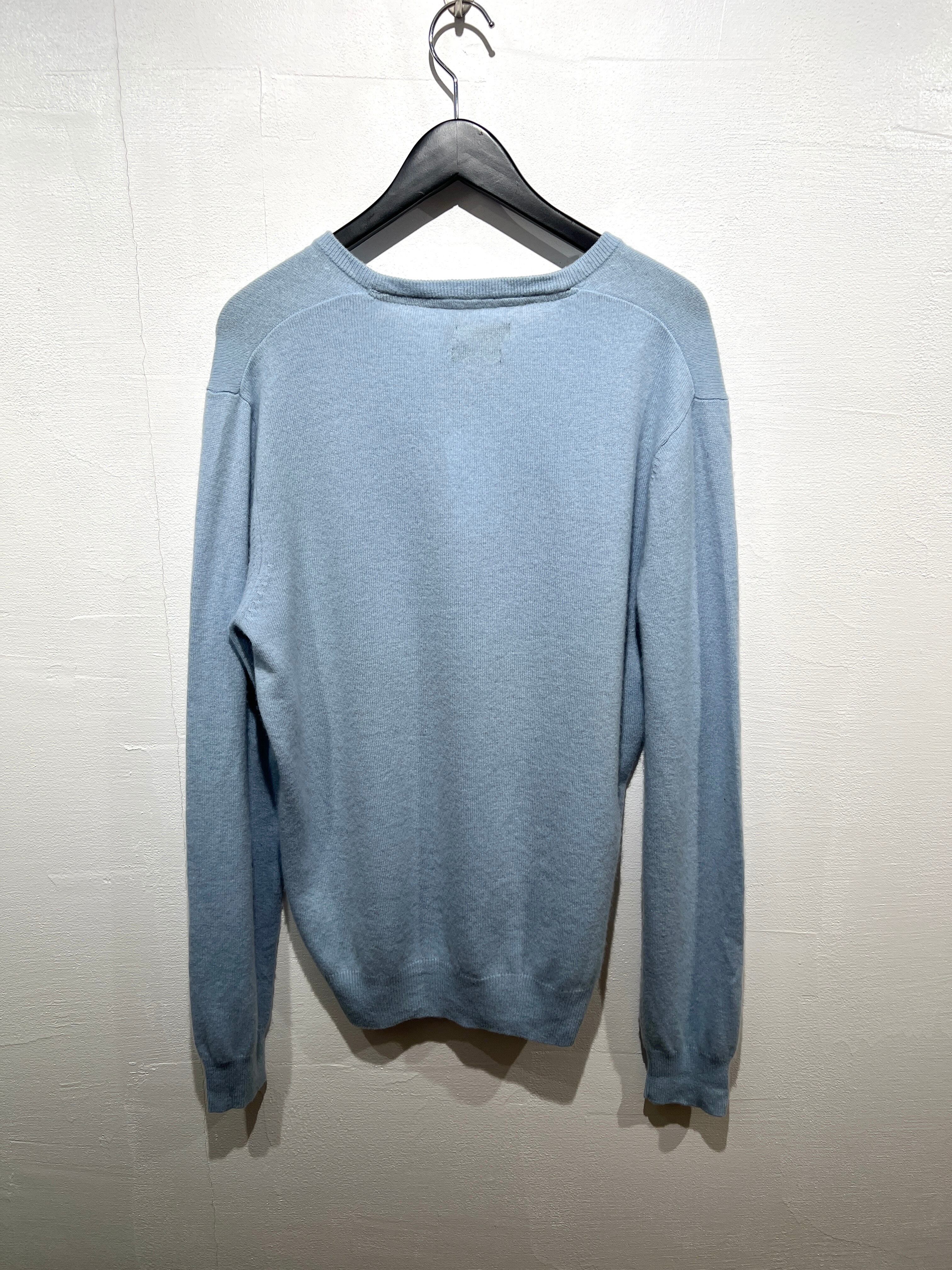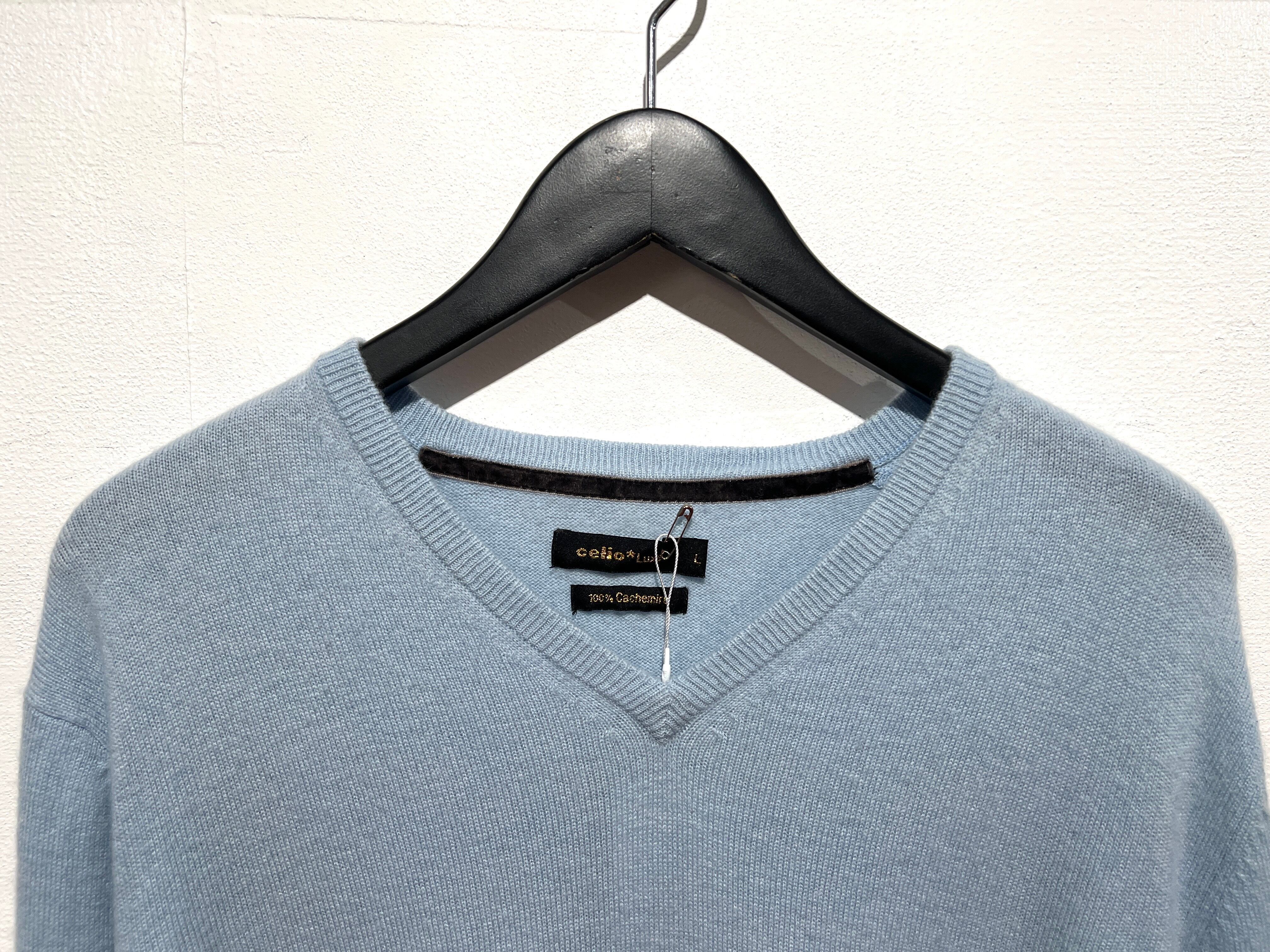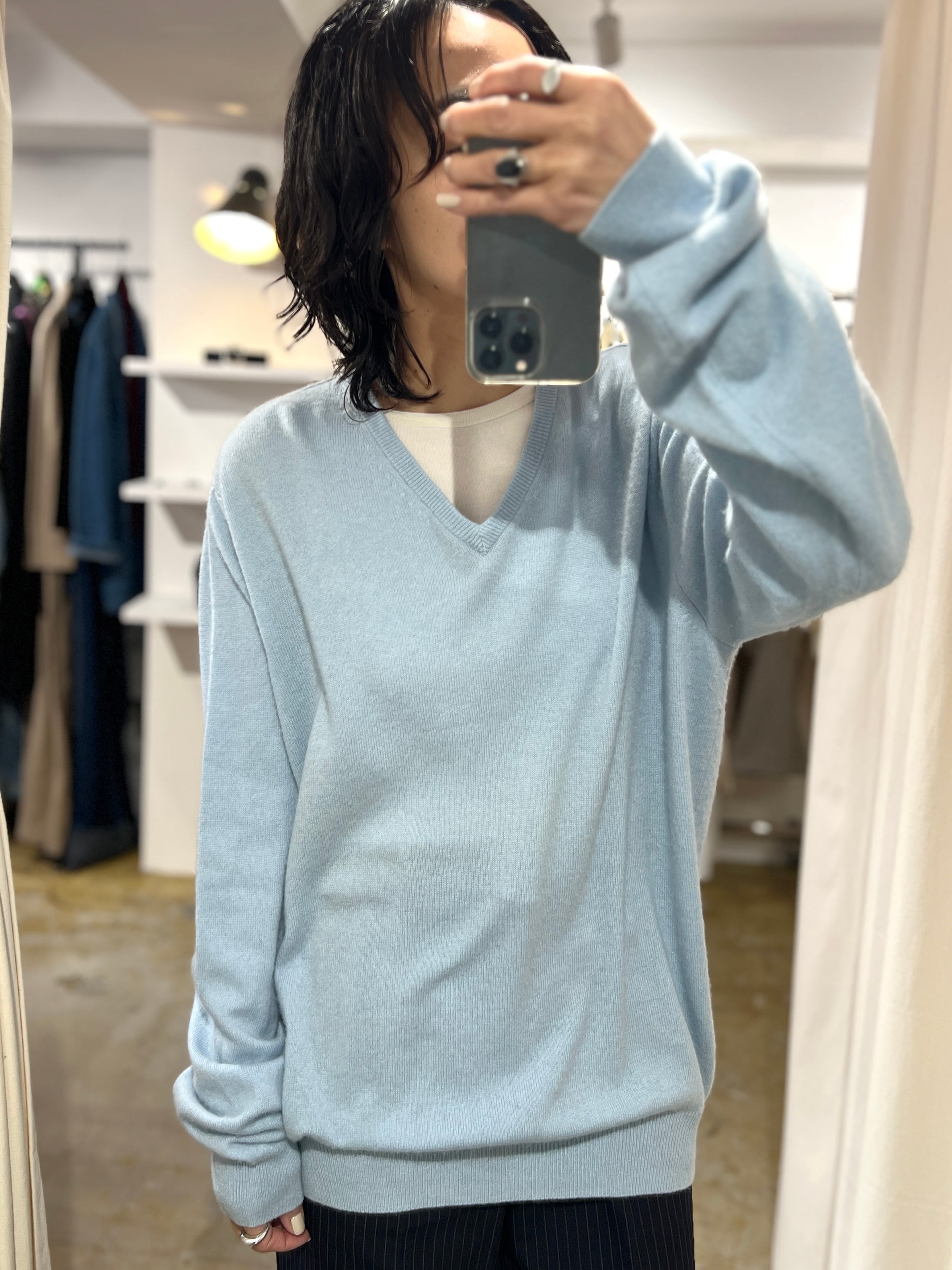春らしいパールトーンのブルーが綺麗なカシミア100%のVネックニット。