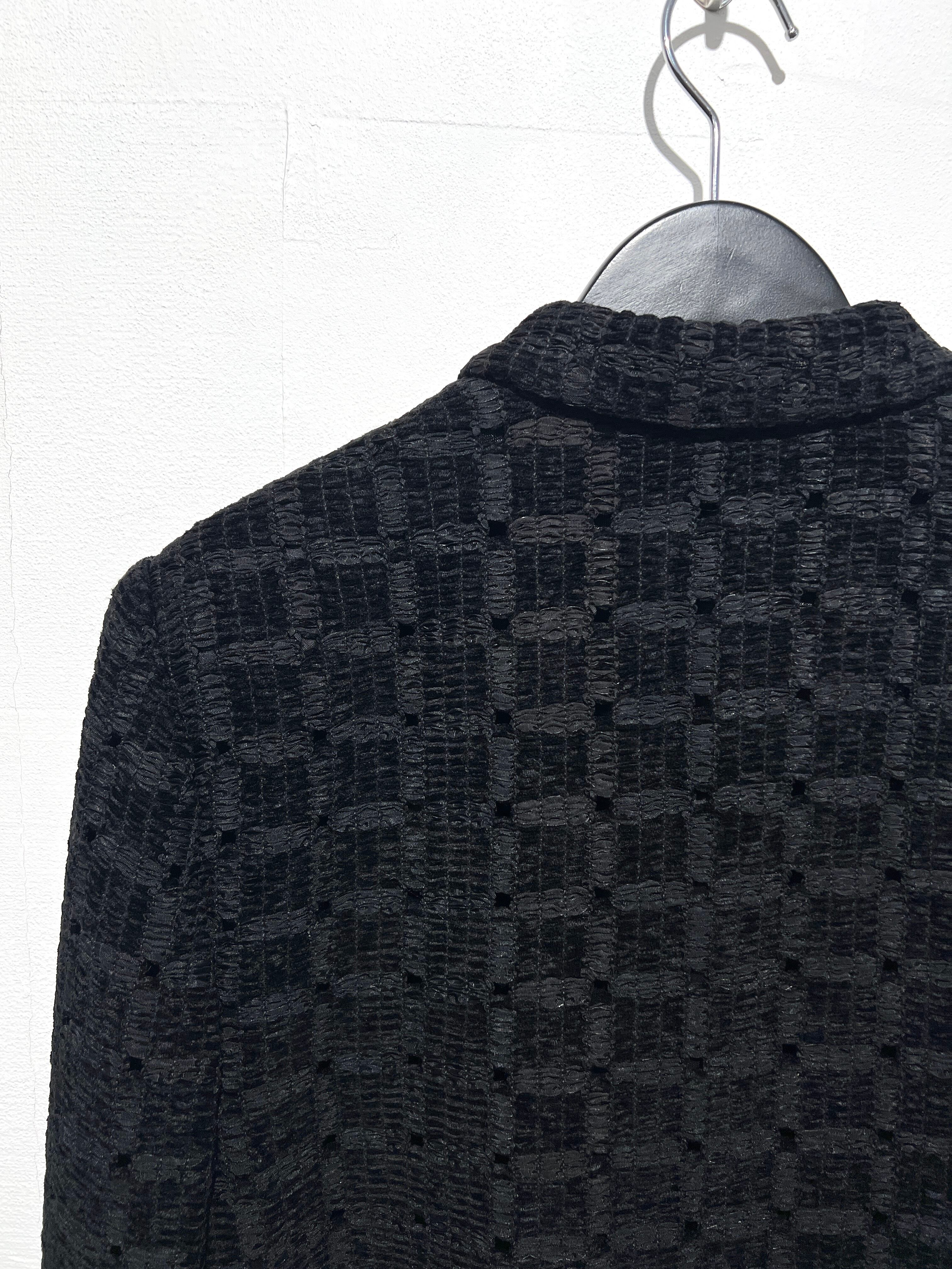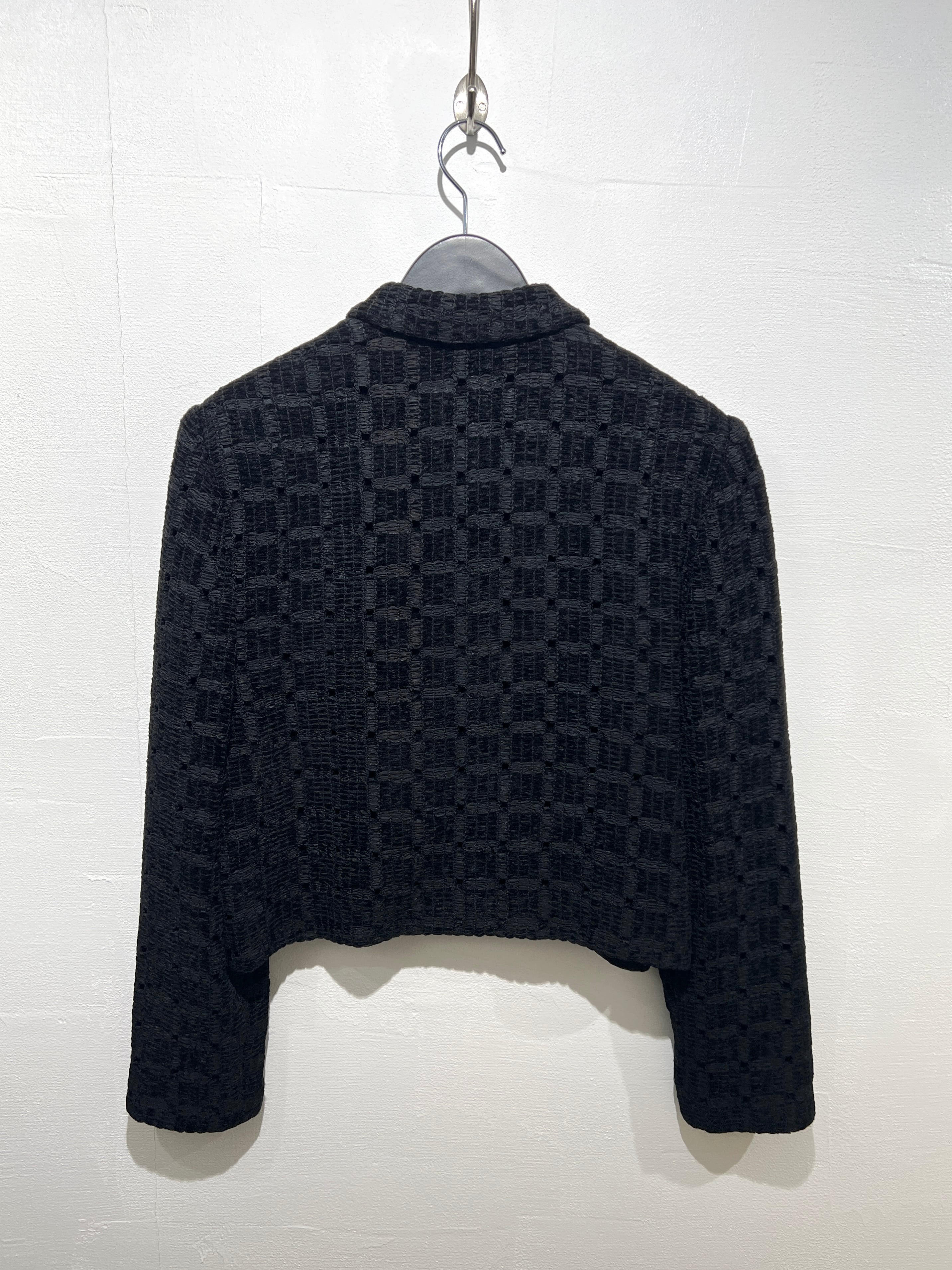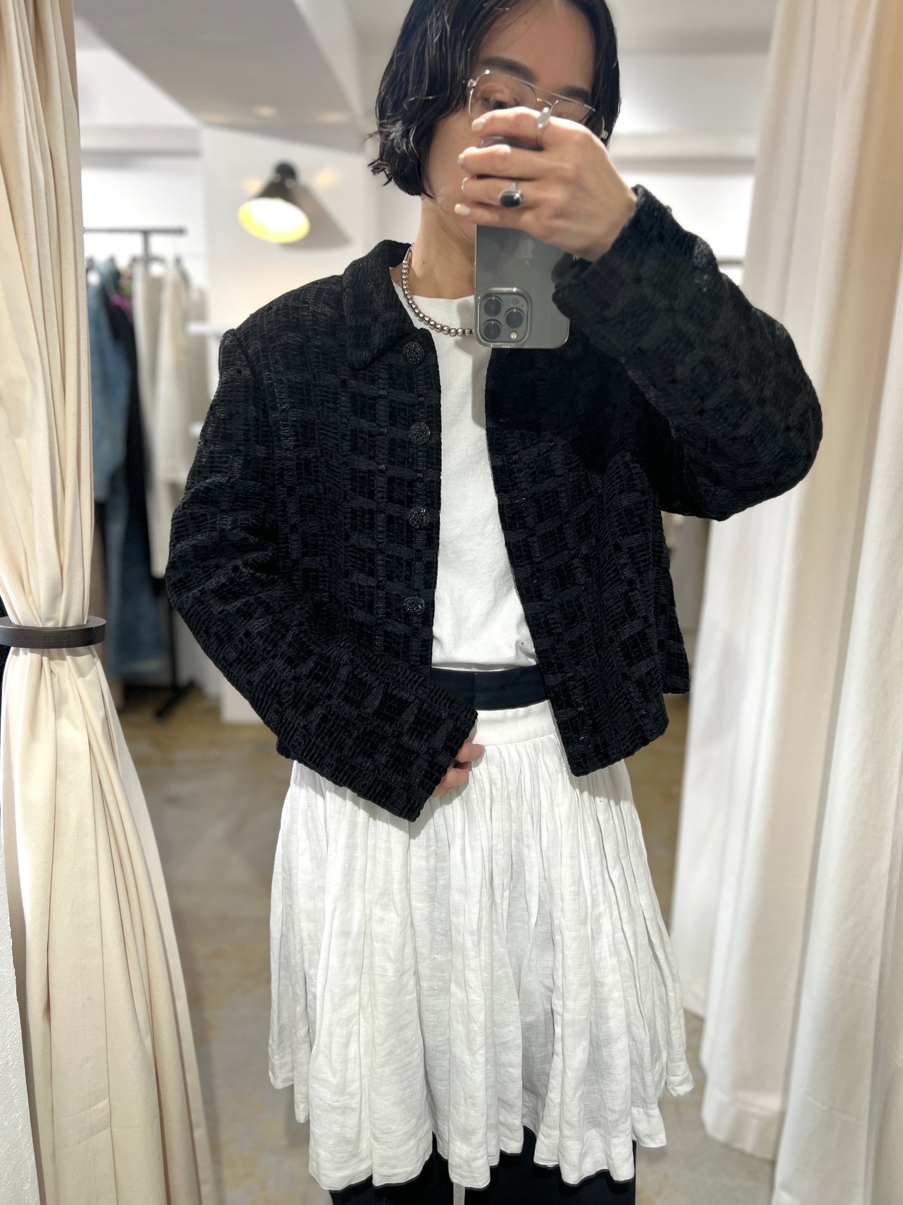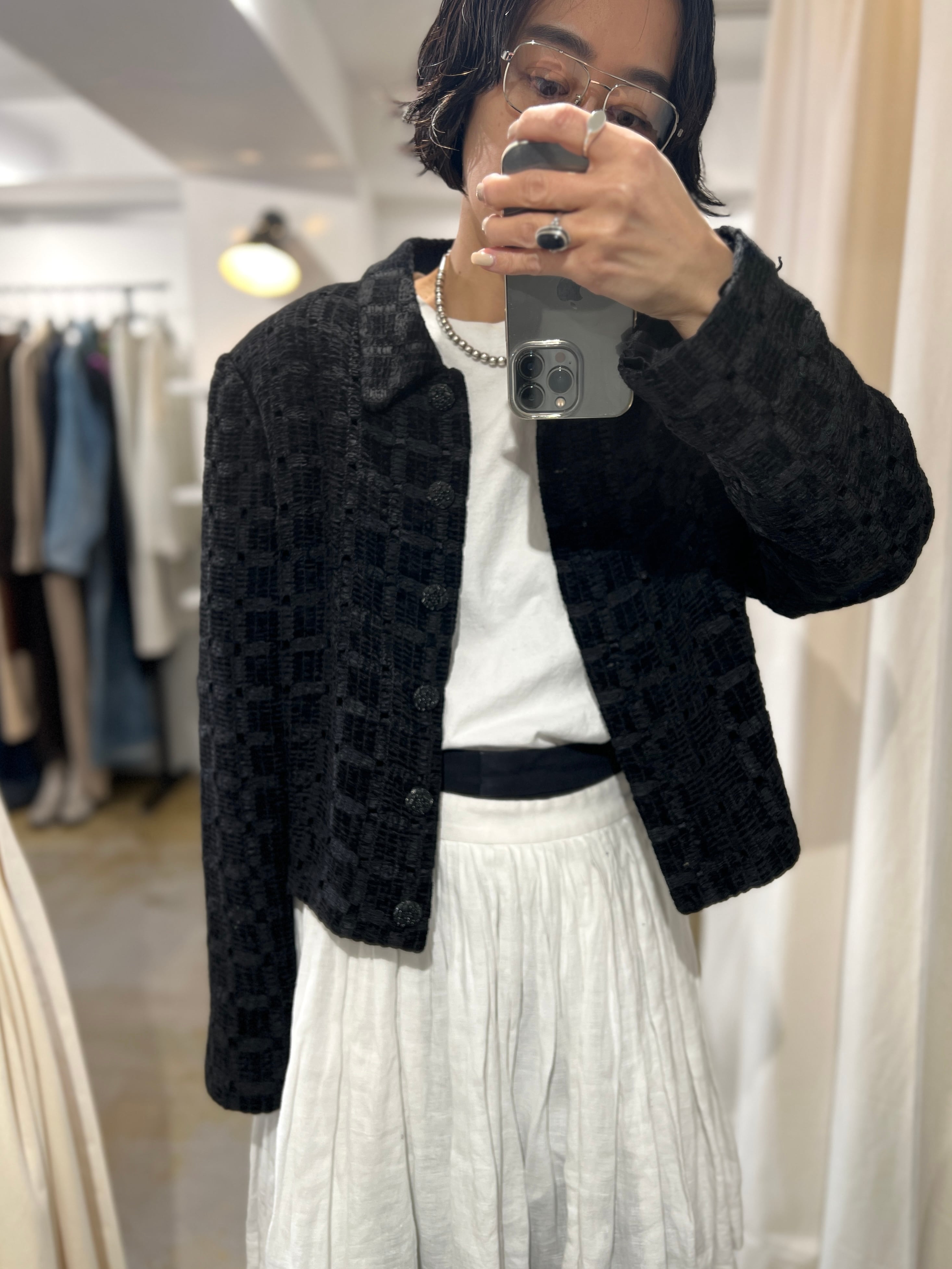 とにかくテキスタイルがとびきり素敵でクラシックなボックスジャケットが現代のスタイルにもマッチするシルエット。