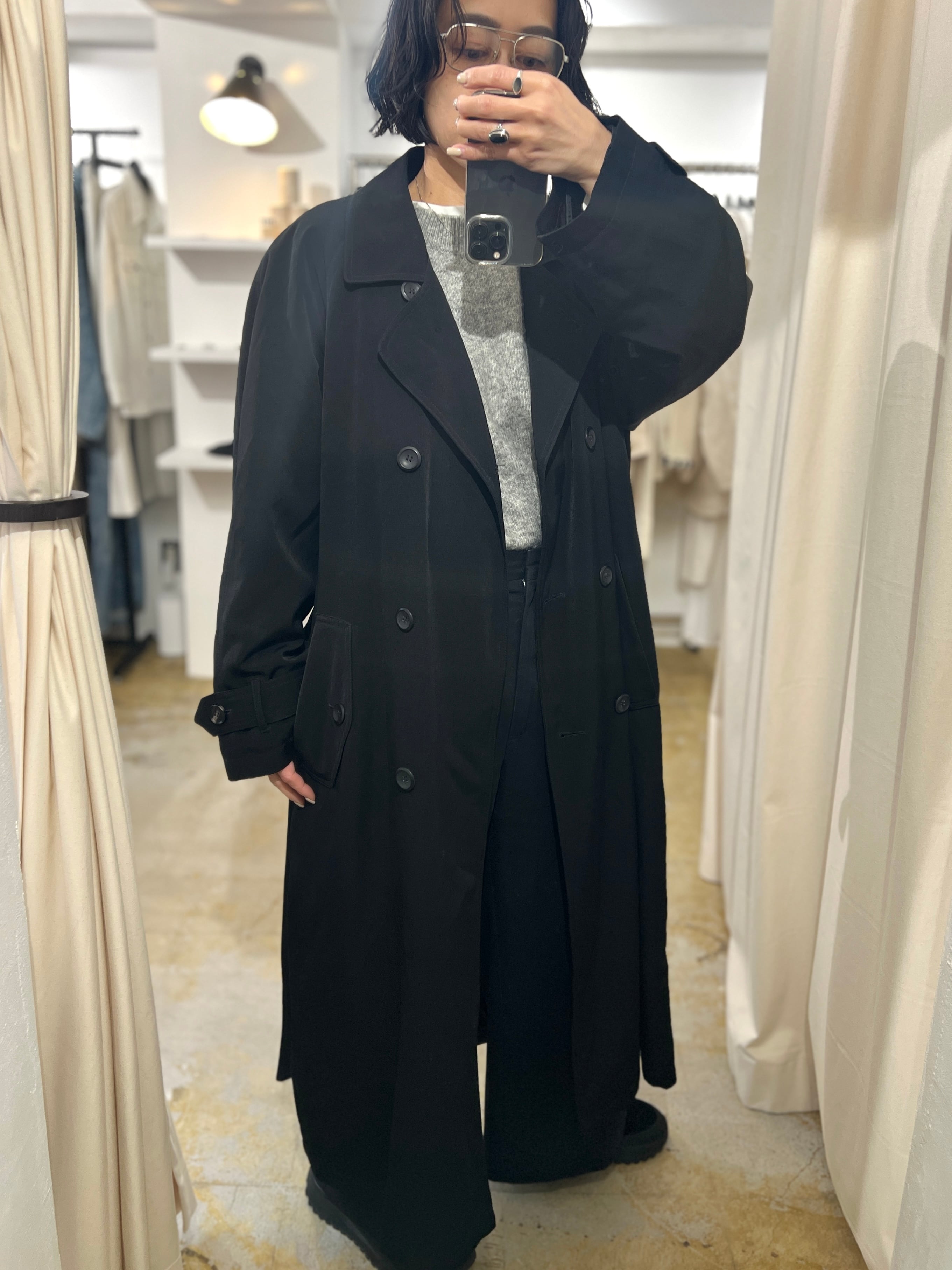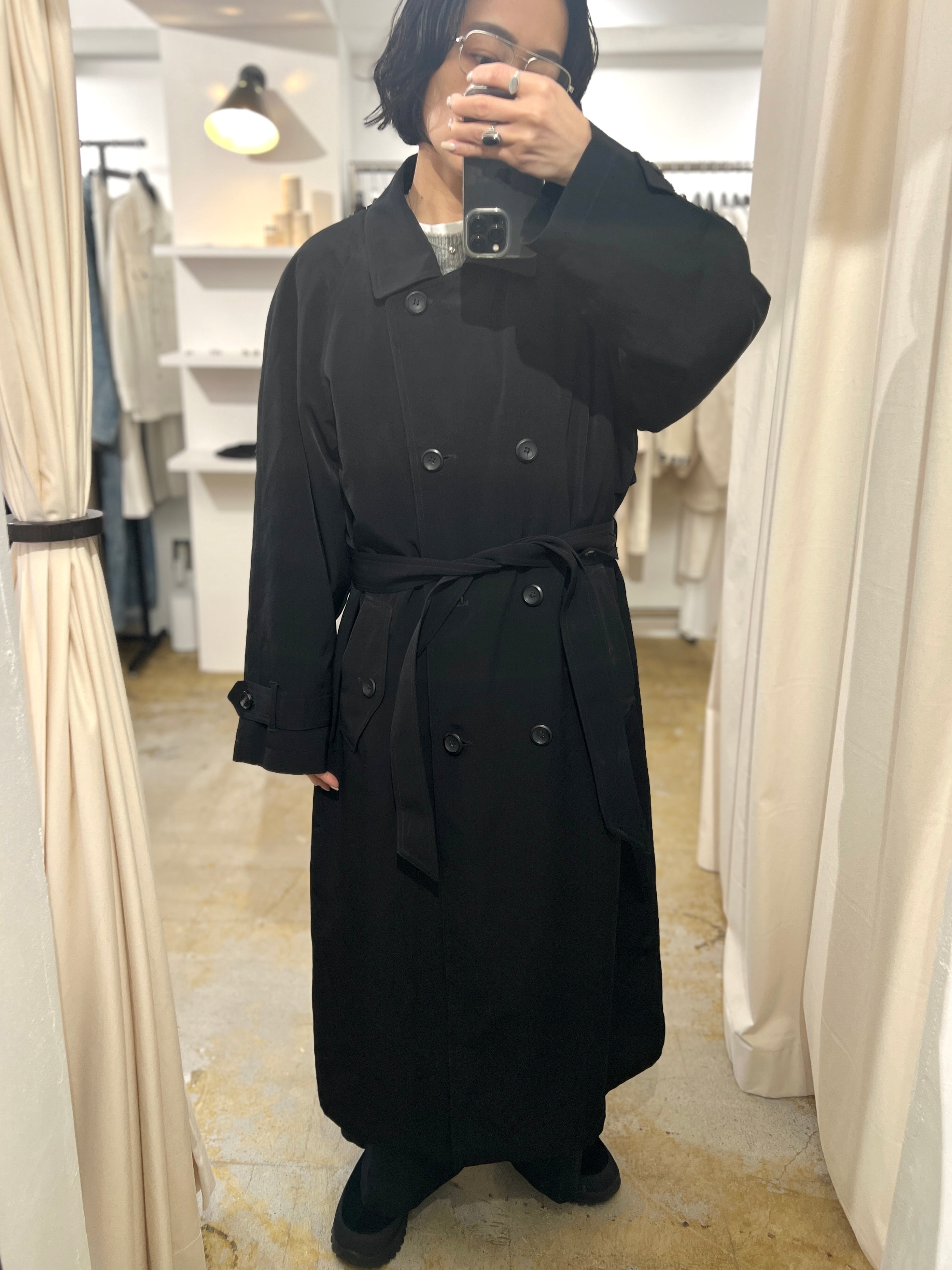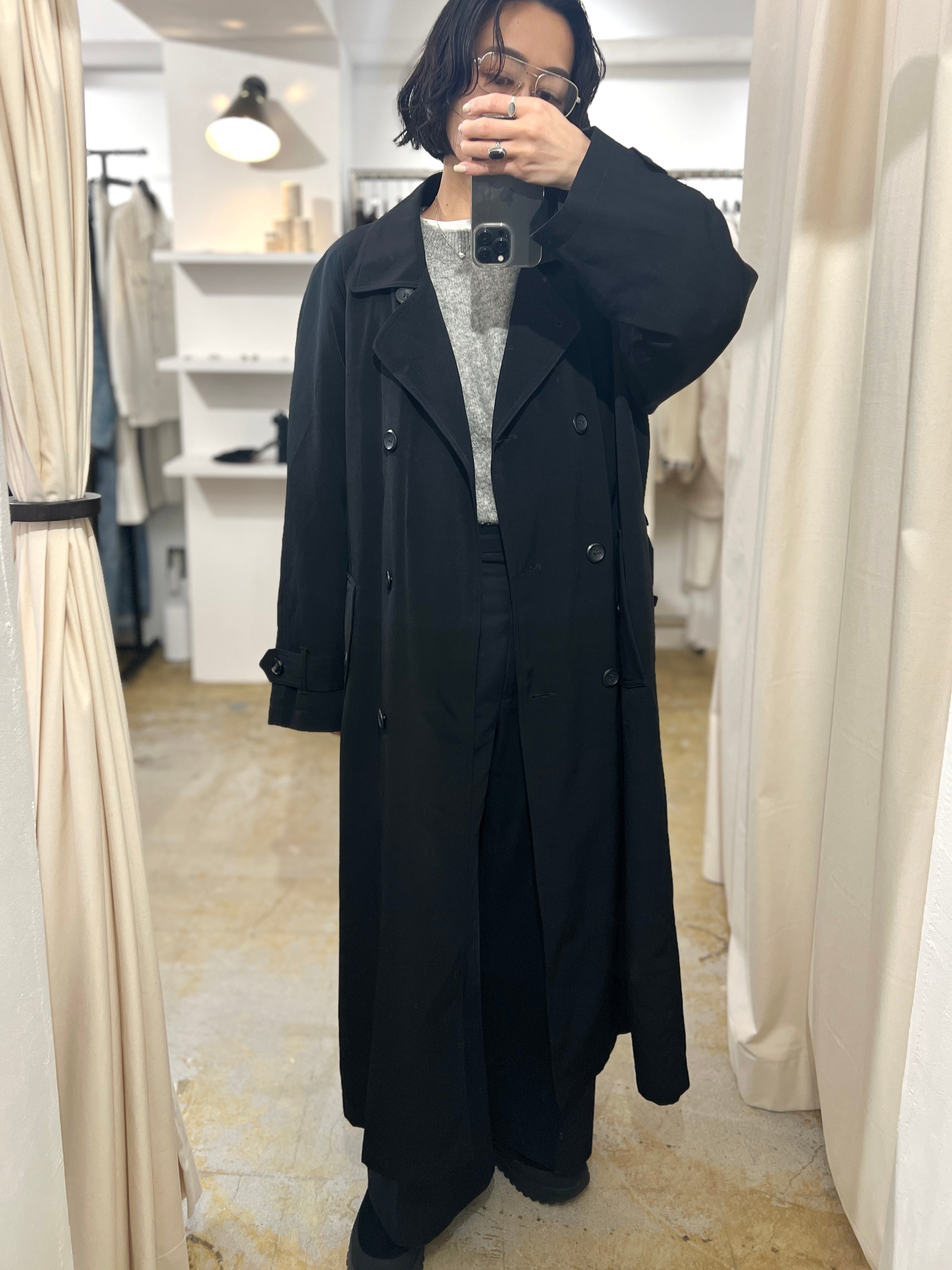 シンプルなトレンチコートで中に着るものを選ばず、持っていると便利で心強いアイテムかと思います。