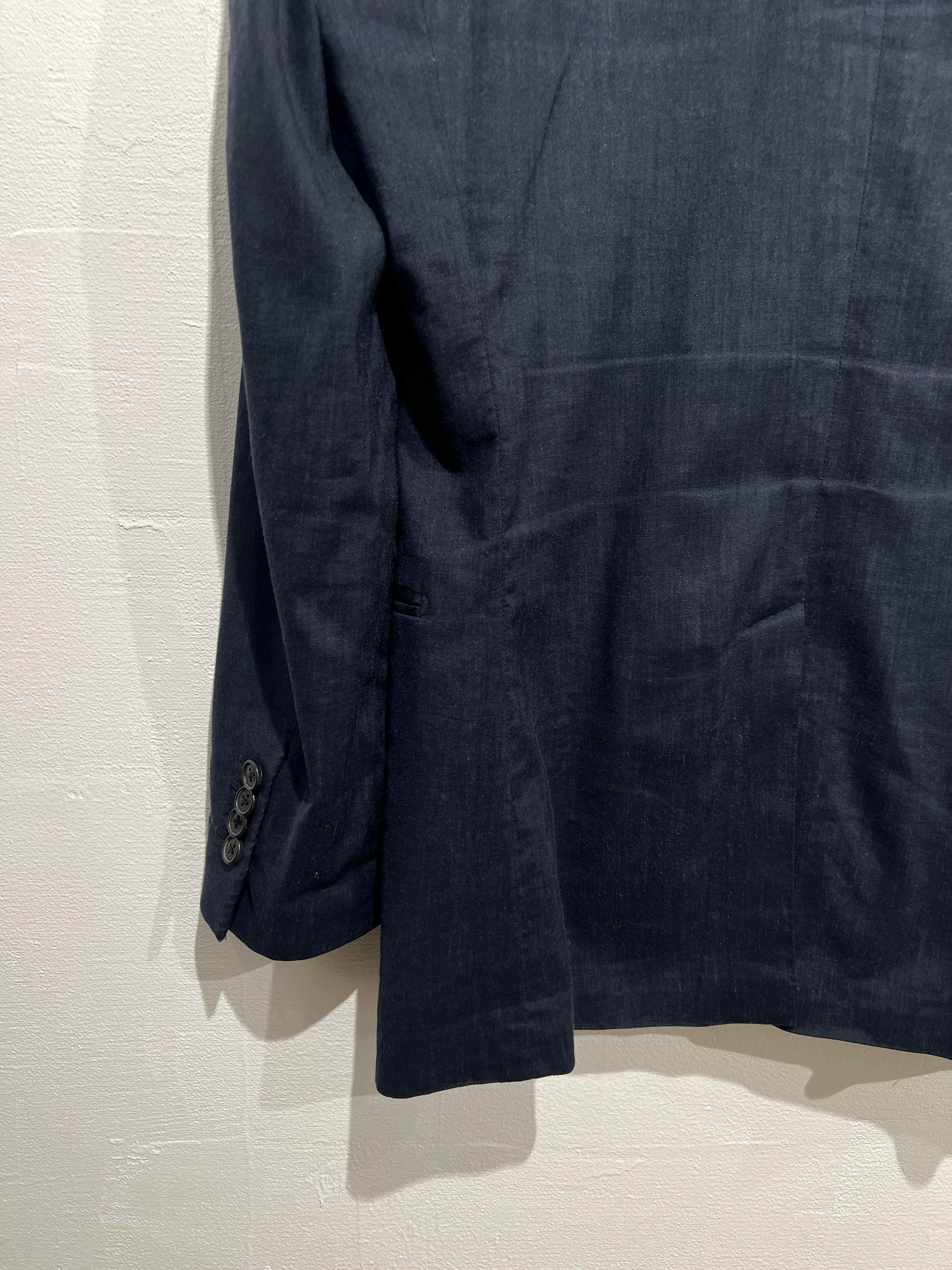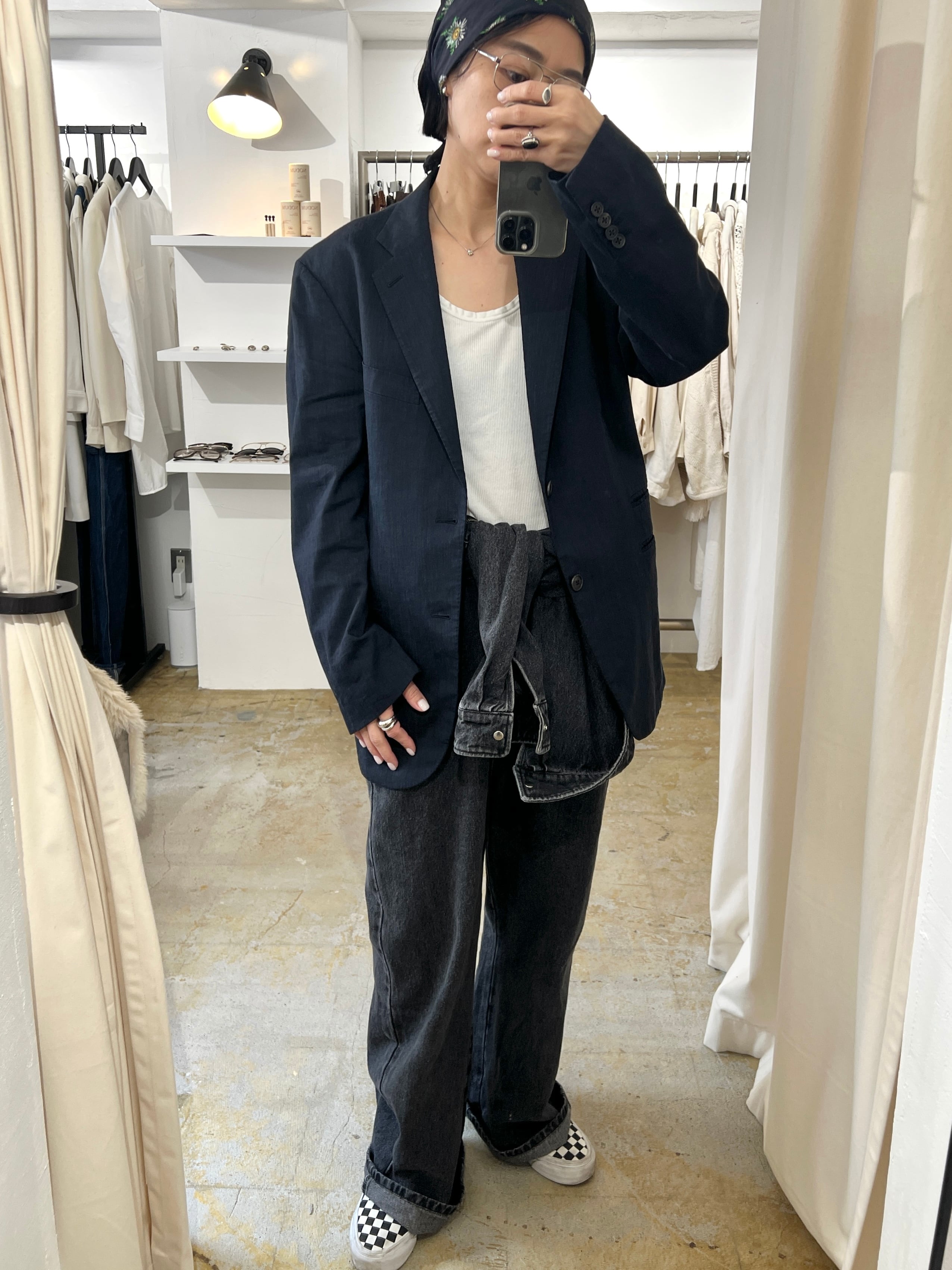 身頃は裏地のない春夏仕様のジャケットで黒に近いネイビーカラーがシックでインナーをランジェリーなど甘いアイテムを合わせたり、古着のTシャツで外したりといろんな着こなしを楽しめそうです。