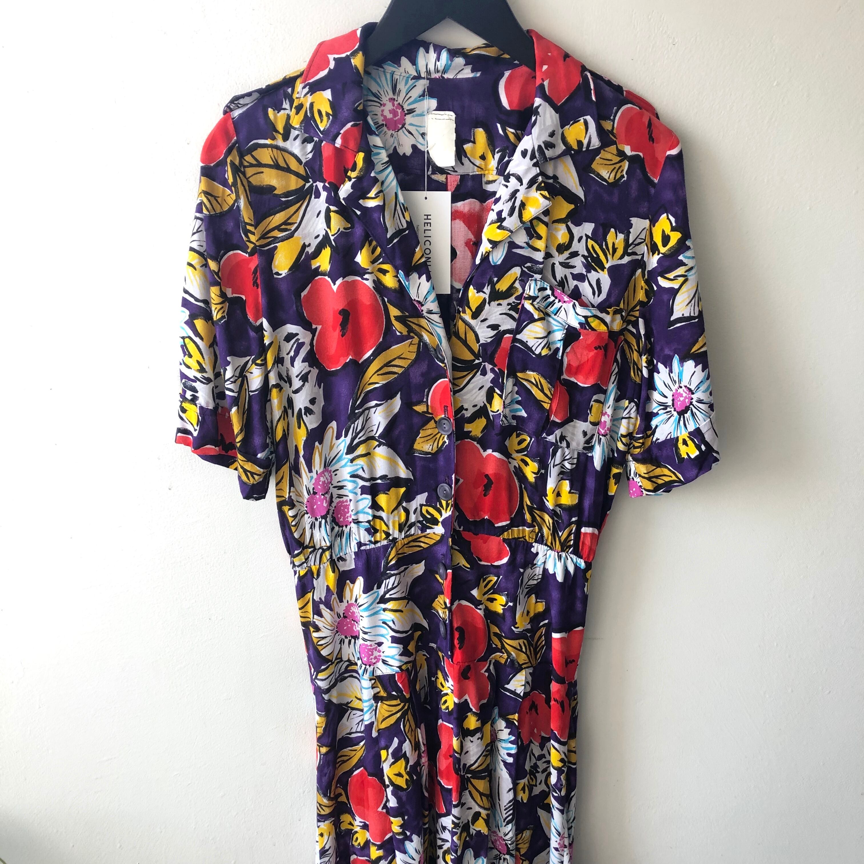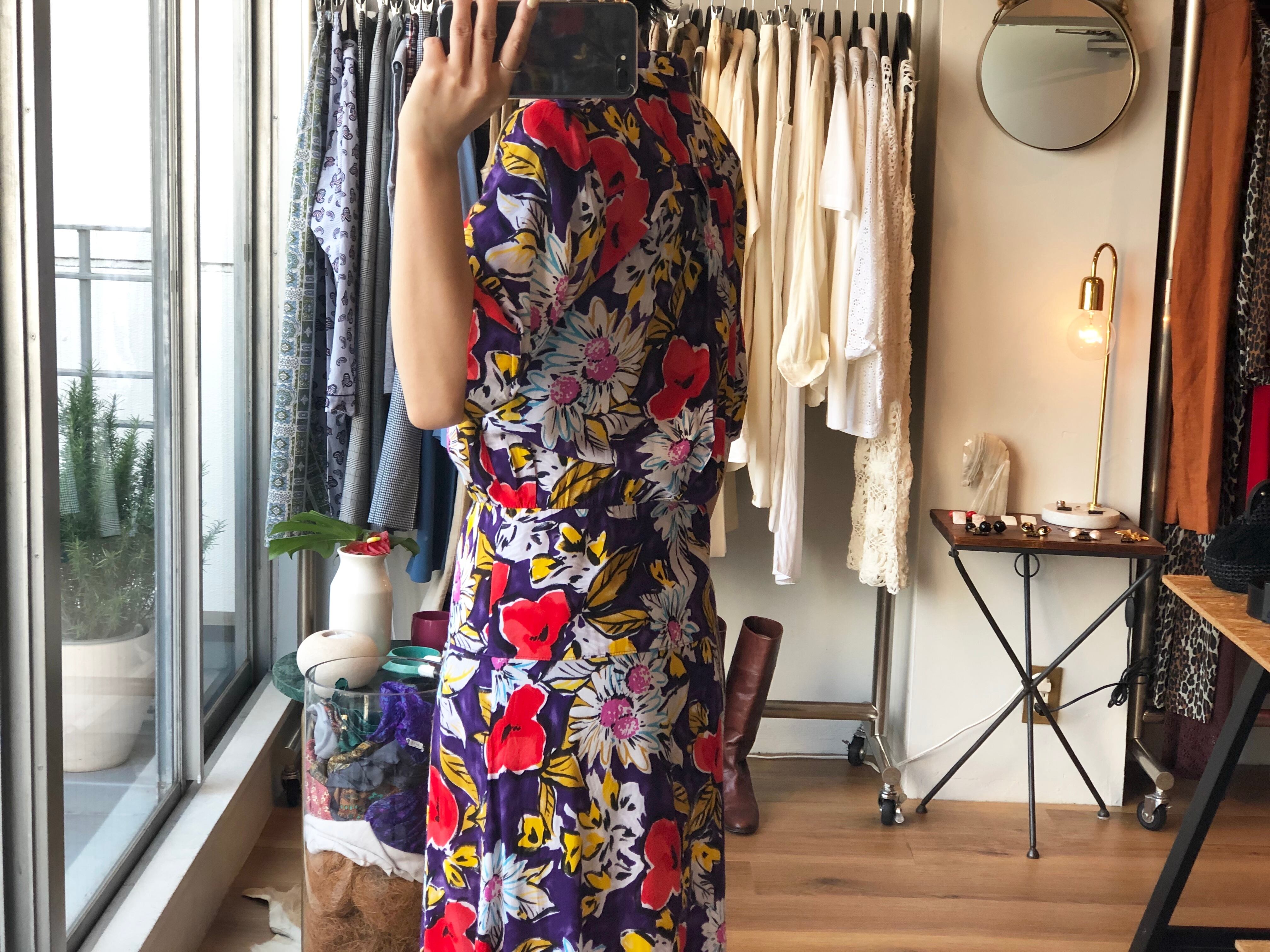 鮮やかな色合いとプリントが目を引く80年代のロングドレス。