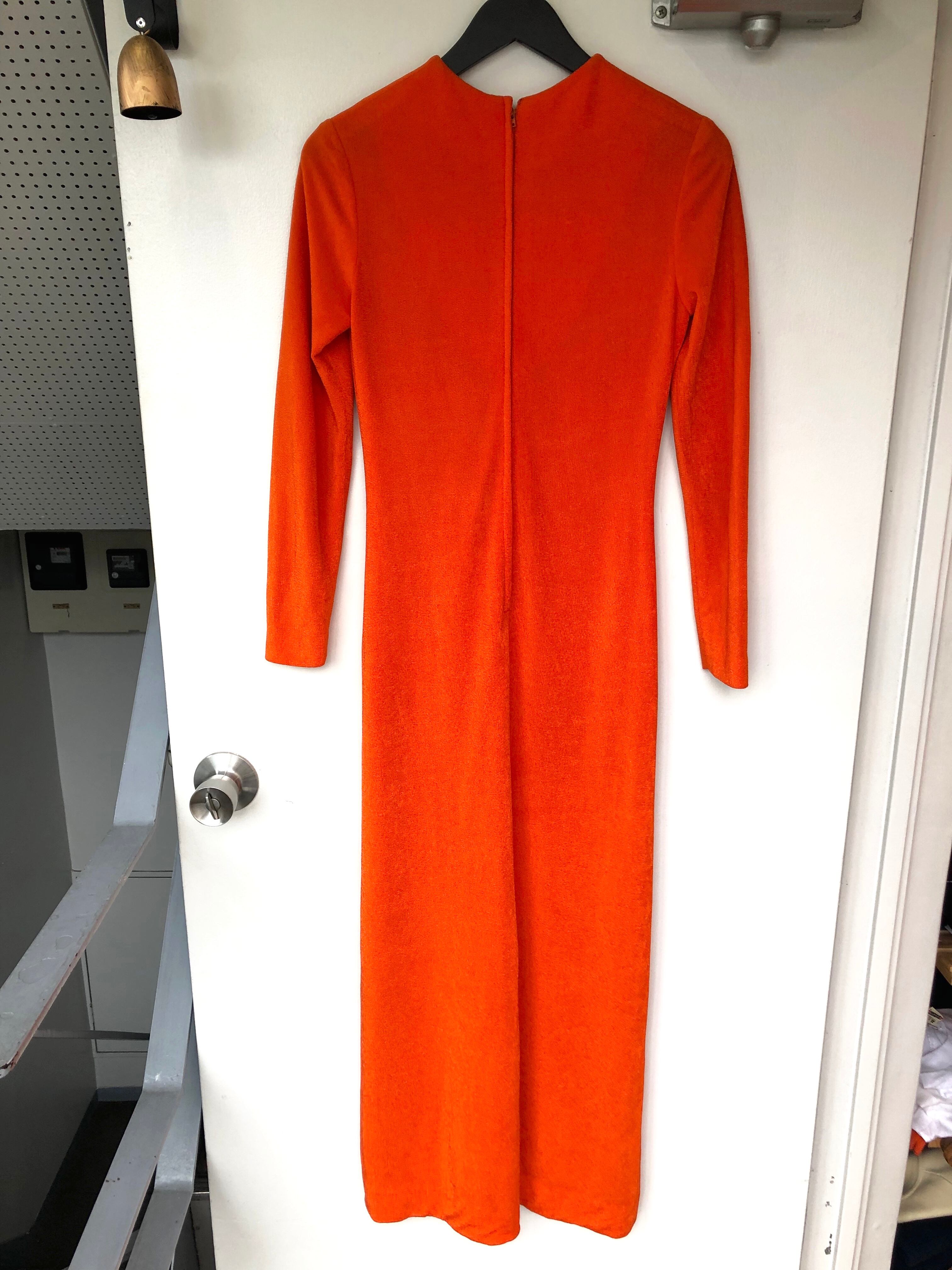体のラインに沿った70年代らしいシルエットのマキシジャージードレス。