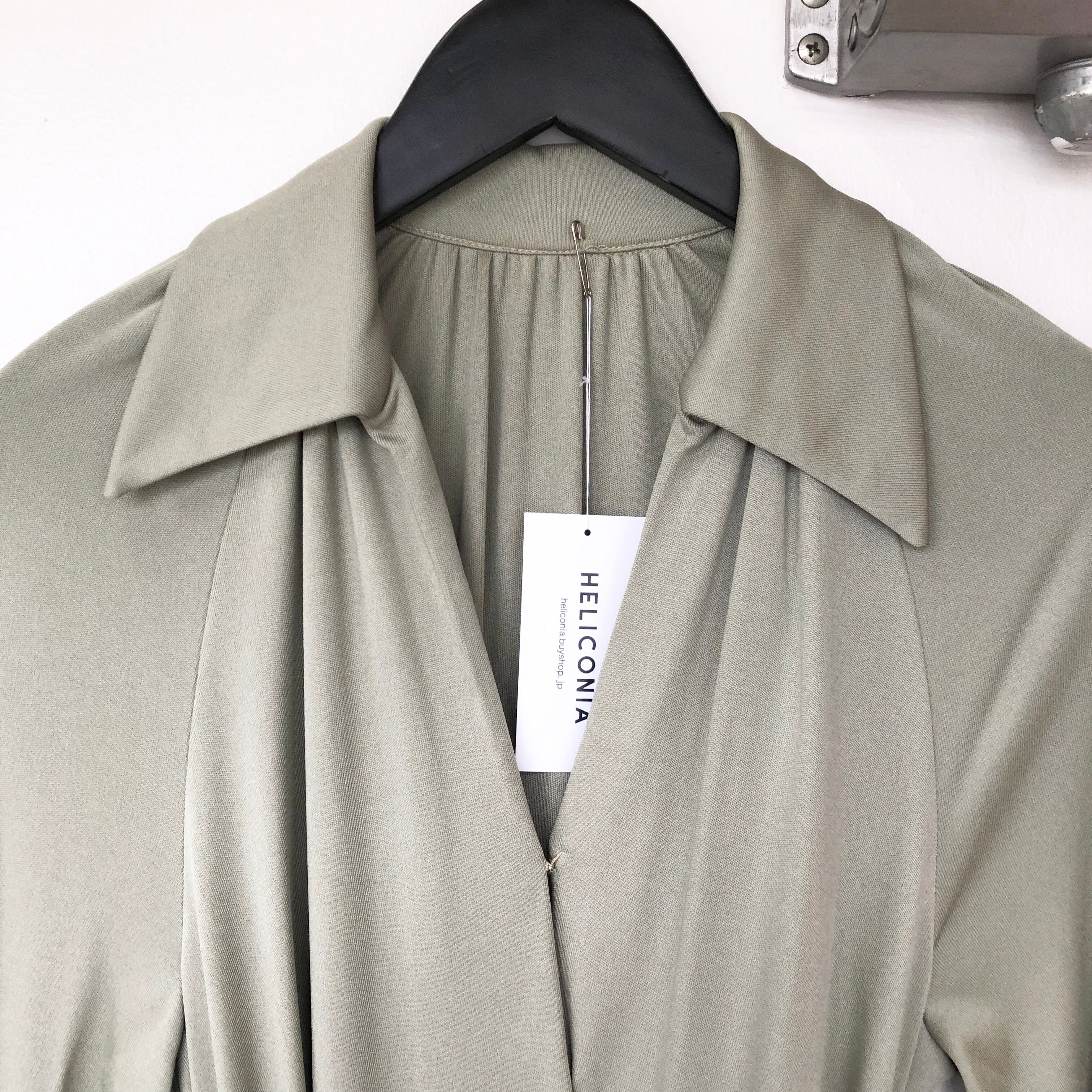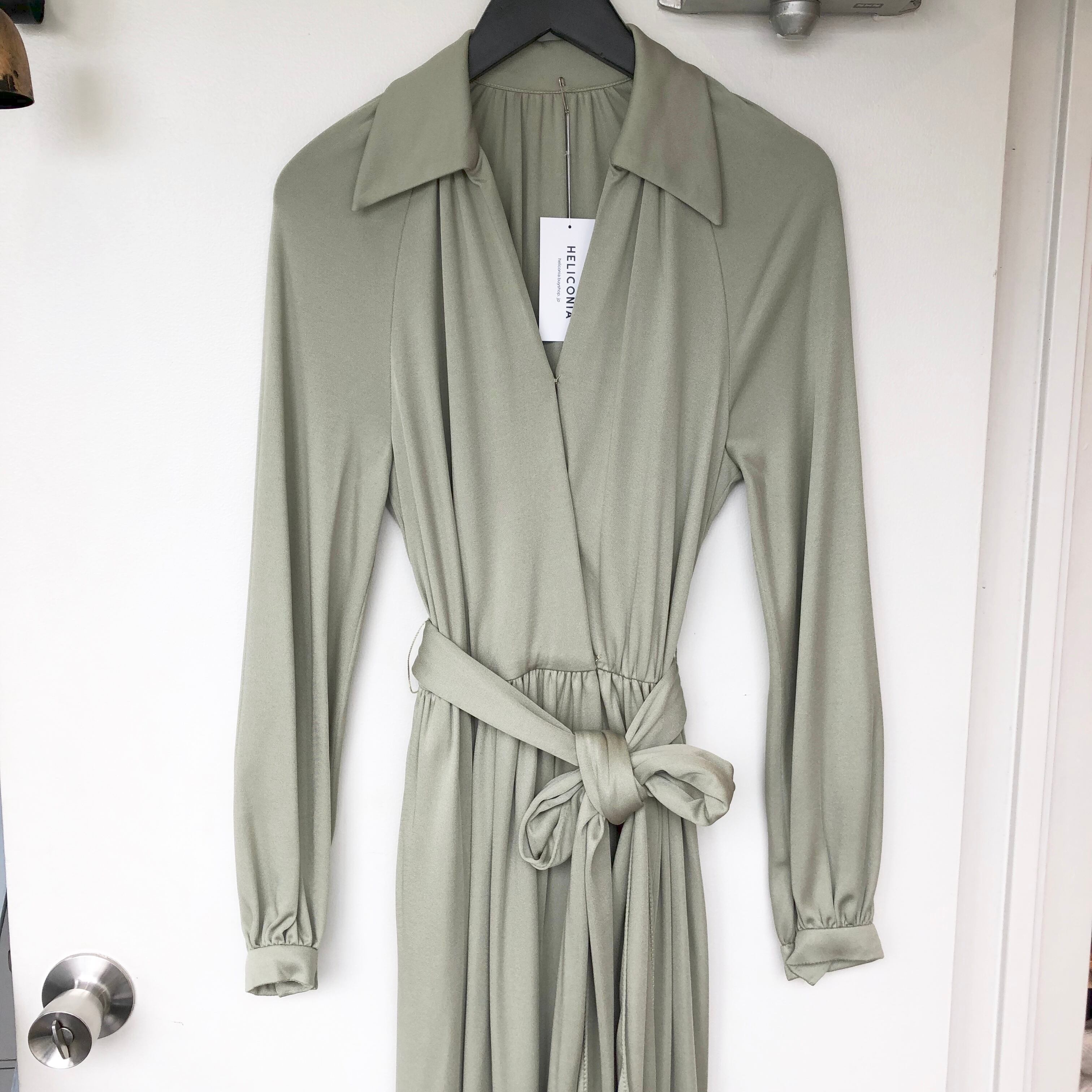 動きの出るジャージー素材にトップがカシュクールされた70年代らしいシルエットが綺麗なマキシドレス。