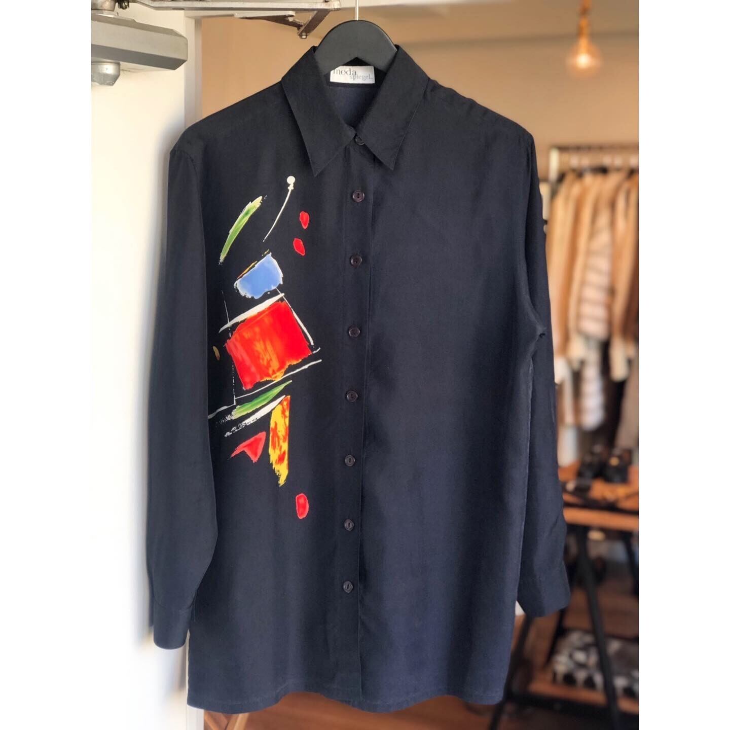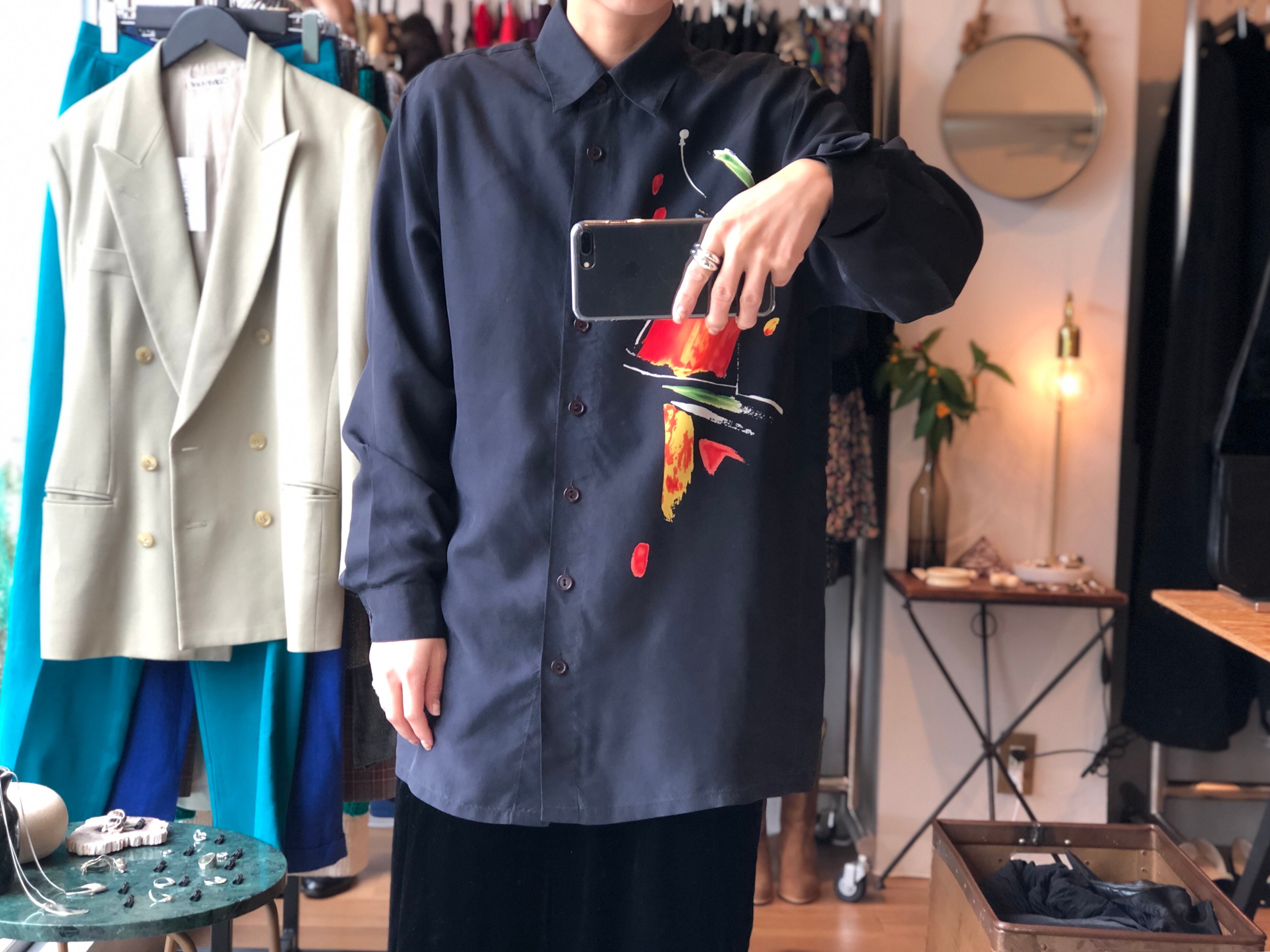 目を引く美しいアートプリントのシルクシャツ。