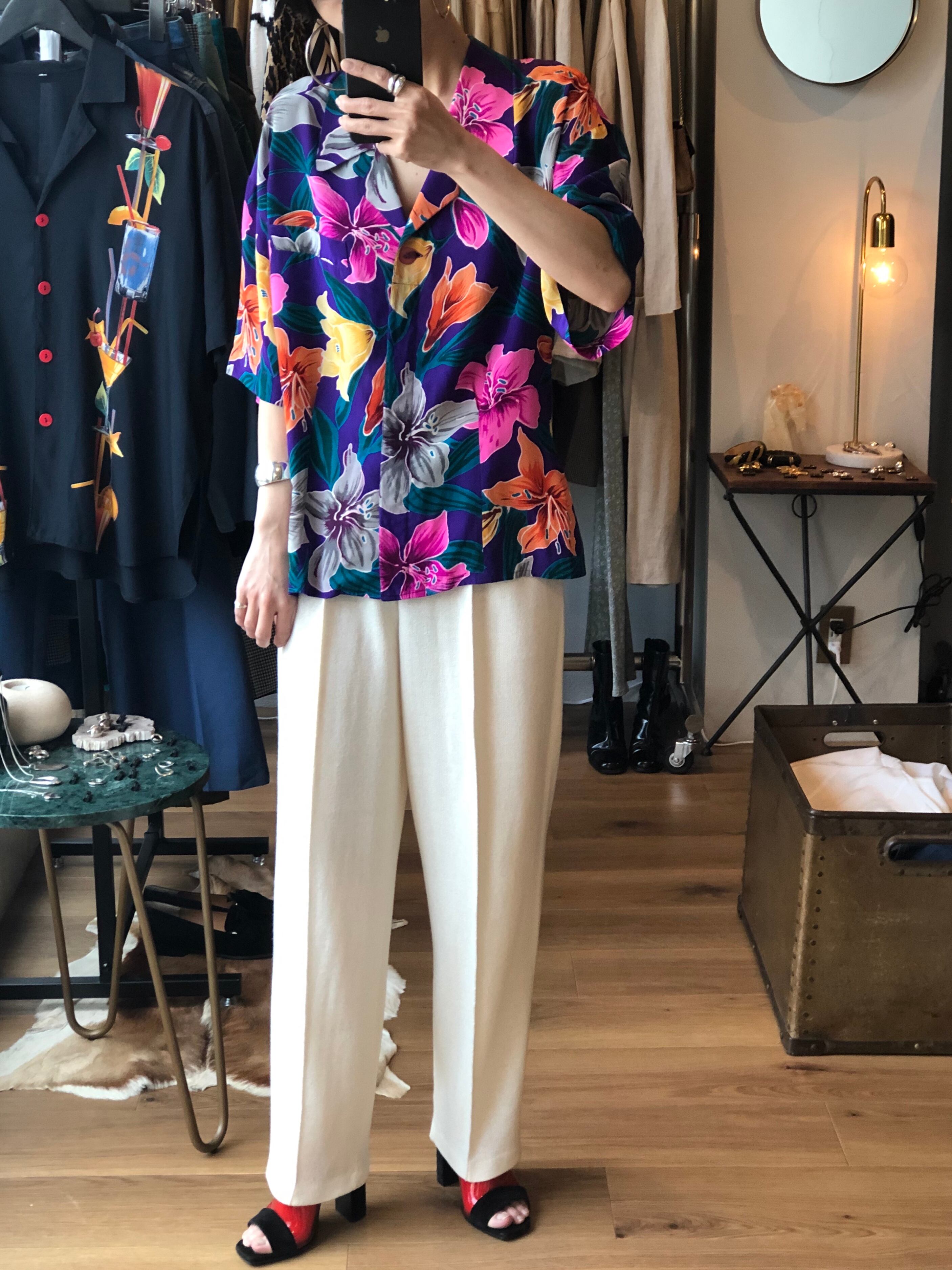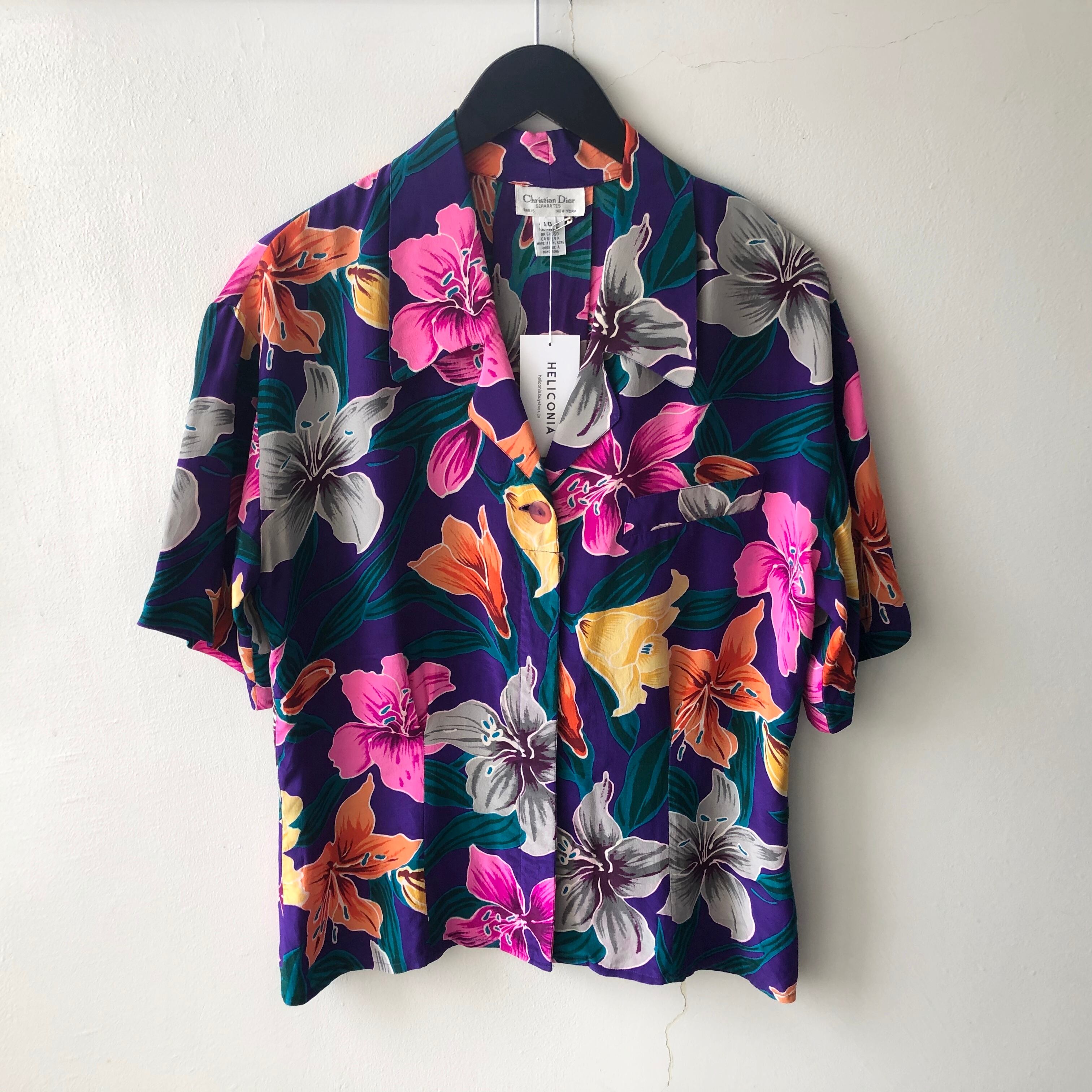 目を引くカラーリングとプリントのヴィンテージChristian Dior のシルクシャツ。