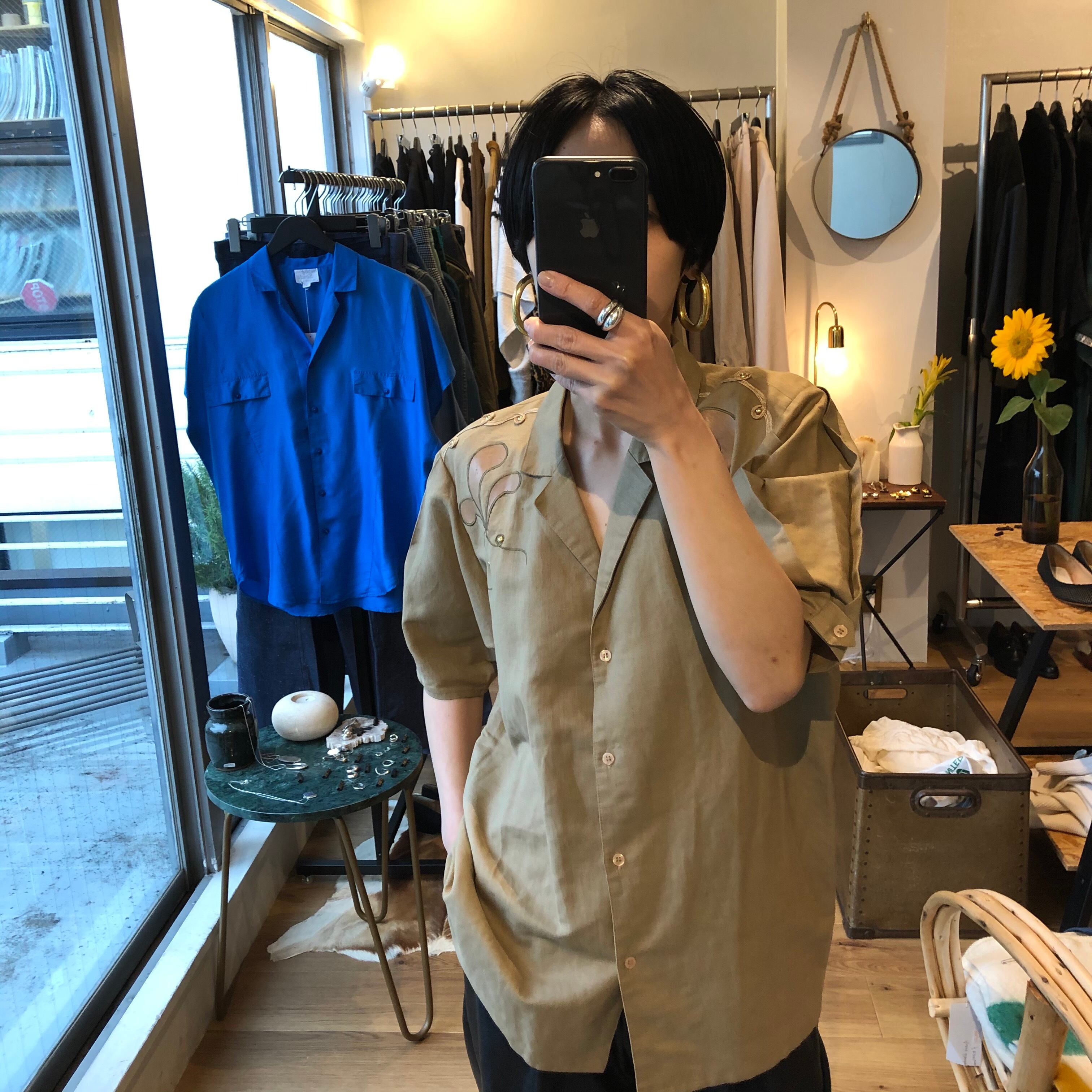 レザーパッチやゴールドのハト目など肩のデザインが魅力的なオープンカラーのリネンシャツ。