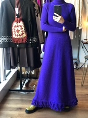 トップ部分はリブ編みのタートルネック、スカート部分はカールがかったもこもことした編みに裾がフリンジになったマキシ丈のニットワンピース。