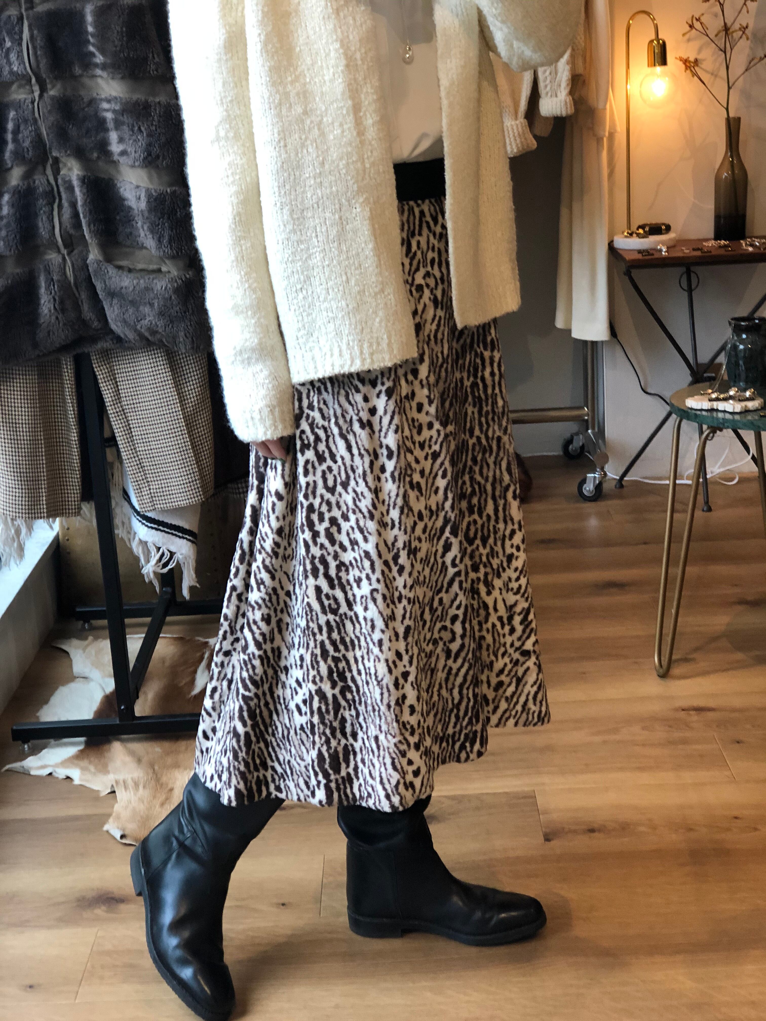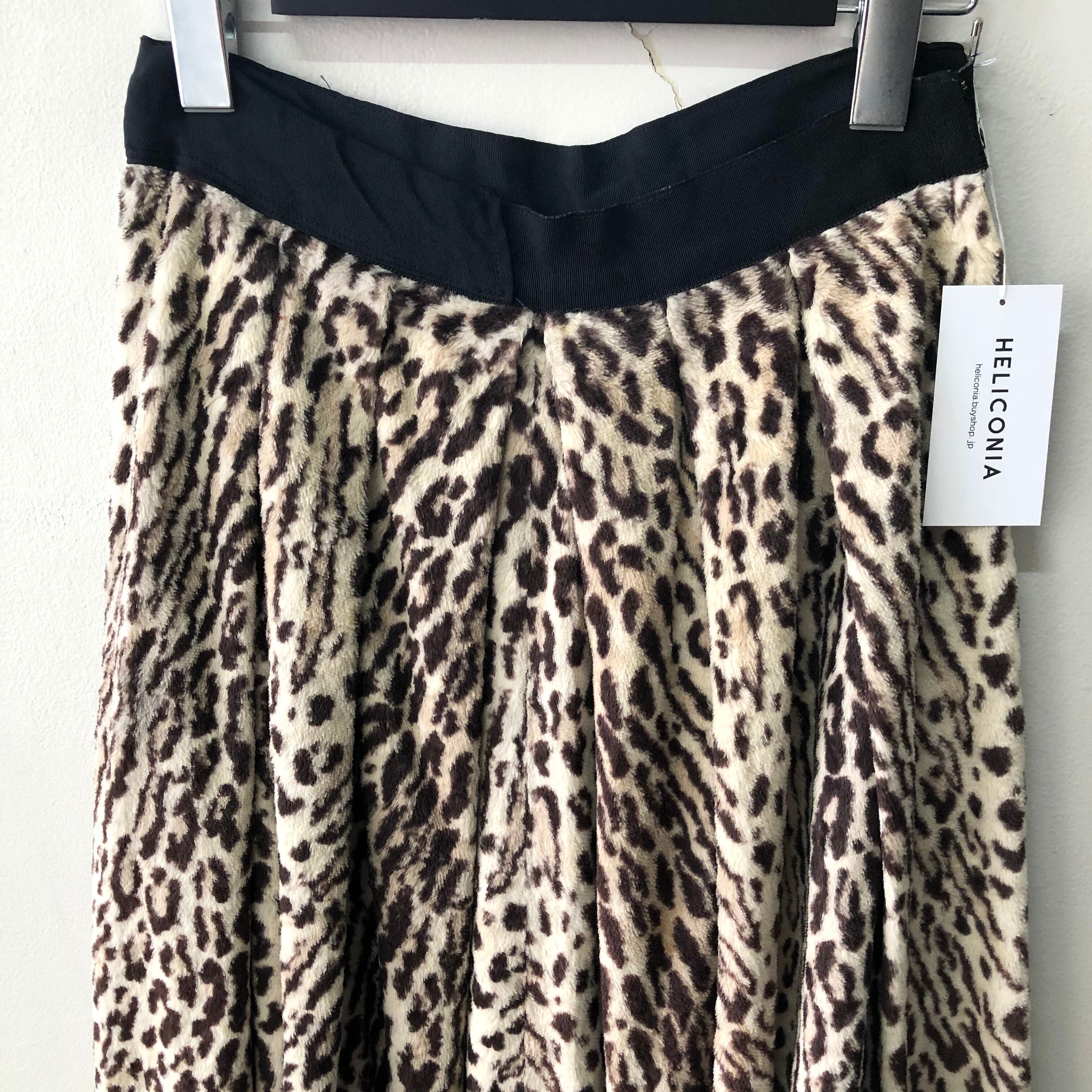 ライトベージュにブラウンとはっきりとしたコントラストのある豹柄が素敵なフェイクファースカート。