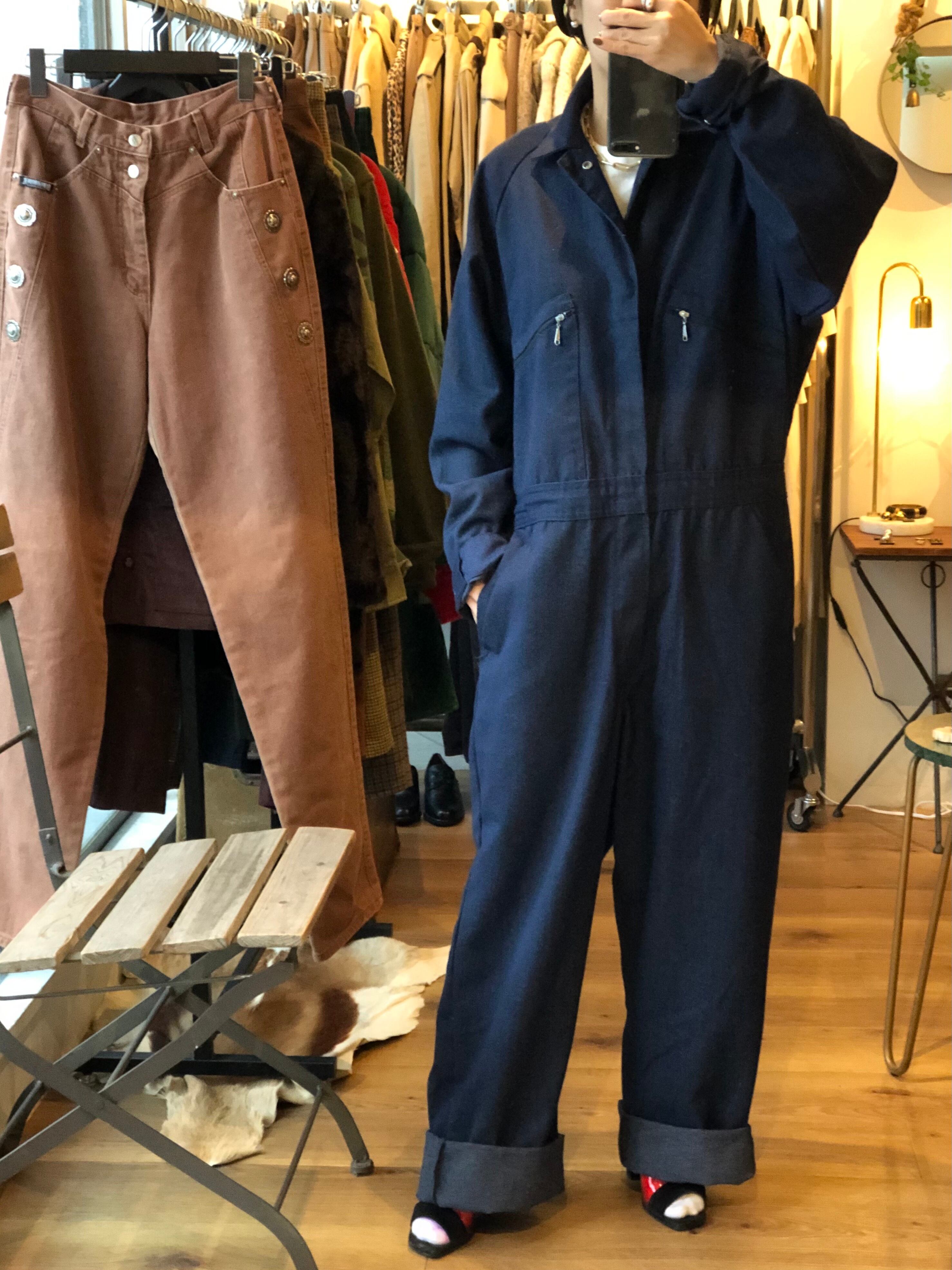 斜めになったジップポケットや色落ちのしていない綺麗なシャンブレー素材が魅力的な80sのワークジャンプスーツ。