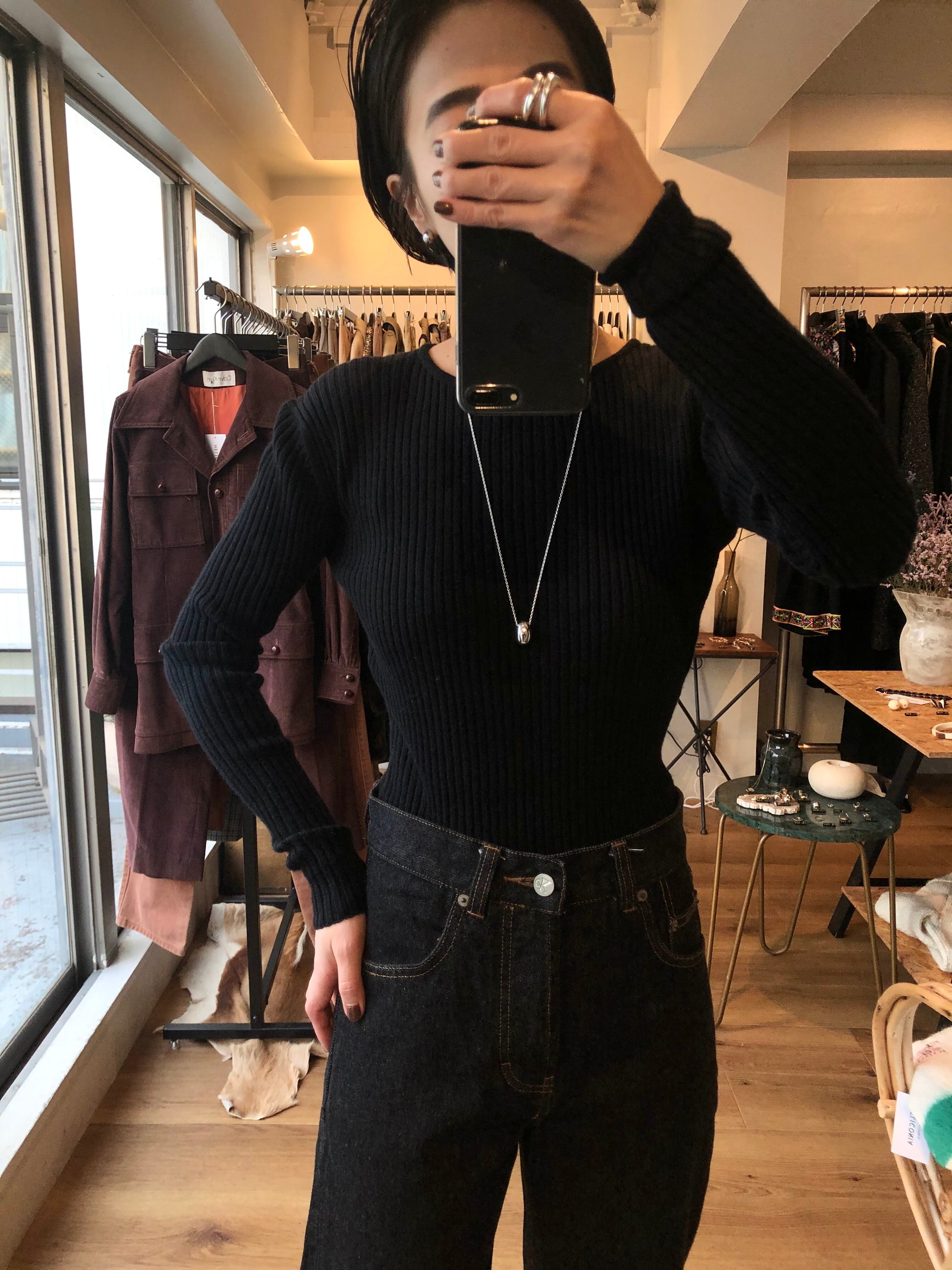 リブ状になったニット素材に腕から袖にかけ細身のラインが女性らしいバランスです。