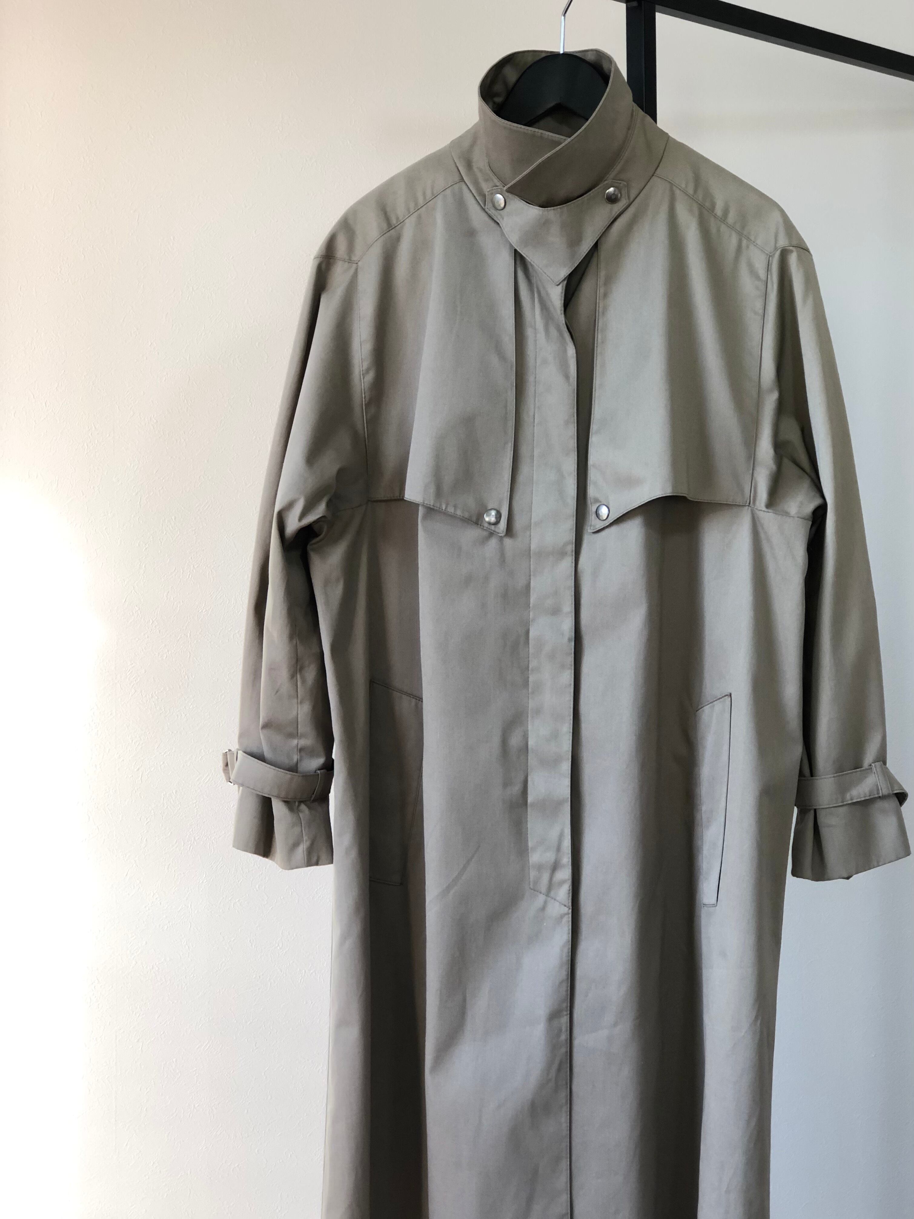 襟元まで止められるチンストラップが付いたポーランド製のロングトレンチコート。