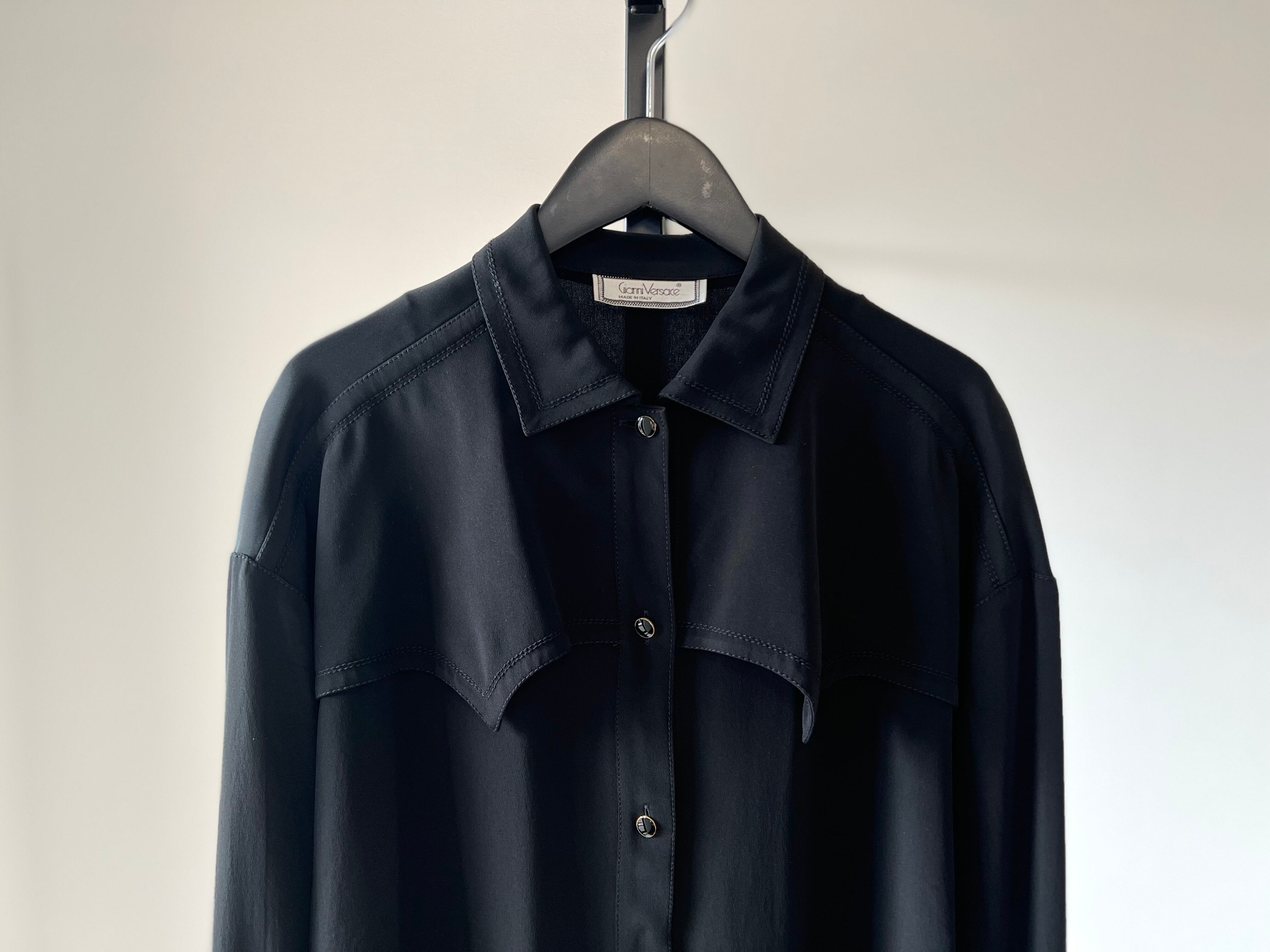 ウエスタンをGianni Versaceのフィルターを通して都会的なスタイルにアップデートさせた強さと品を感じるブラックシャツ。