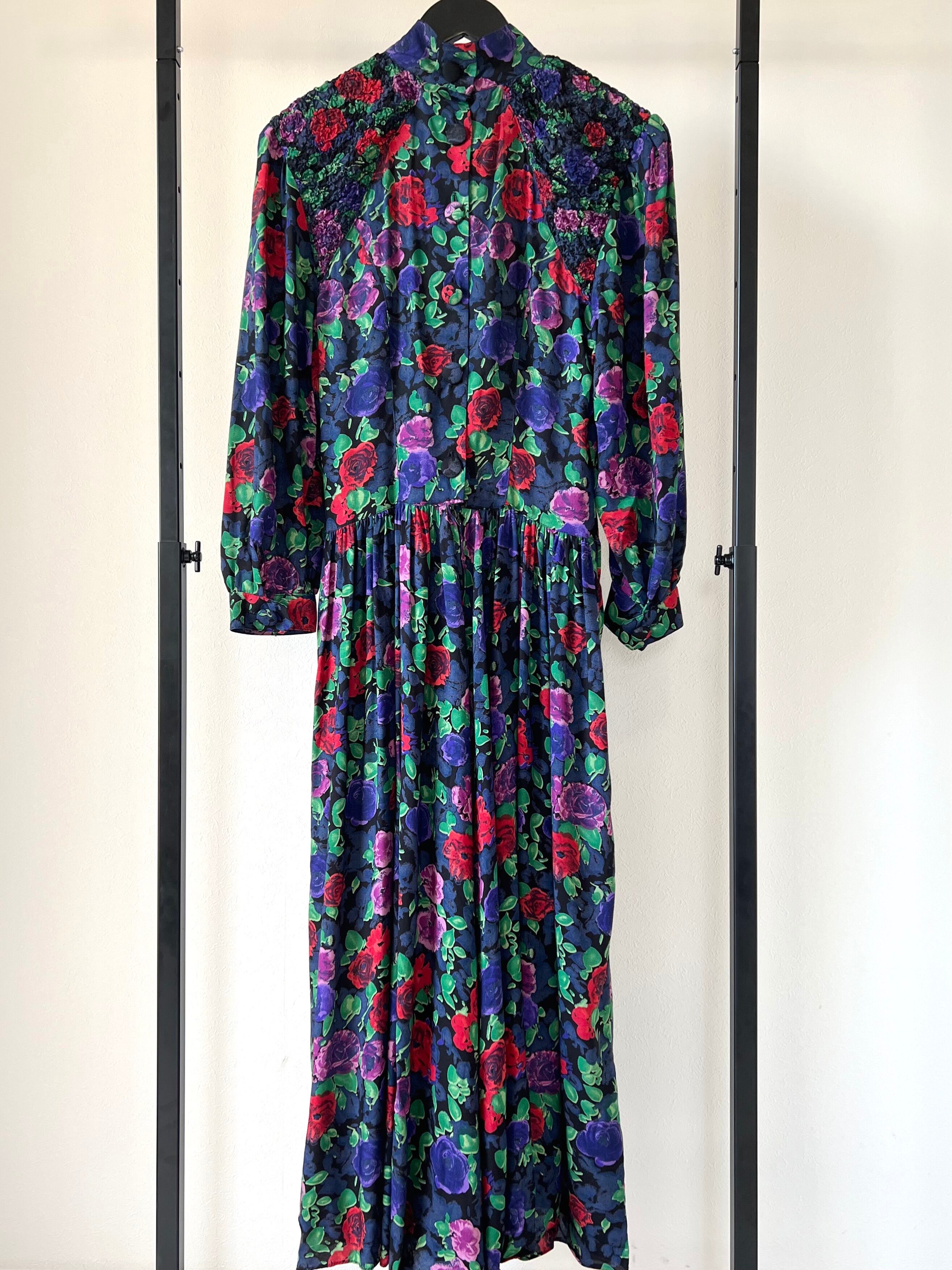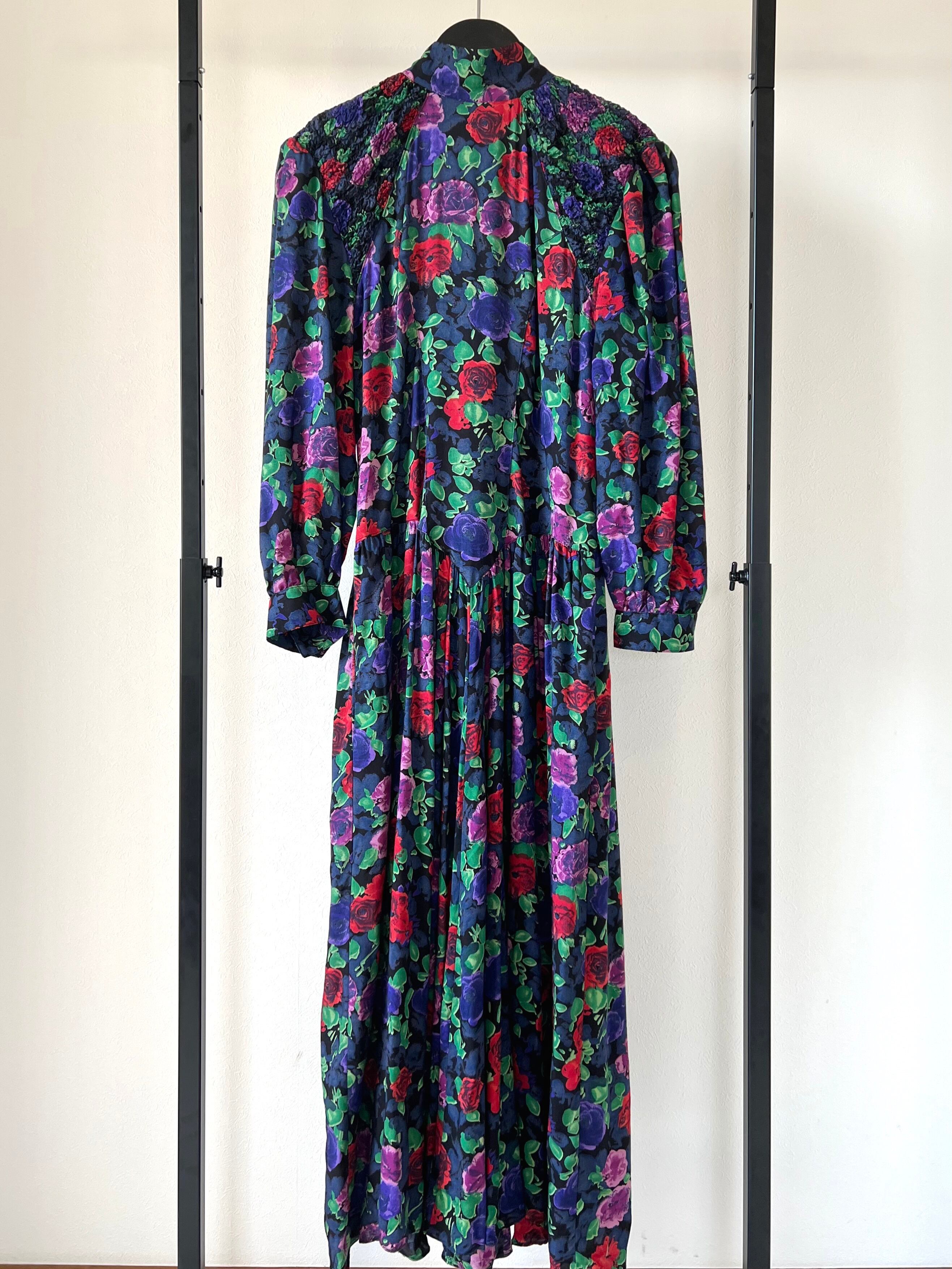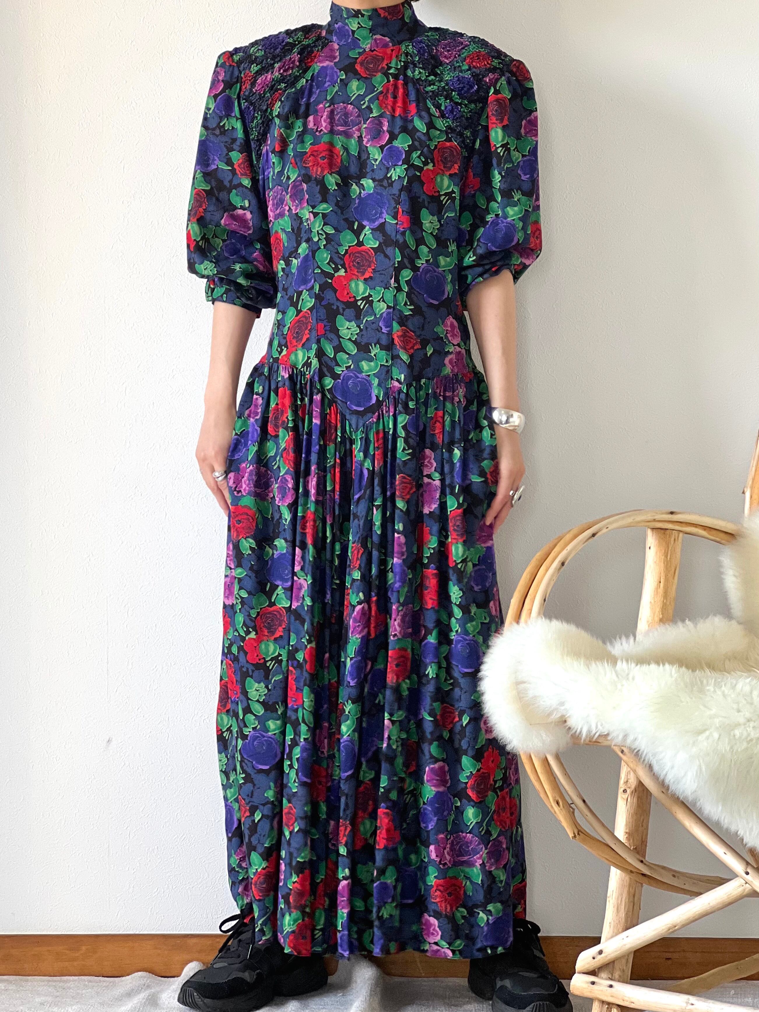 80年代らしいボリームのあるパプスリーブに肩のキャザー切り替えが可愛いレーヨン素材のロングワンピース。