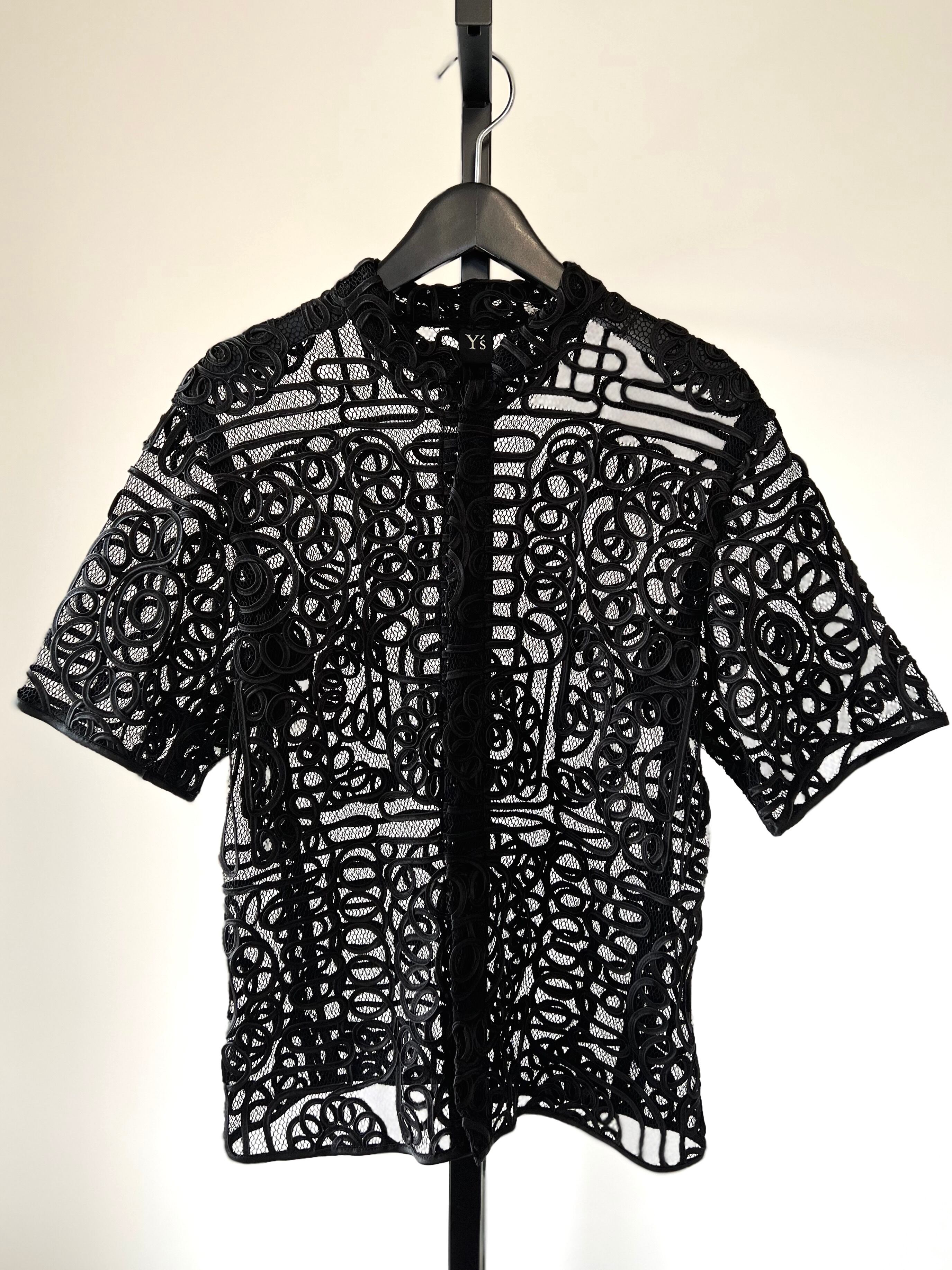 シアーな素材にグルグル刺繍のようなコードデザインが施されたY’sのスタンドカラーシャツ。