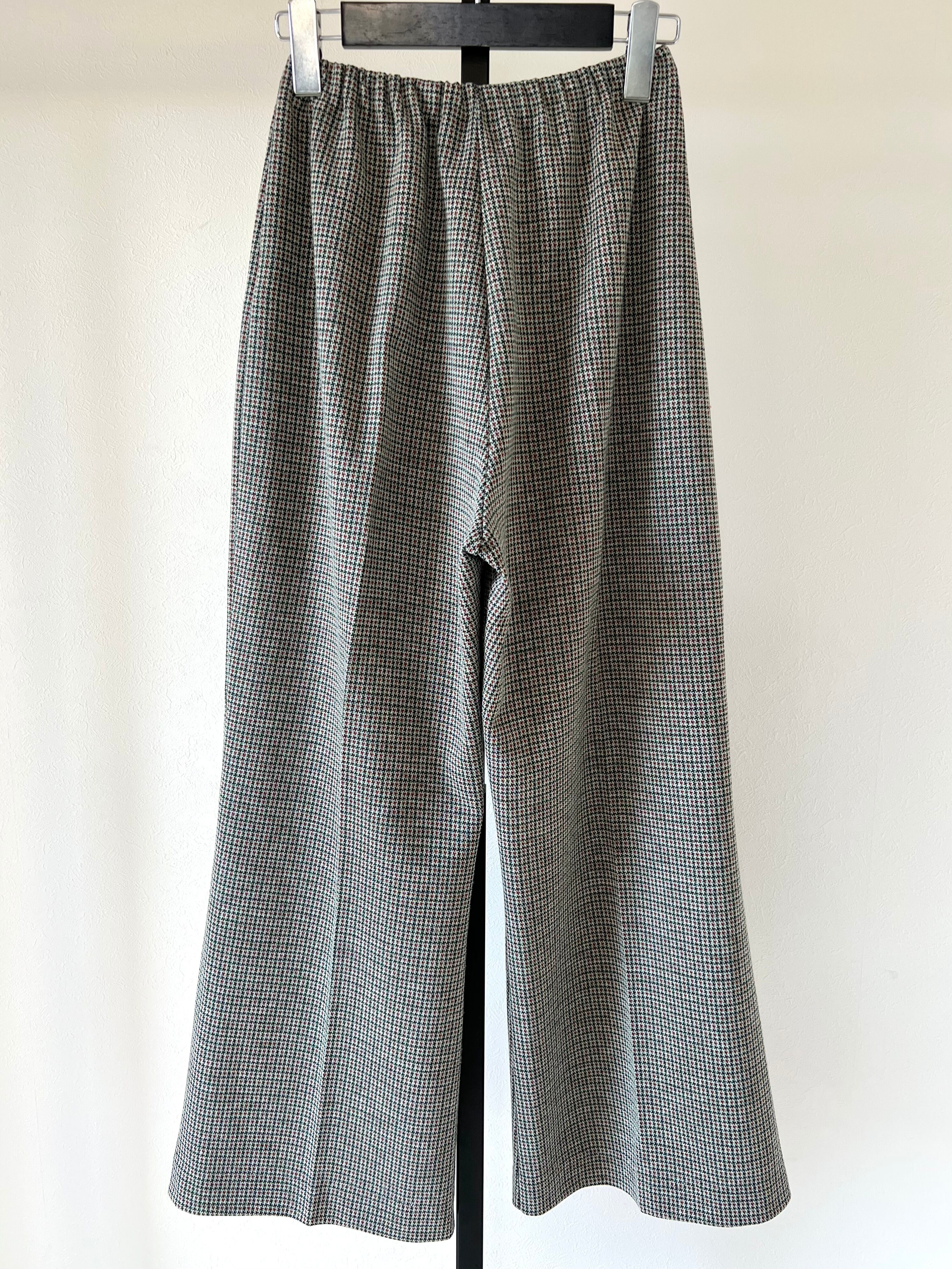 グリーンとエンジ色の組み合わせの千鳥格子チェックのフレアパンツ。