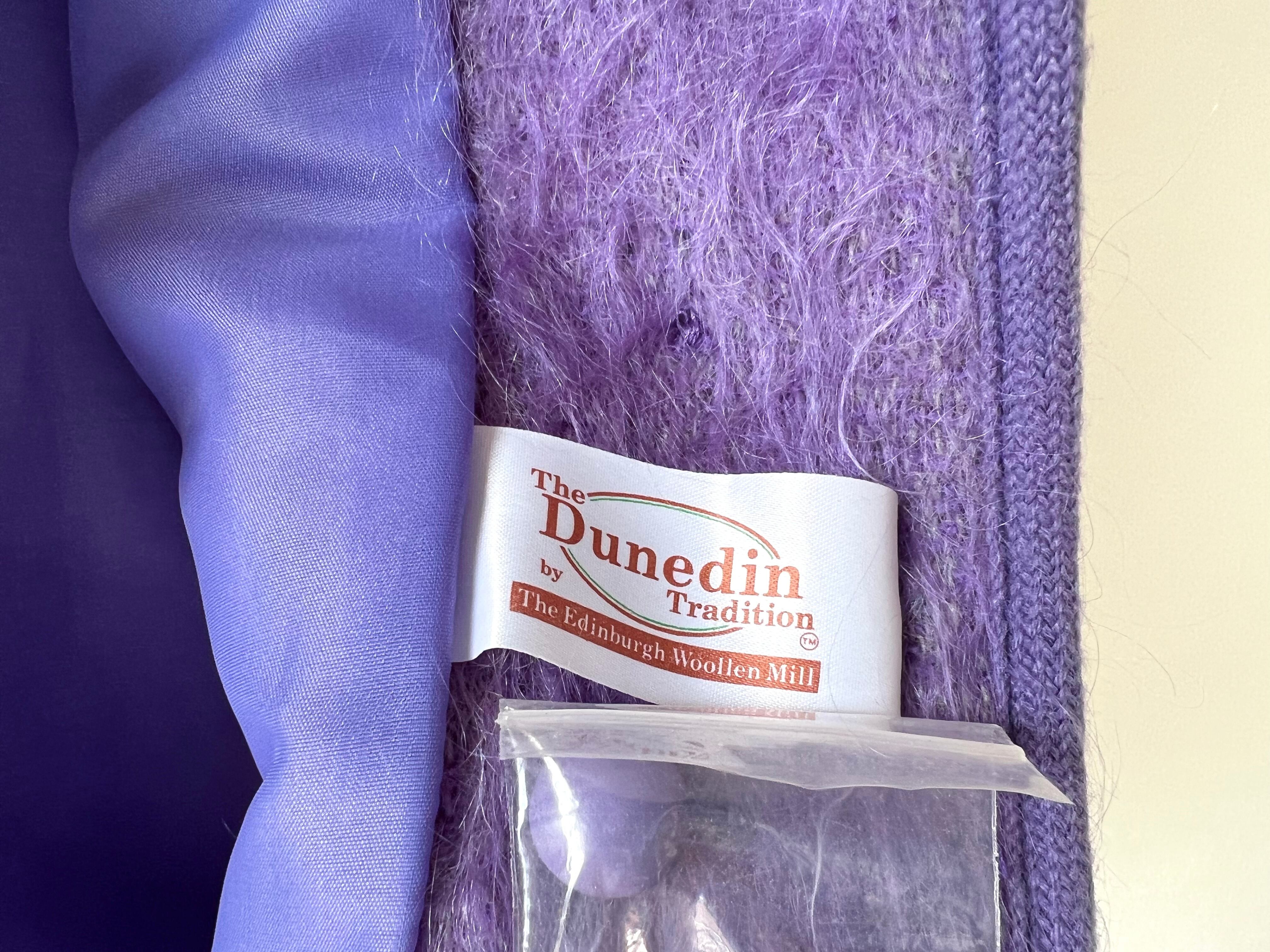 ラベンダーカラーのシャギーモヘアが可愛いブリティッシュメイドのノーカラーニットジャケット。