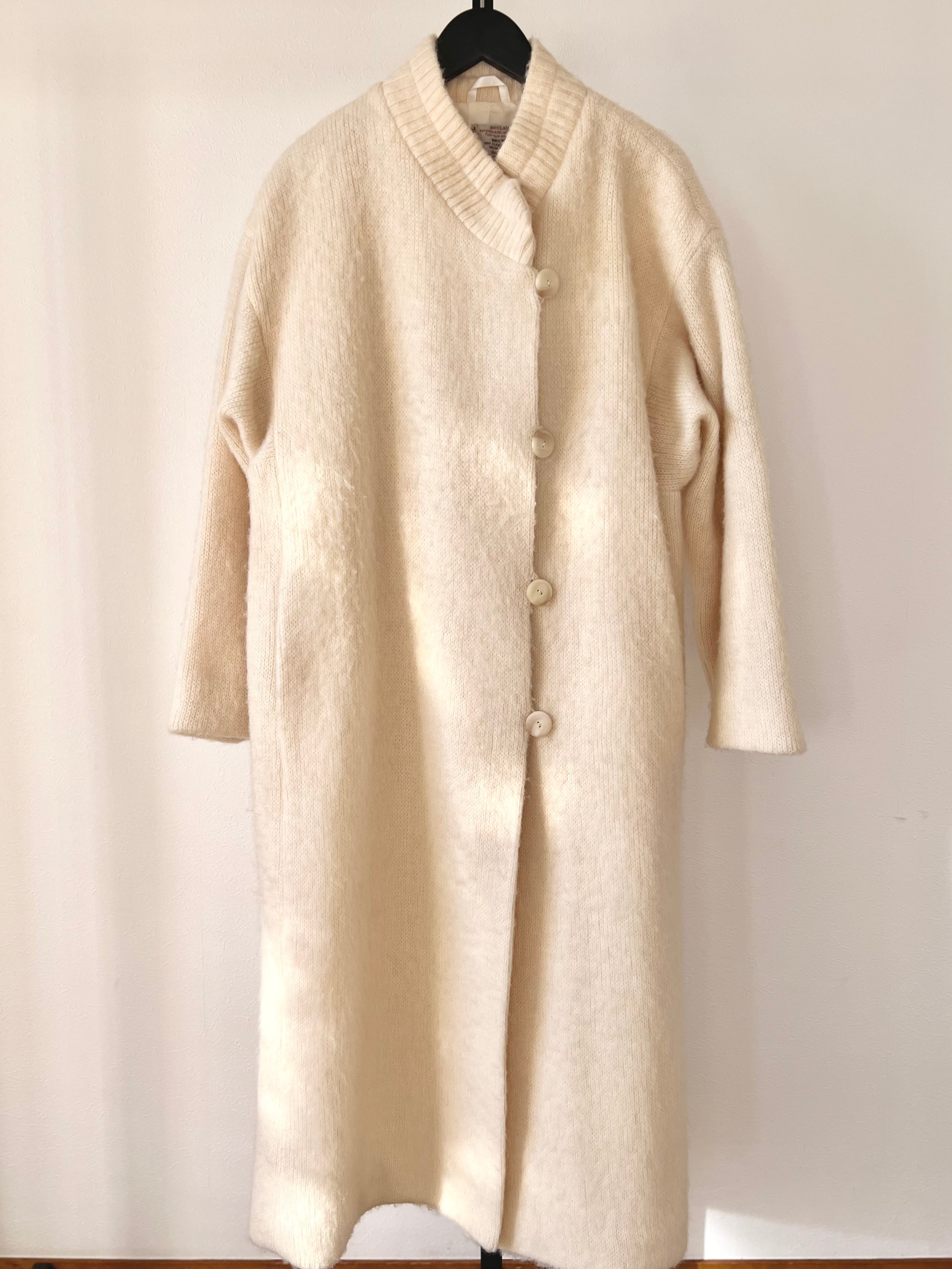 ふわふわとした毛足のあるニット編みの70'sウールニットロングコート。