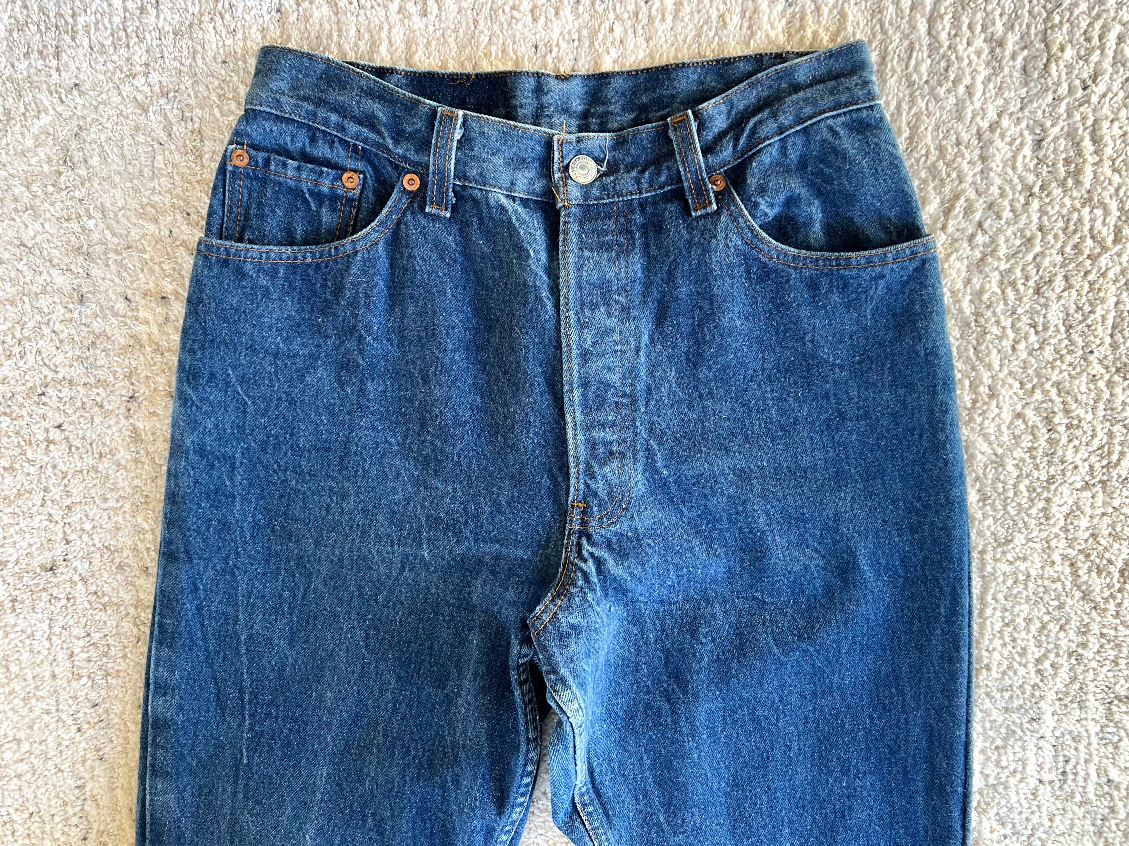 縦に入ったセンターの色落ちもかっこよく、通常の501より6つとボタンフライが一つ多くハイウエストに。