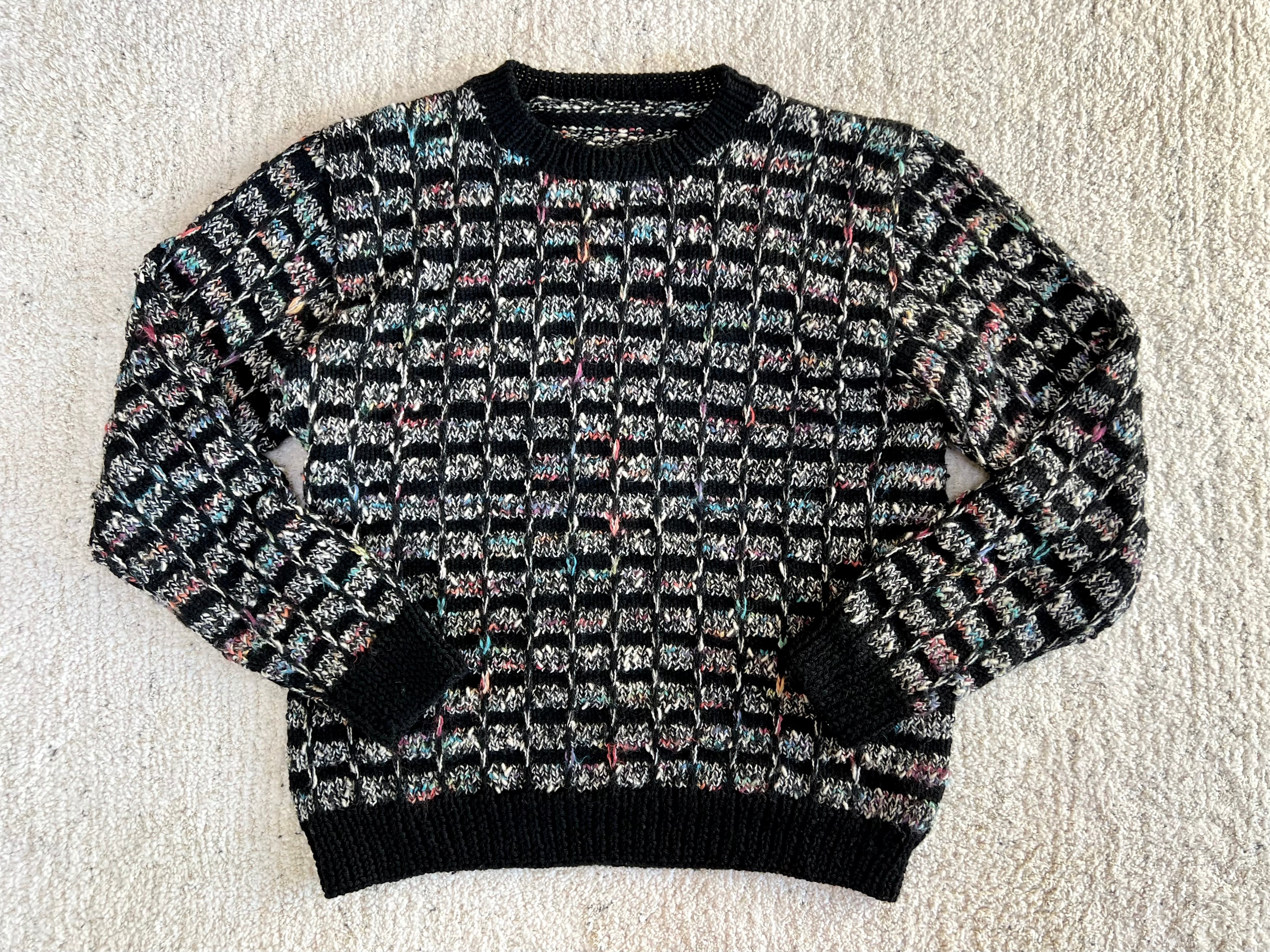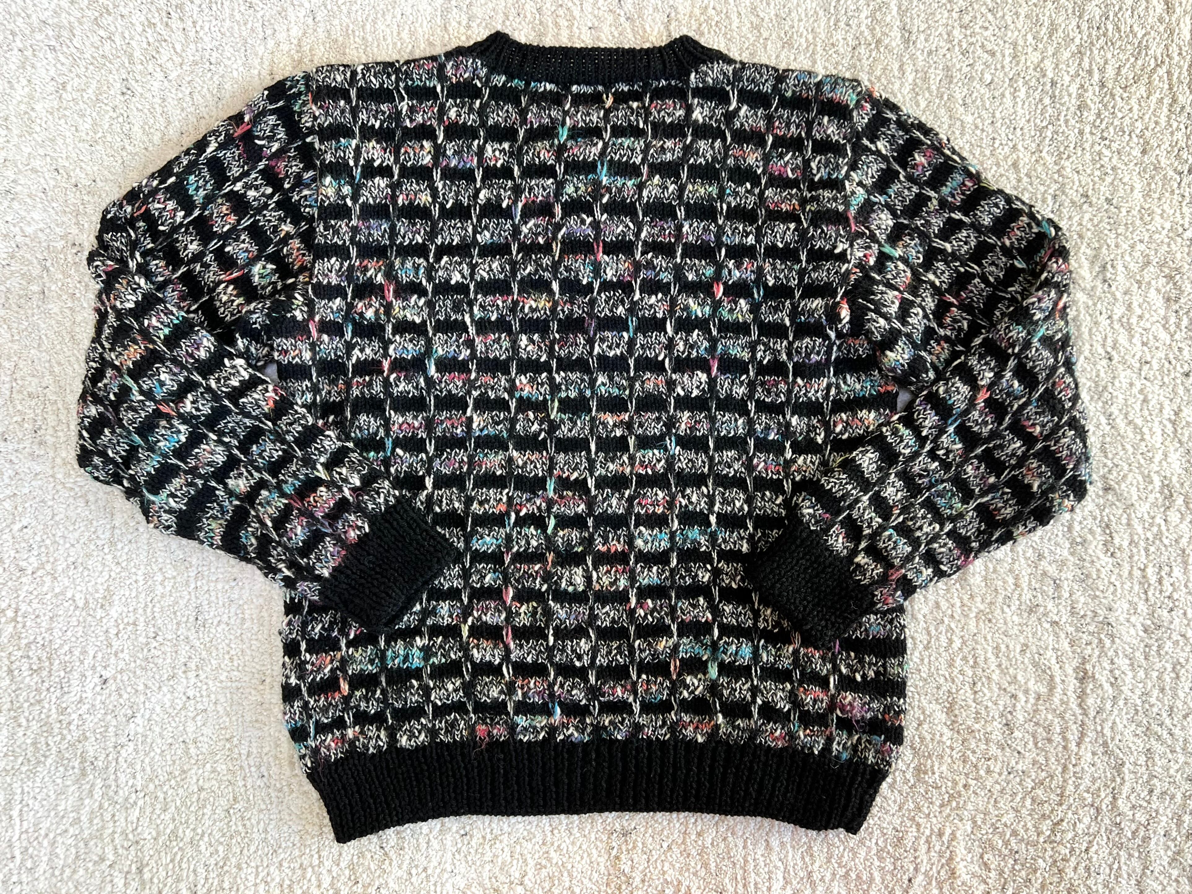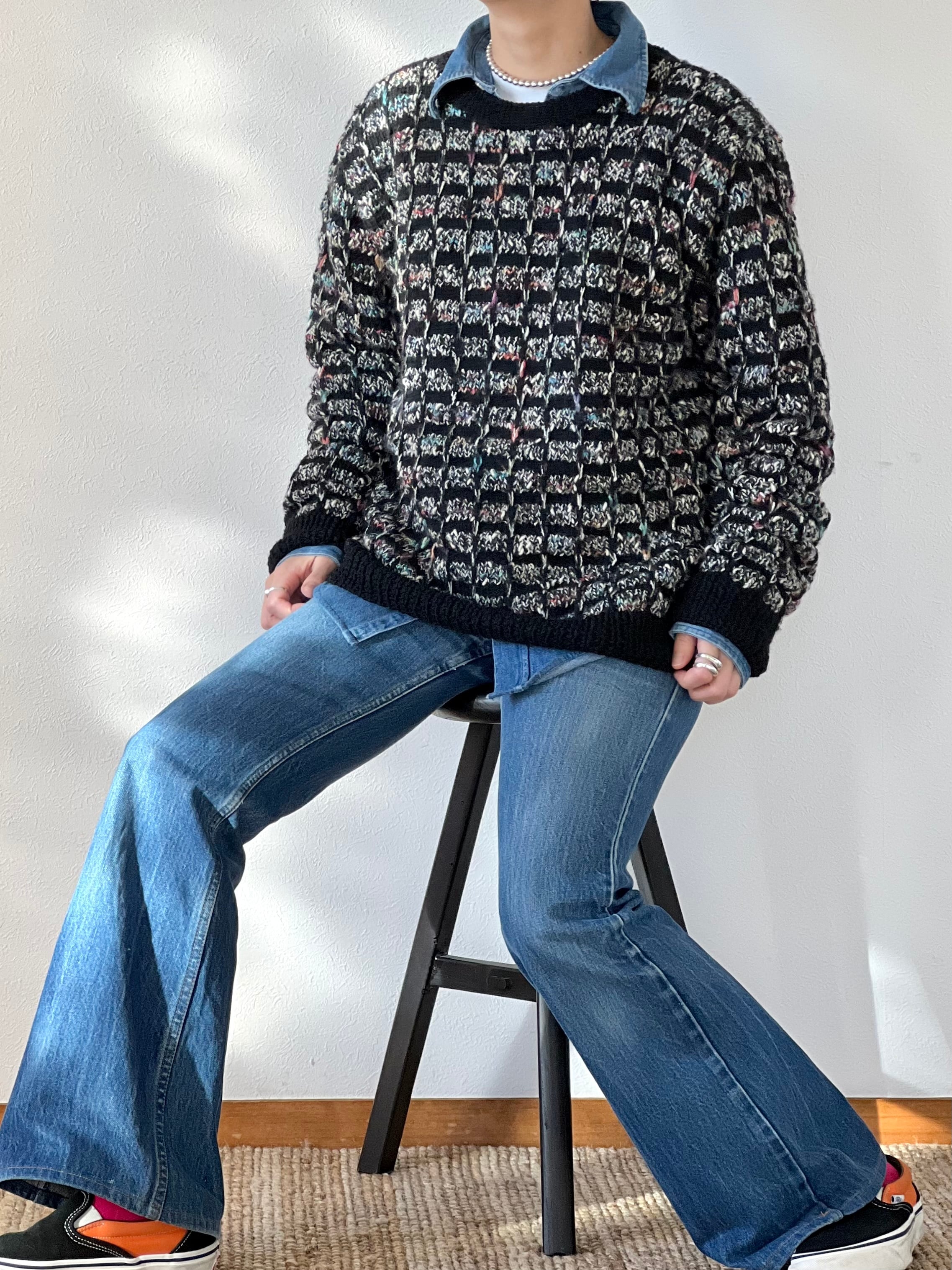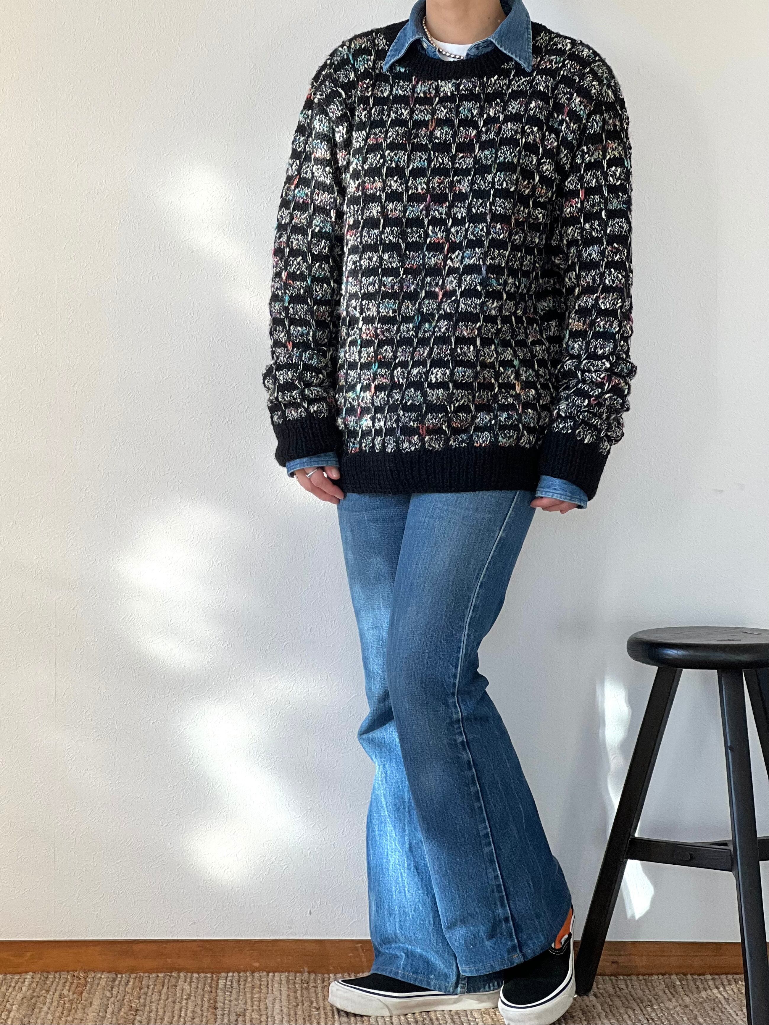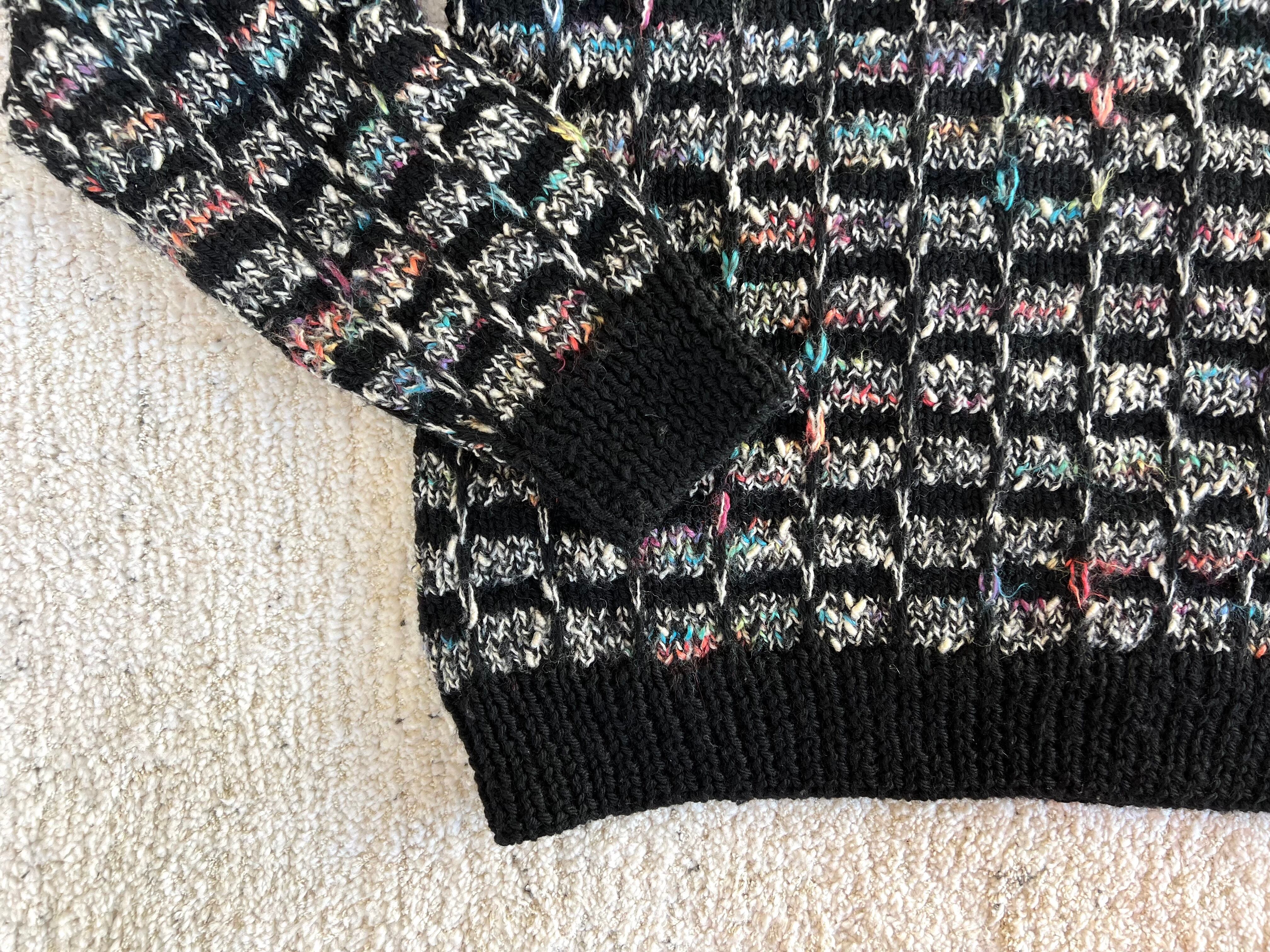 黒と白をベースにカラフルな糸がミックスされたチェック柄ニット。