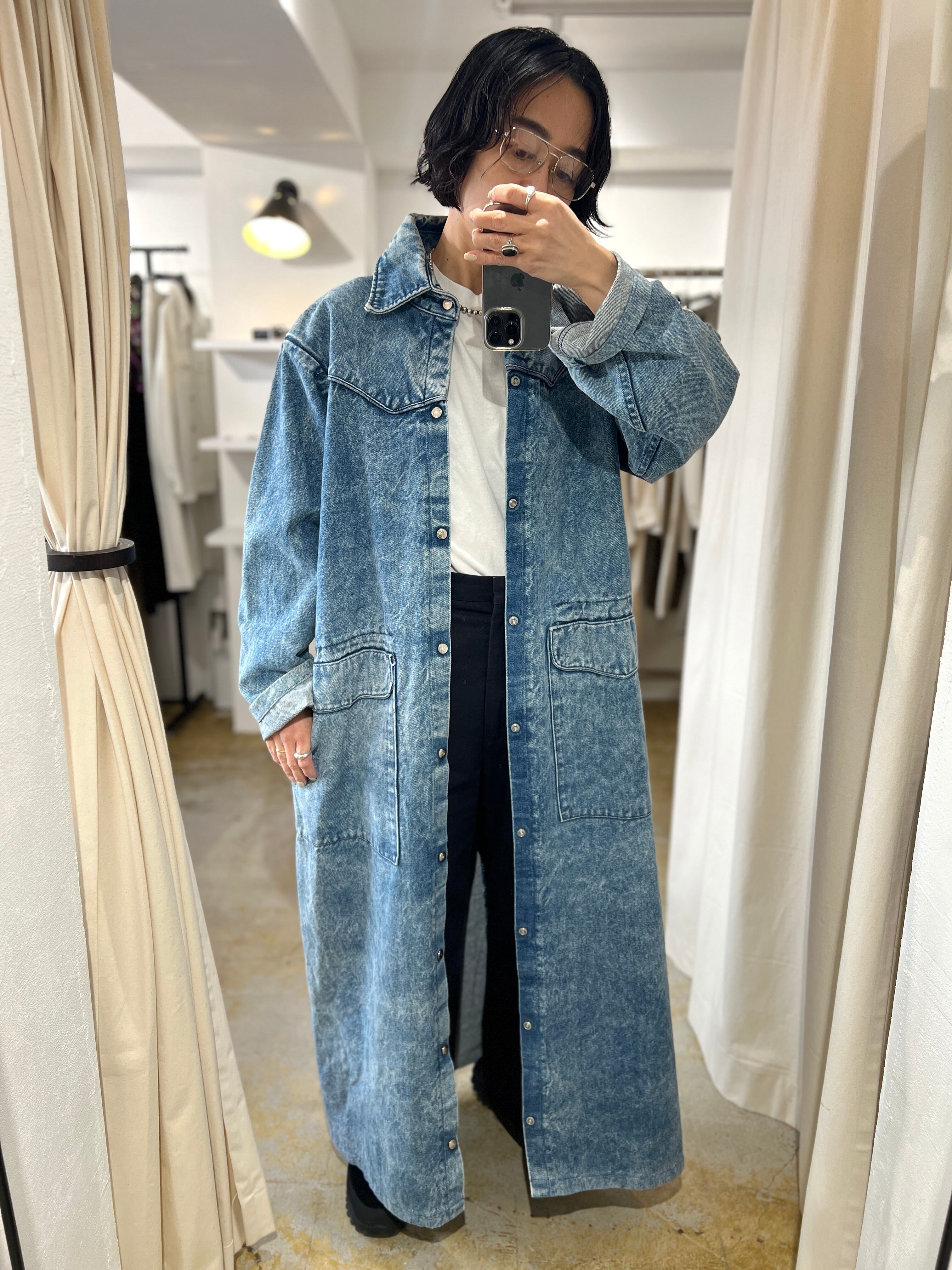 ウエスタンのような切り替えにビッグポケットのデニムロングコート。