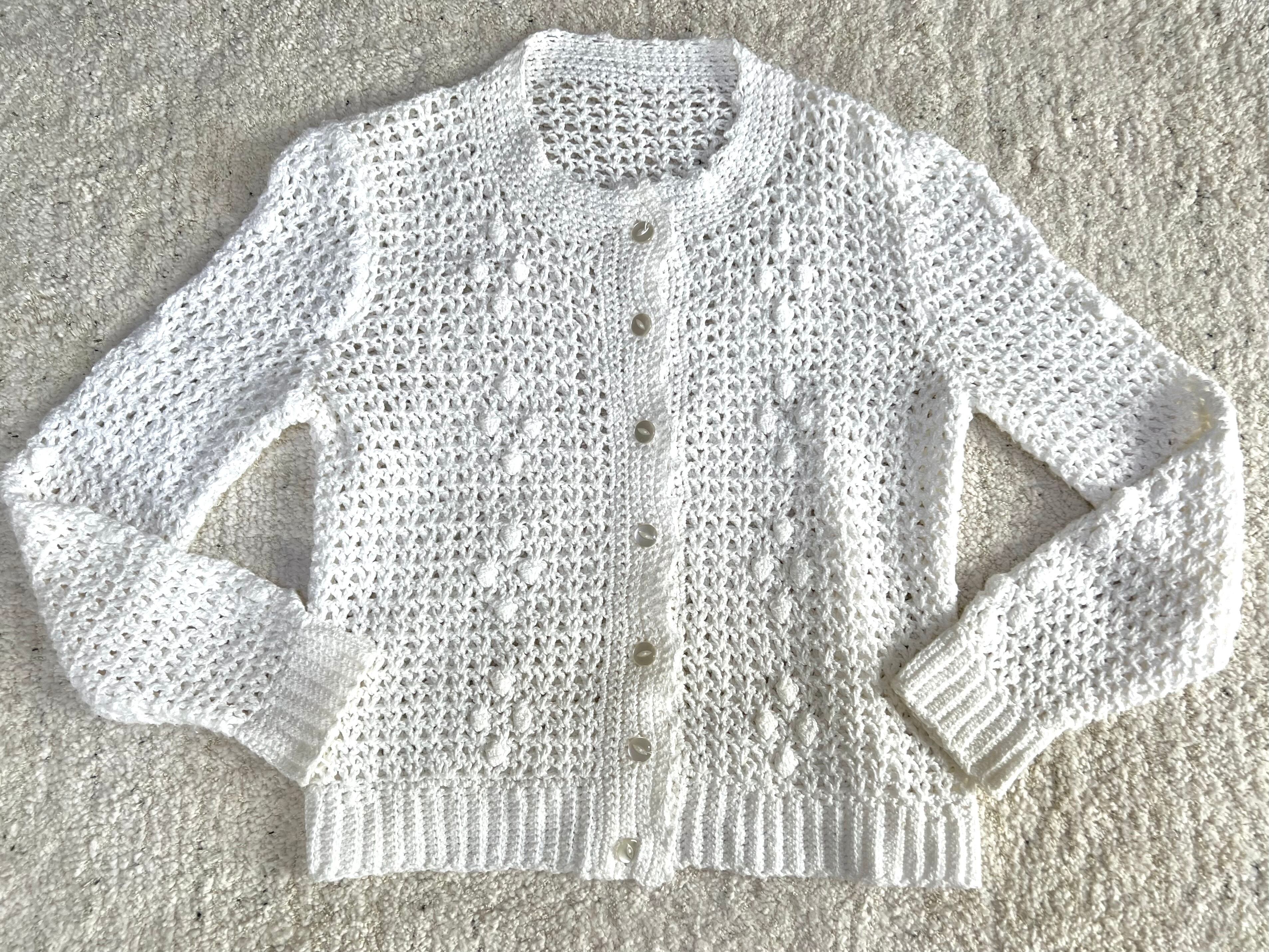 透かし編みにボンボンが可愛いハンドクロシェットのニットカーディガン。