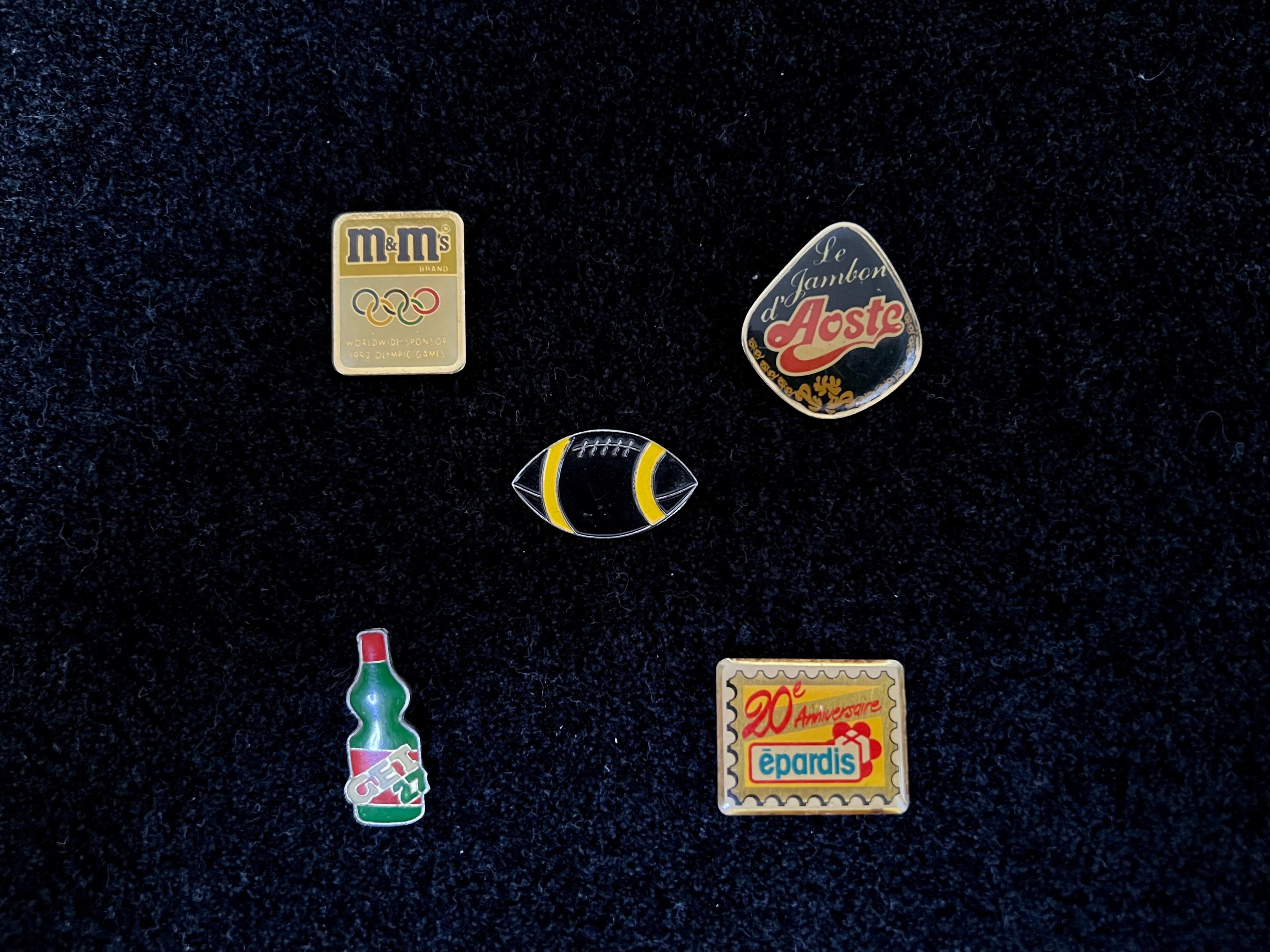 企業やオリンピックにドリンクなど遊びのあるモチーフのヴィンテージピンズ5つセット。