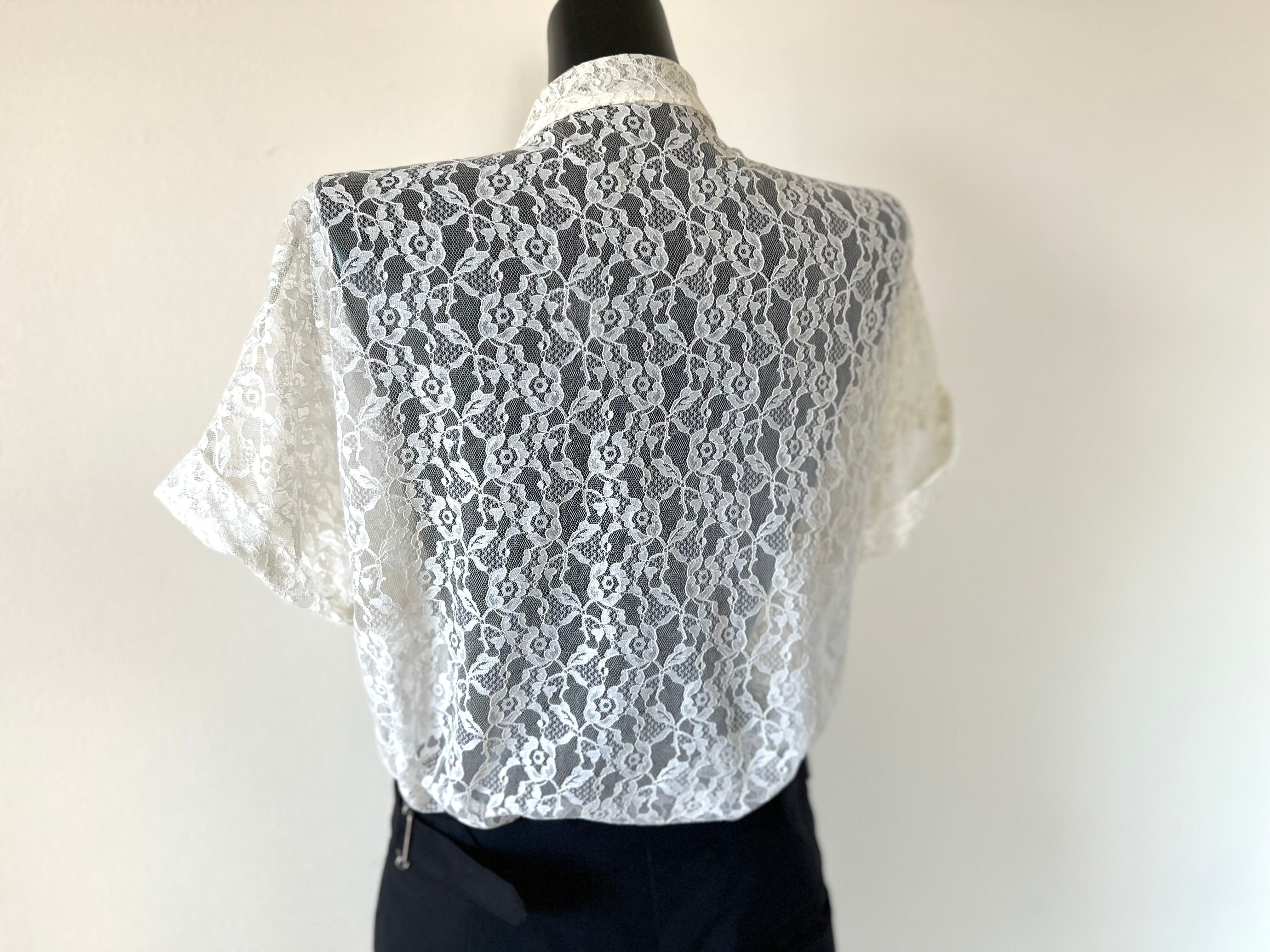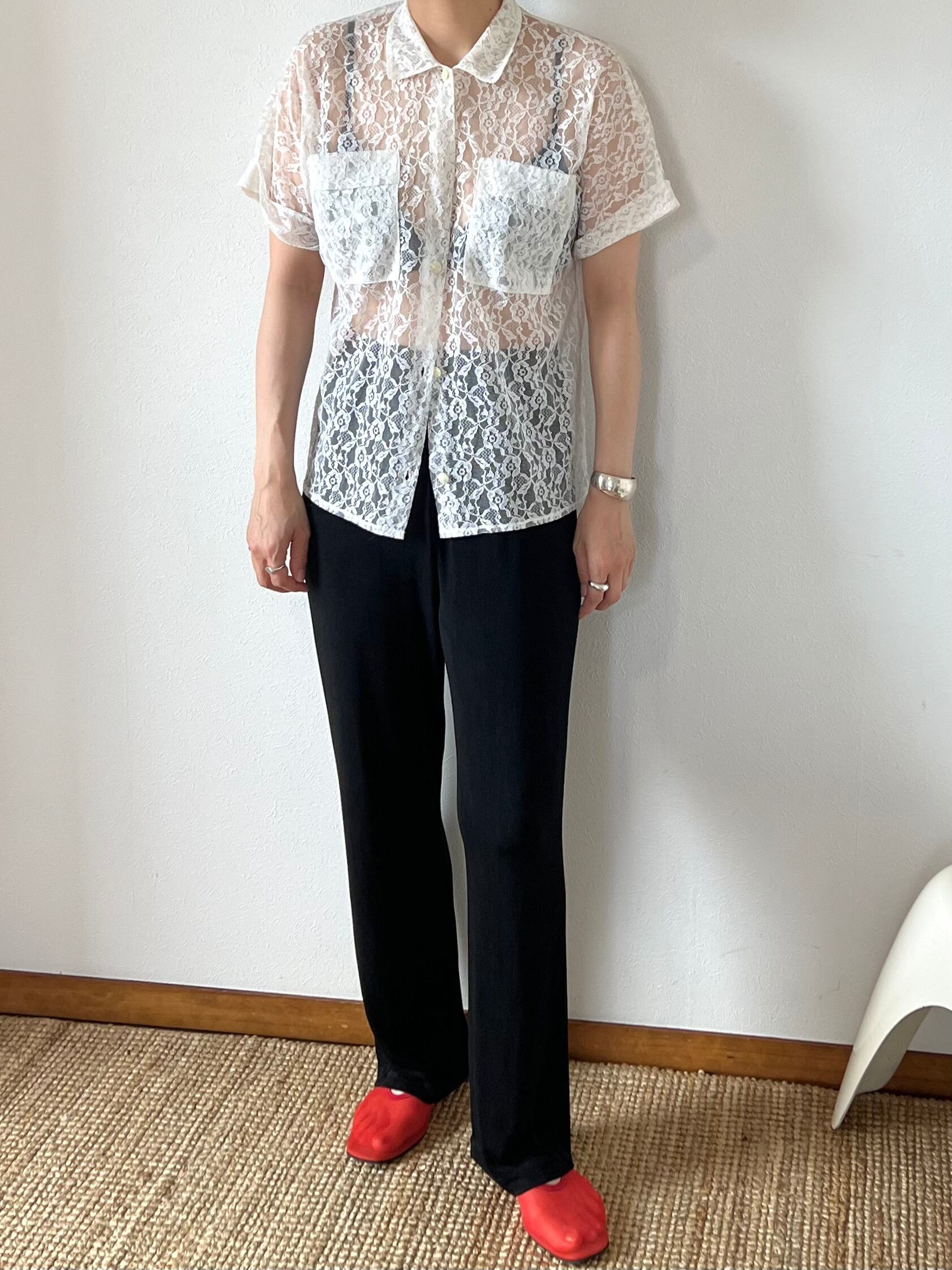 大きめのポケットのついたドルマンスリーブの総レースブラウス。