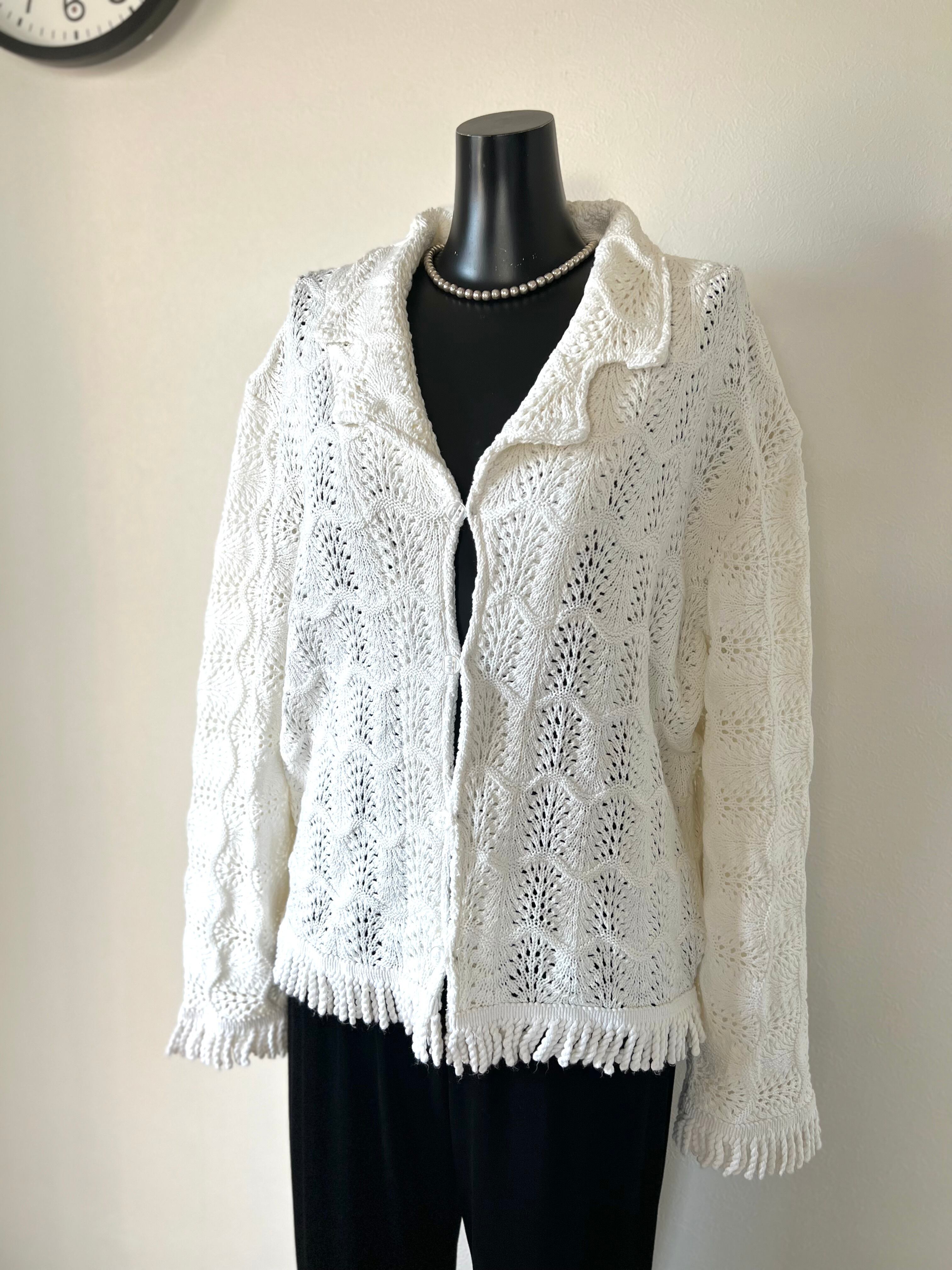裾にフリンジがプラスされたクロシェットでも甘すぎず特別感のあるデザイン。