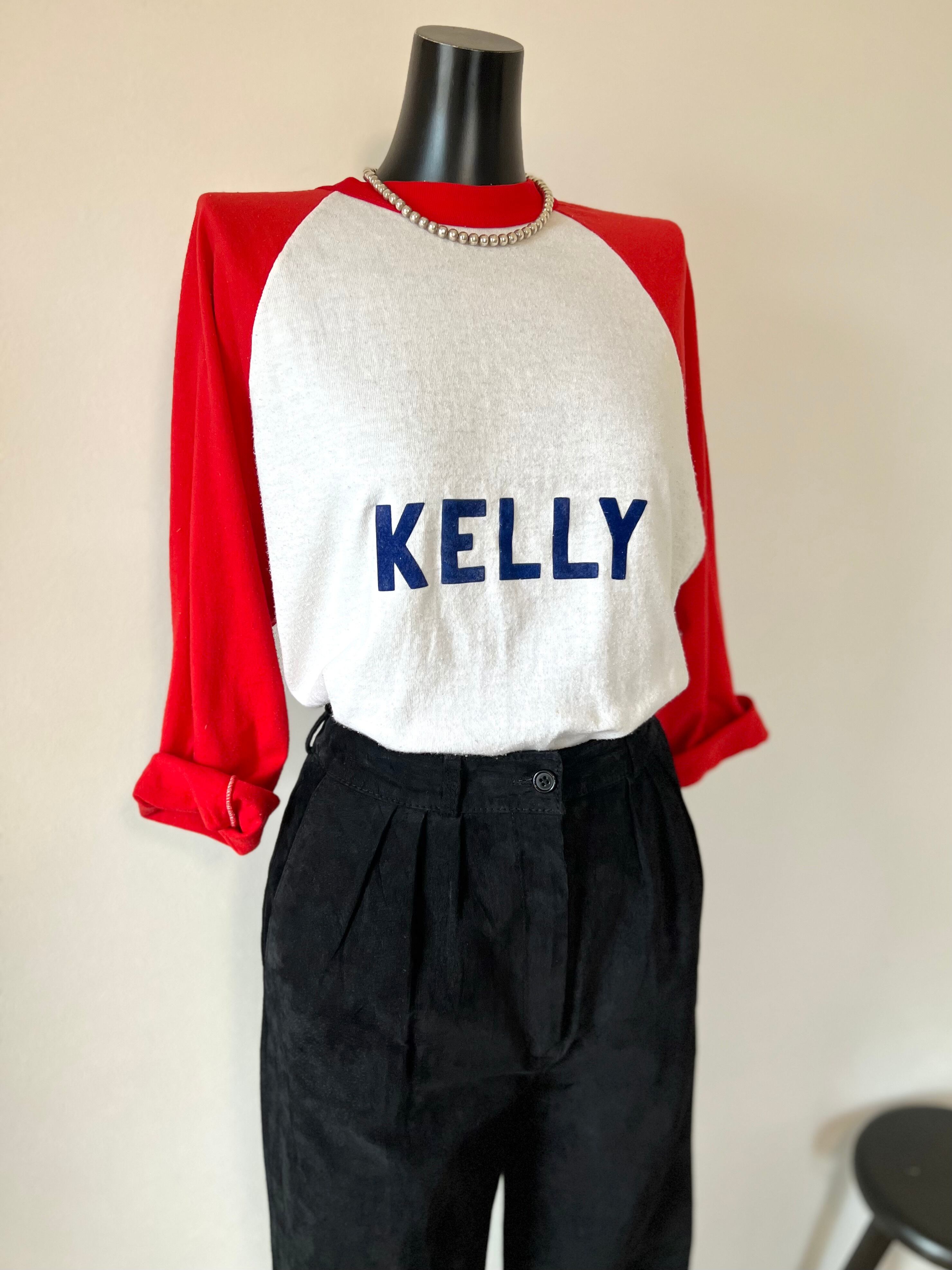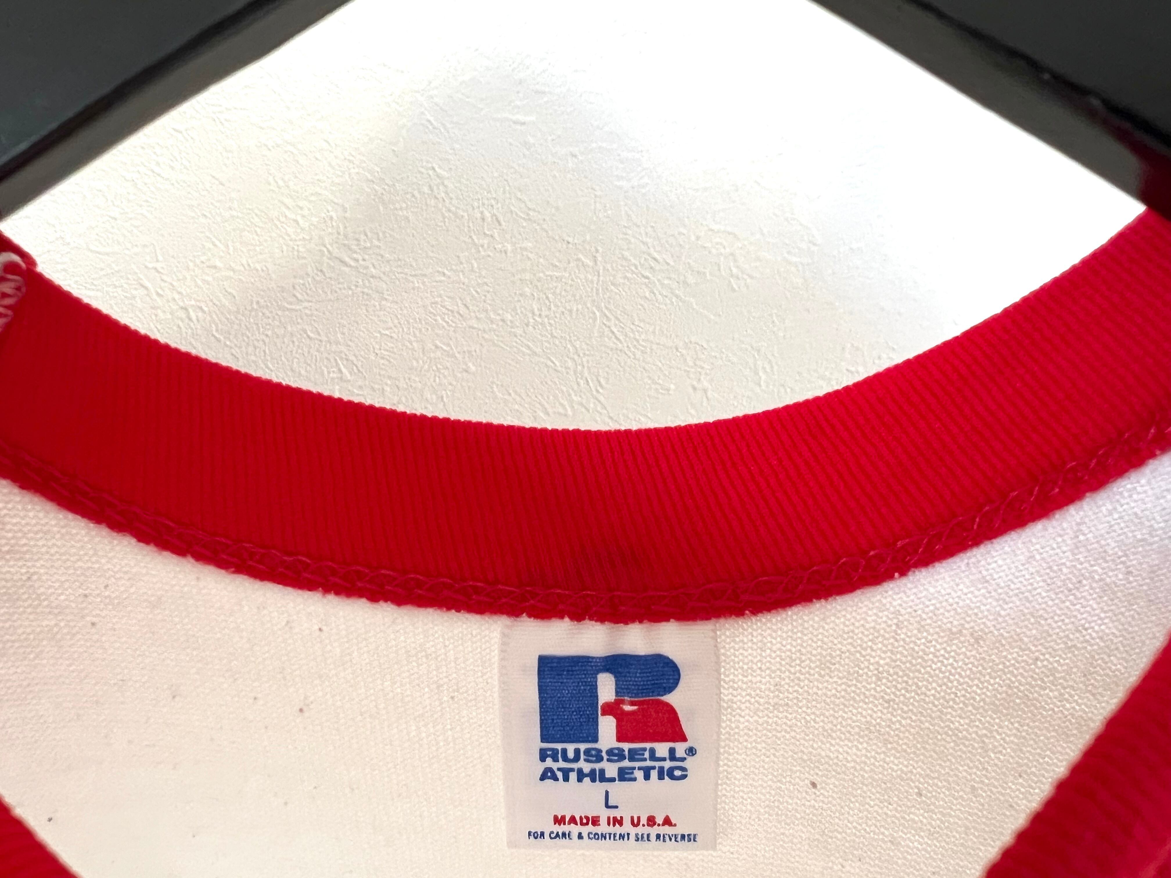 アメリカらしい赤に青のプロッキープリントが可愛い80年代のUSA製RUSSELLラグランスリーブTシャツ。